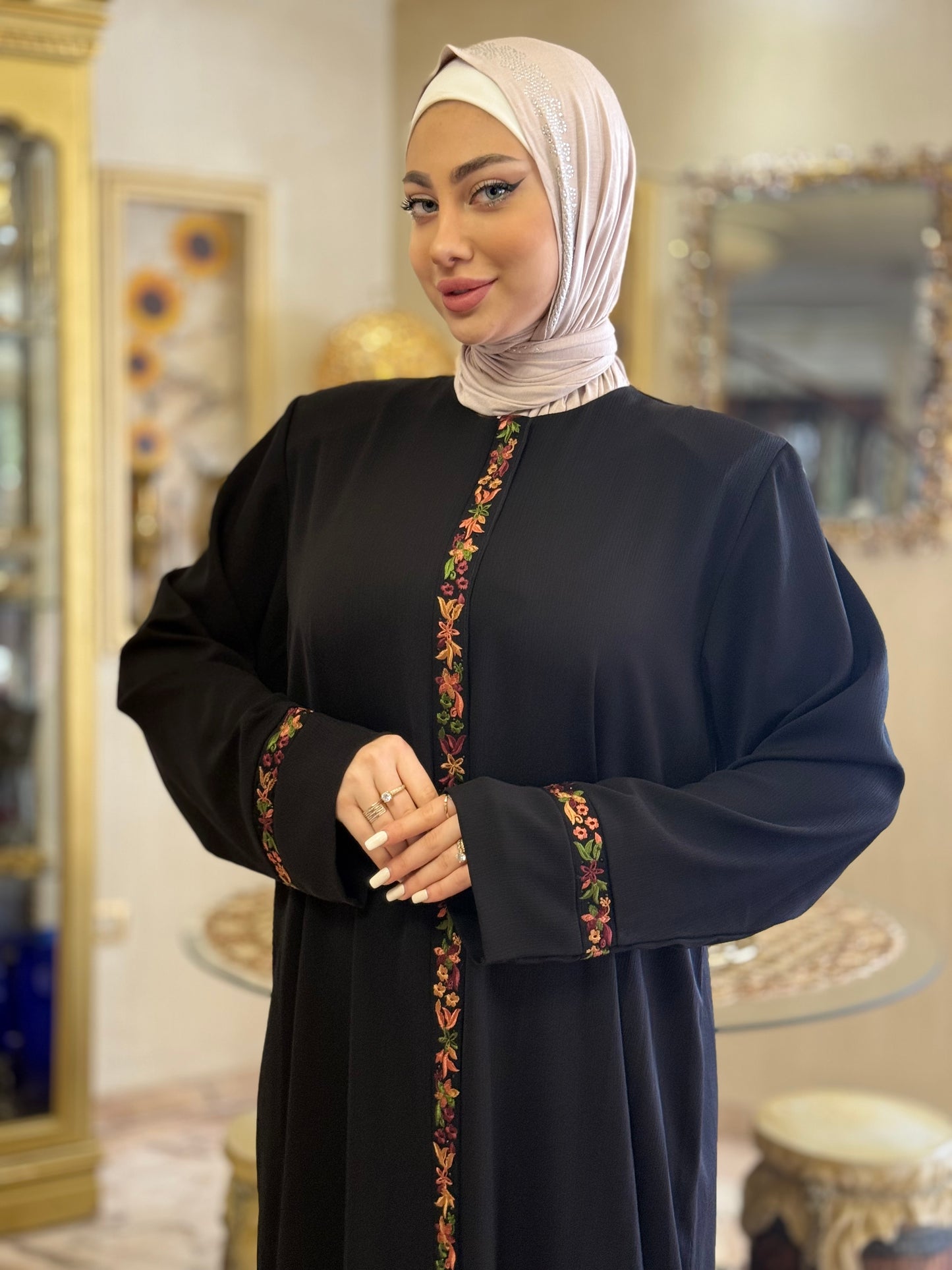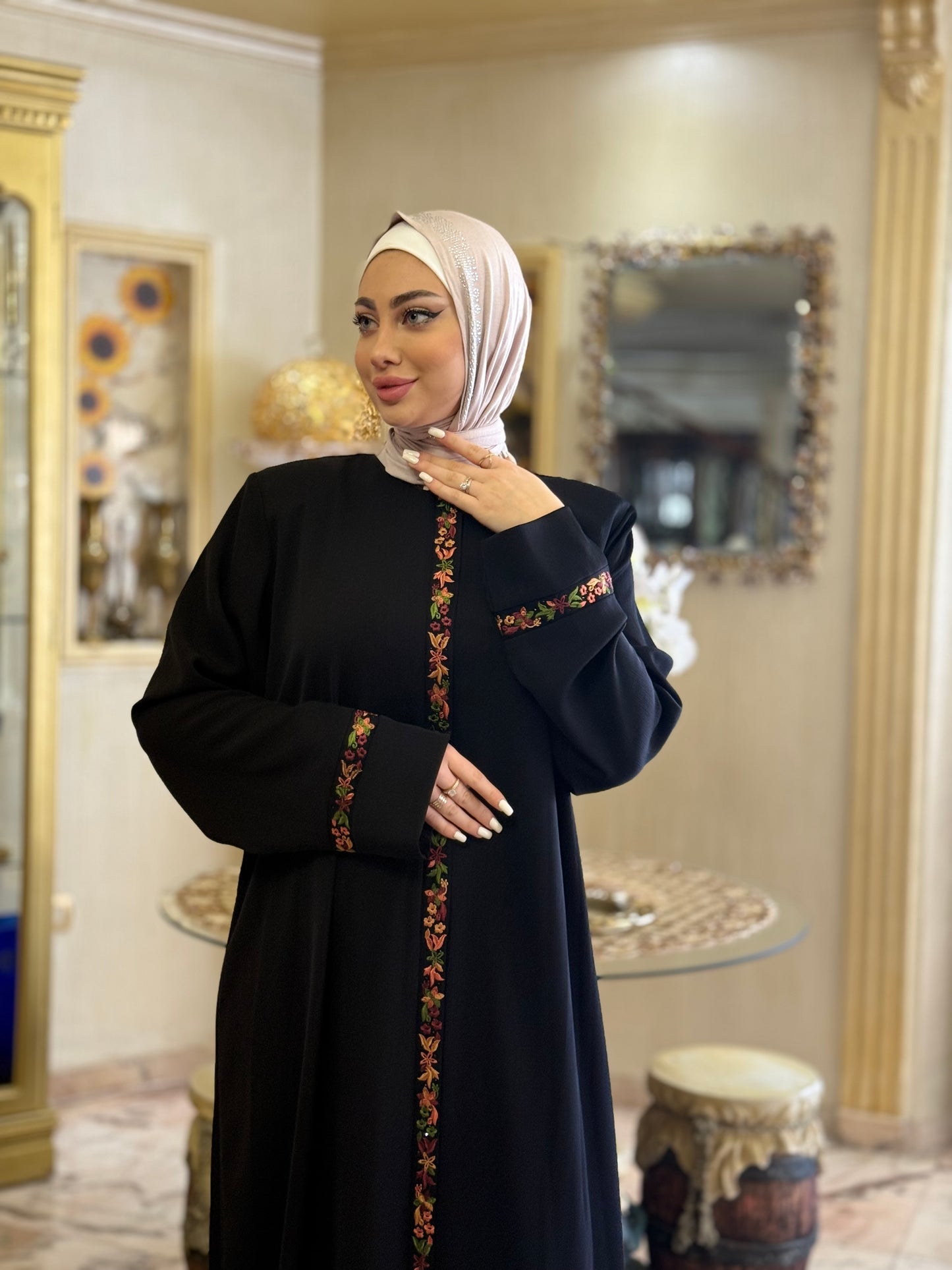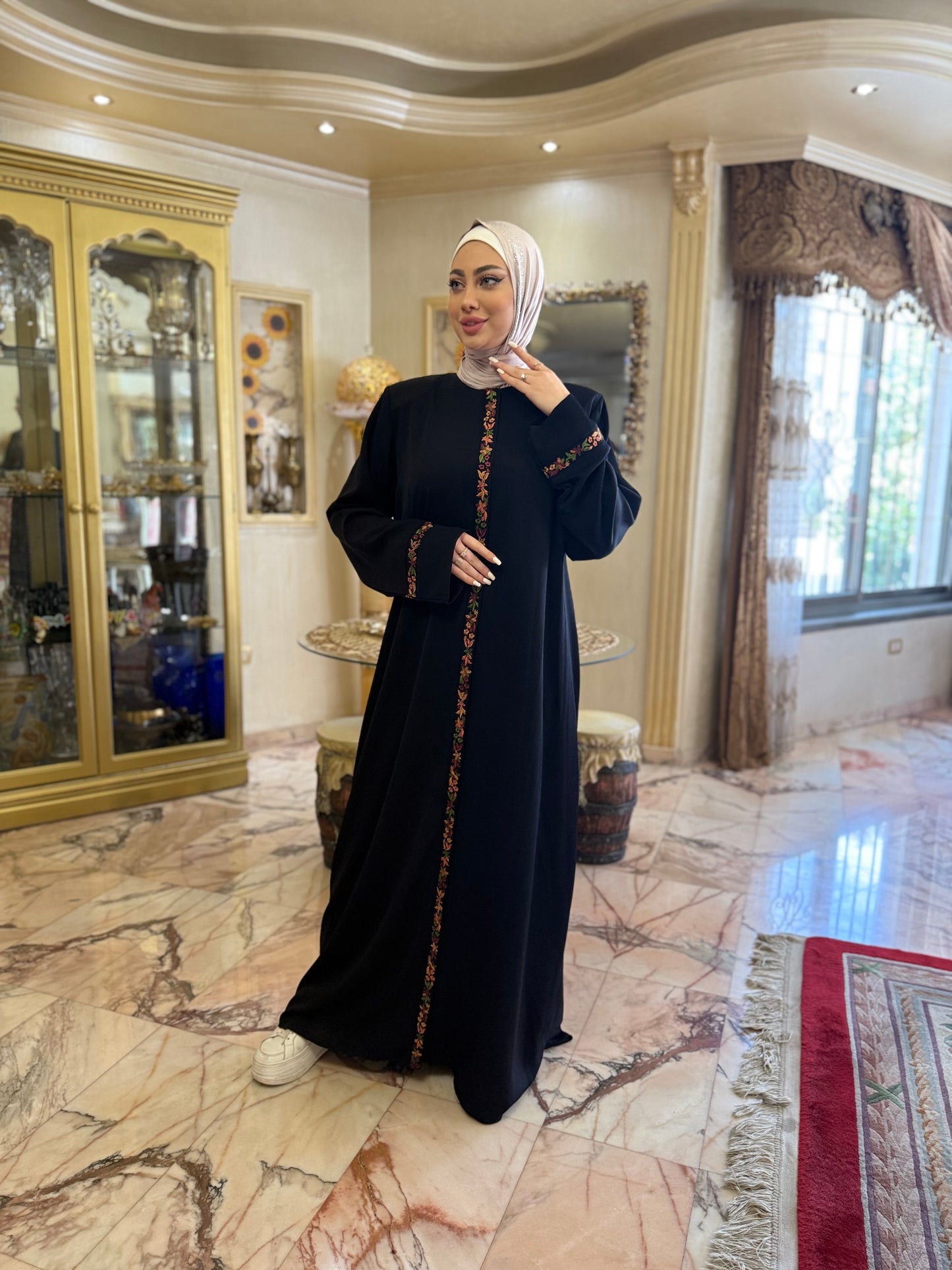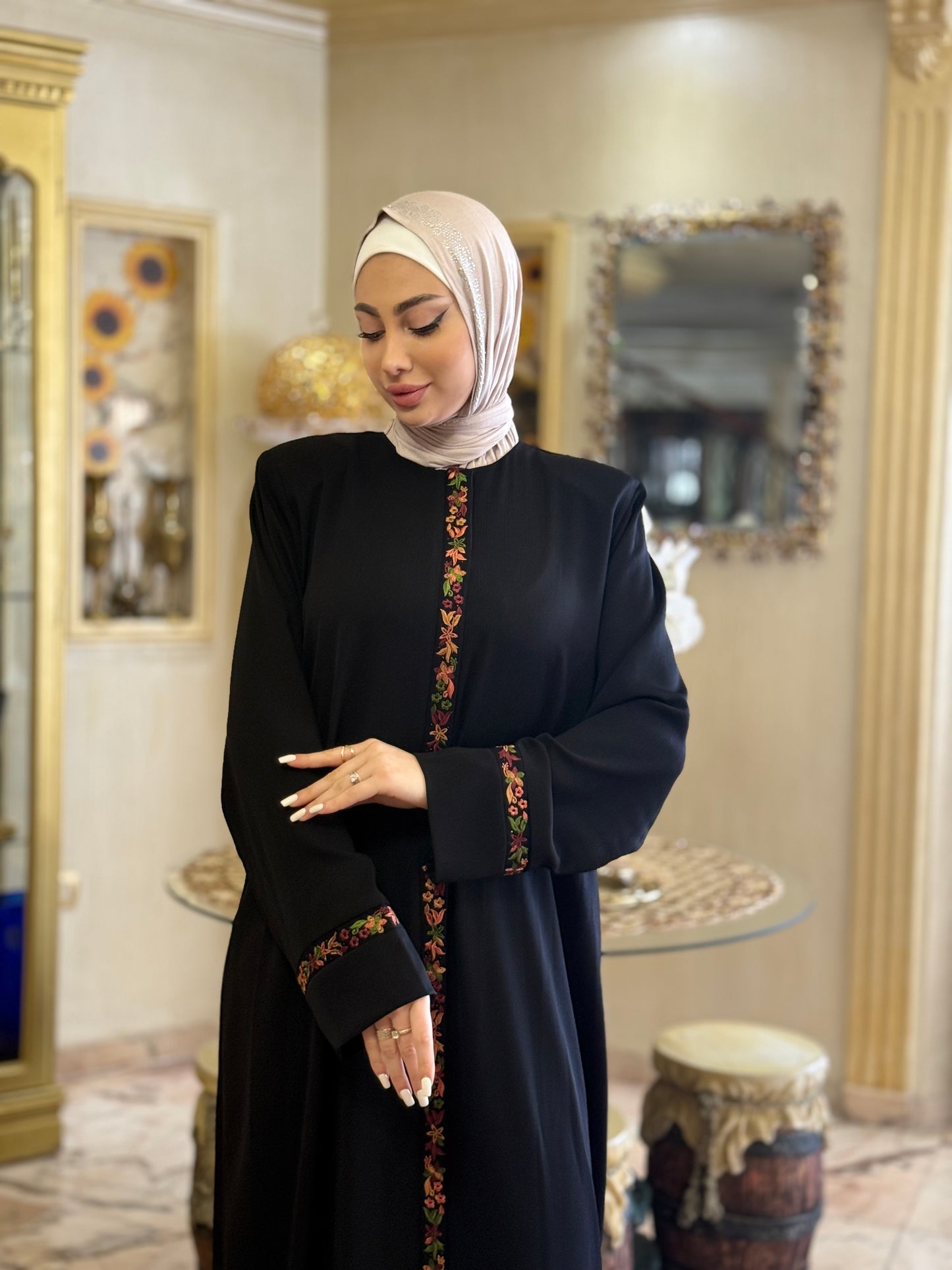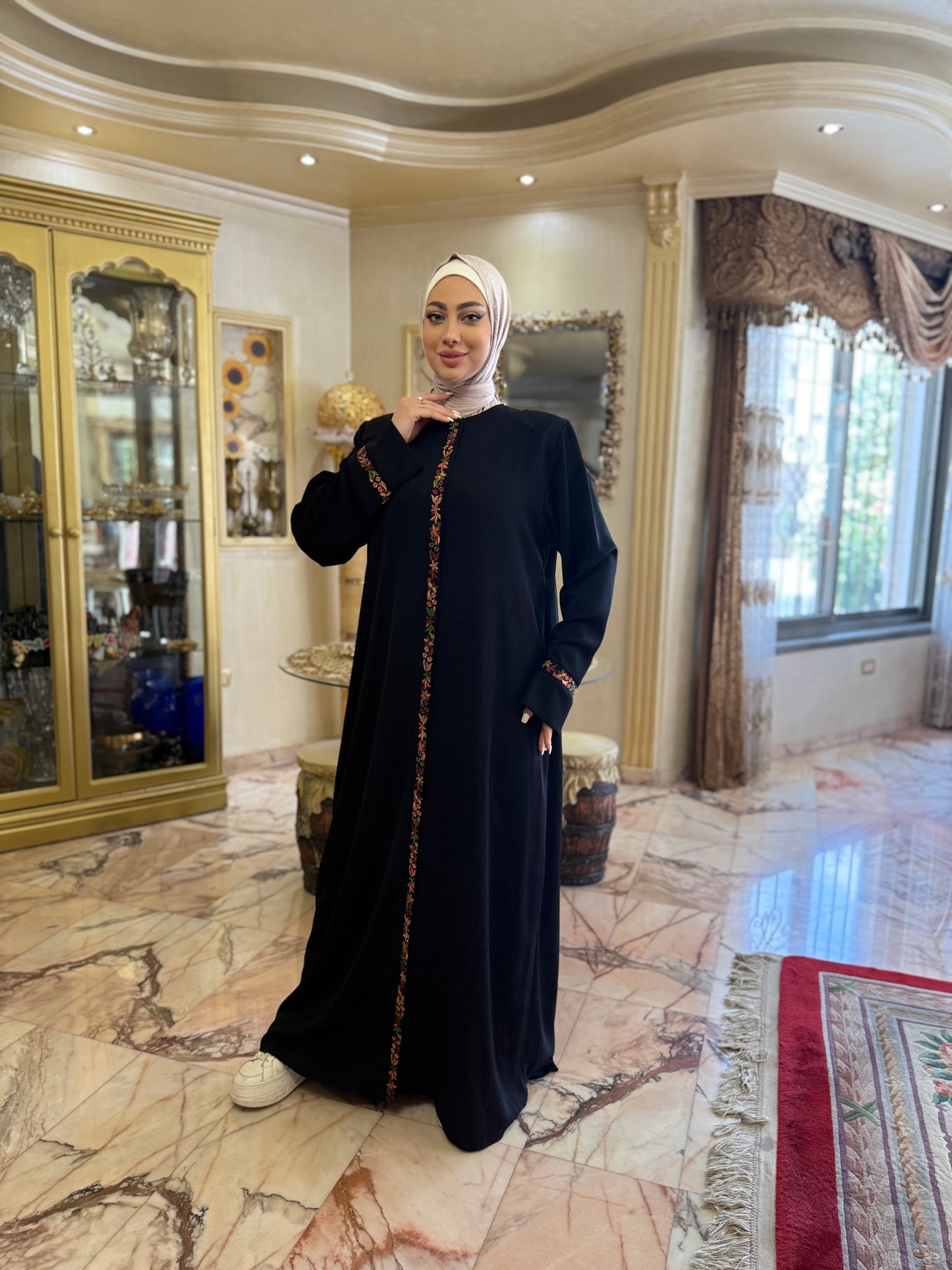 اكتشفي تشكيلة الكرم قادري الواسعة من الجلابيب والعباءات العصرية الفخمة والأنيقة لتتألقي بهذه العباءة الأنيقة من قماش الزووم المزينة بتفاصيل أنيقة وعصرية من التطريز من الأمام وعلى الأكمام، صممت وصنعت في الأردن بأفضل أنواع أقمشة الزووم
