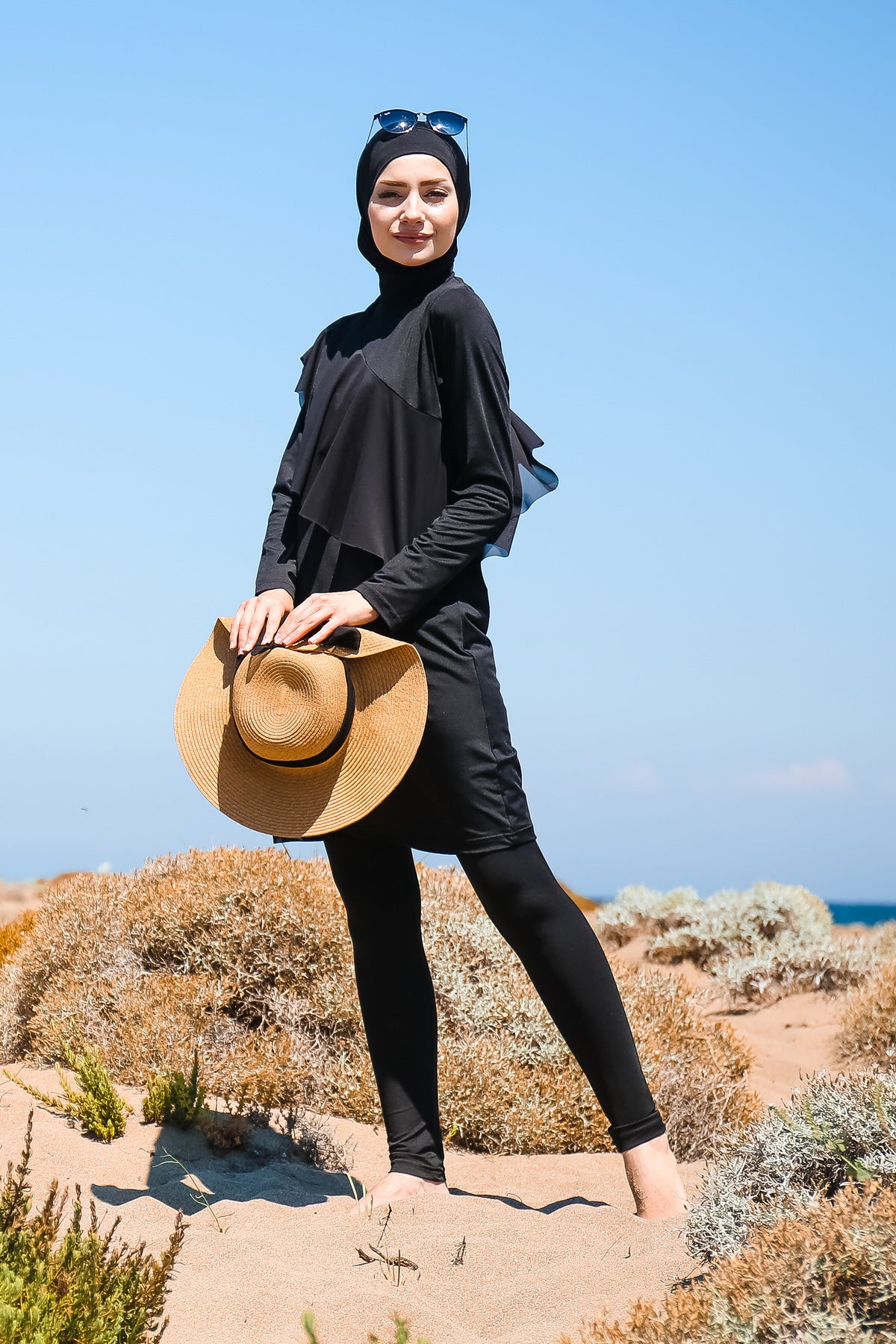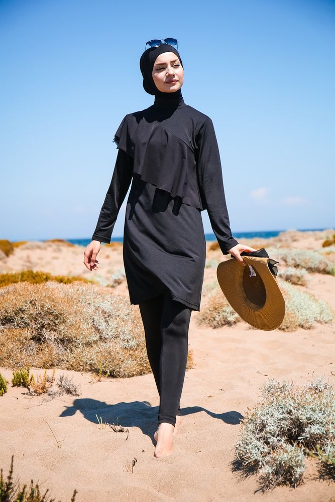 ملابس سباحة مميزة وأنيقة ، تأتي بأربع قطع ، وهي غطاء للرأس وبنطال وبدي وسترة مقاومة للماء .
