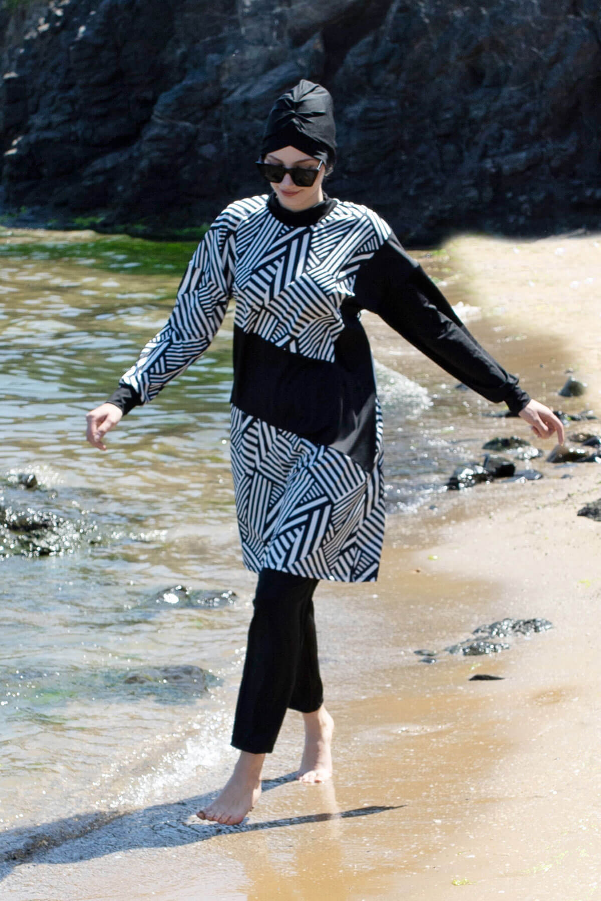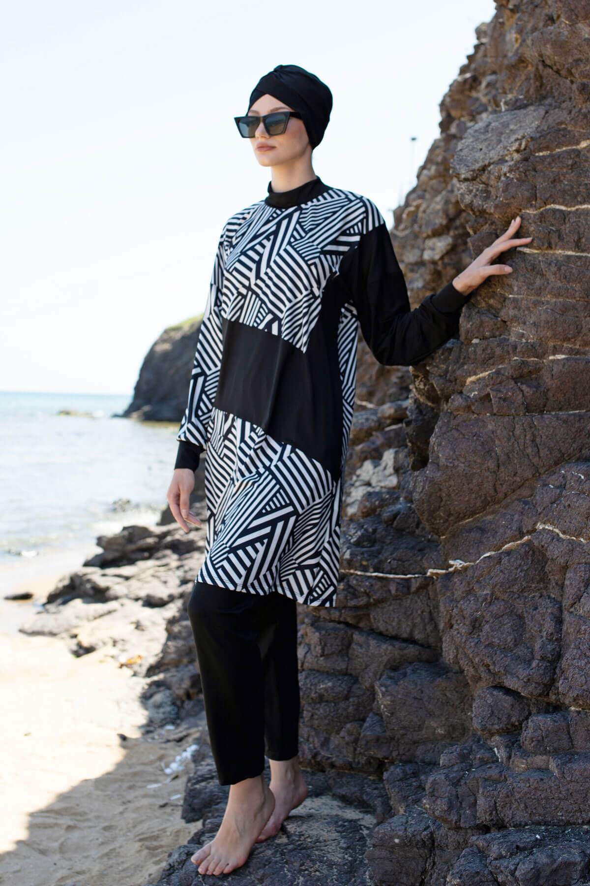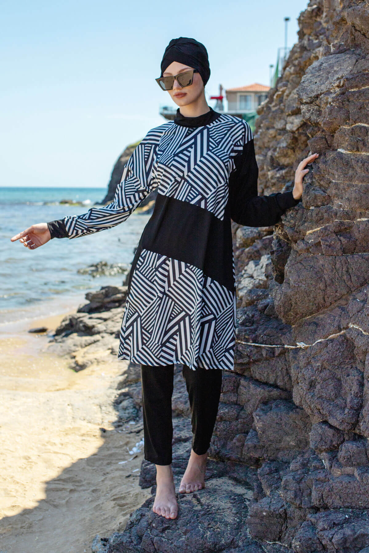 ملابس سباحة مميزة وأنيقة ، تأتي بأربع قطع ، وهي غطاء للرأس وبنطال وبدي وسترة مقاومة للماء .