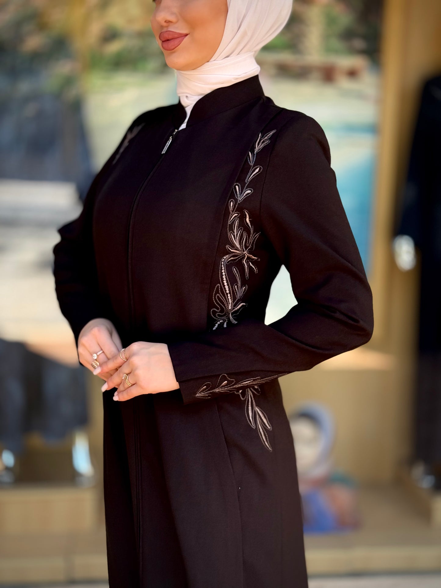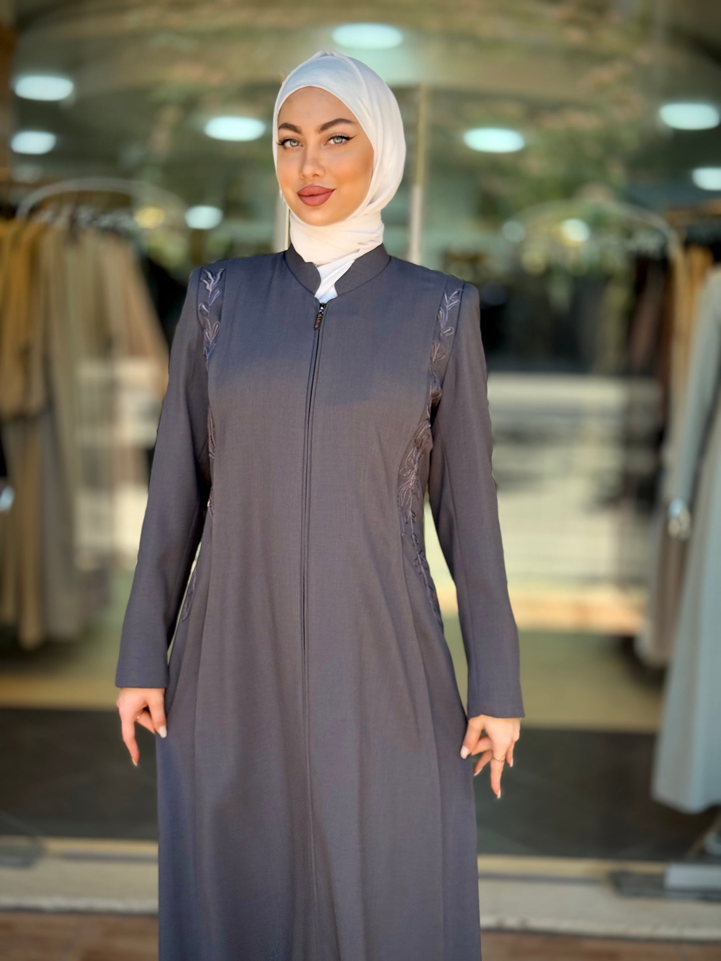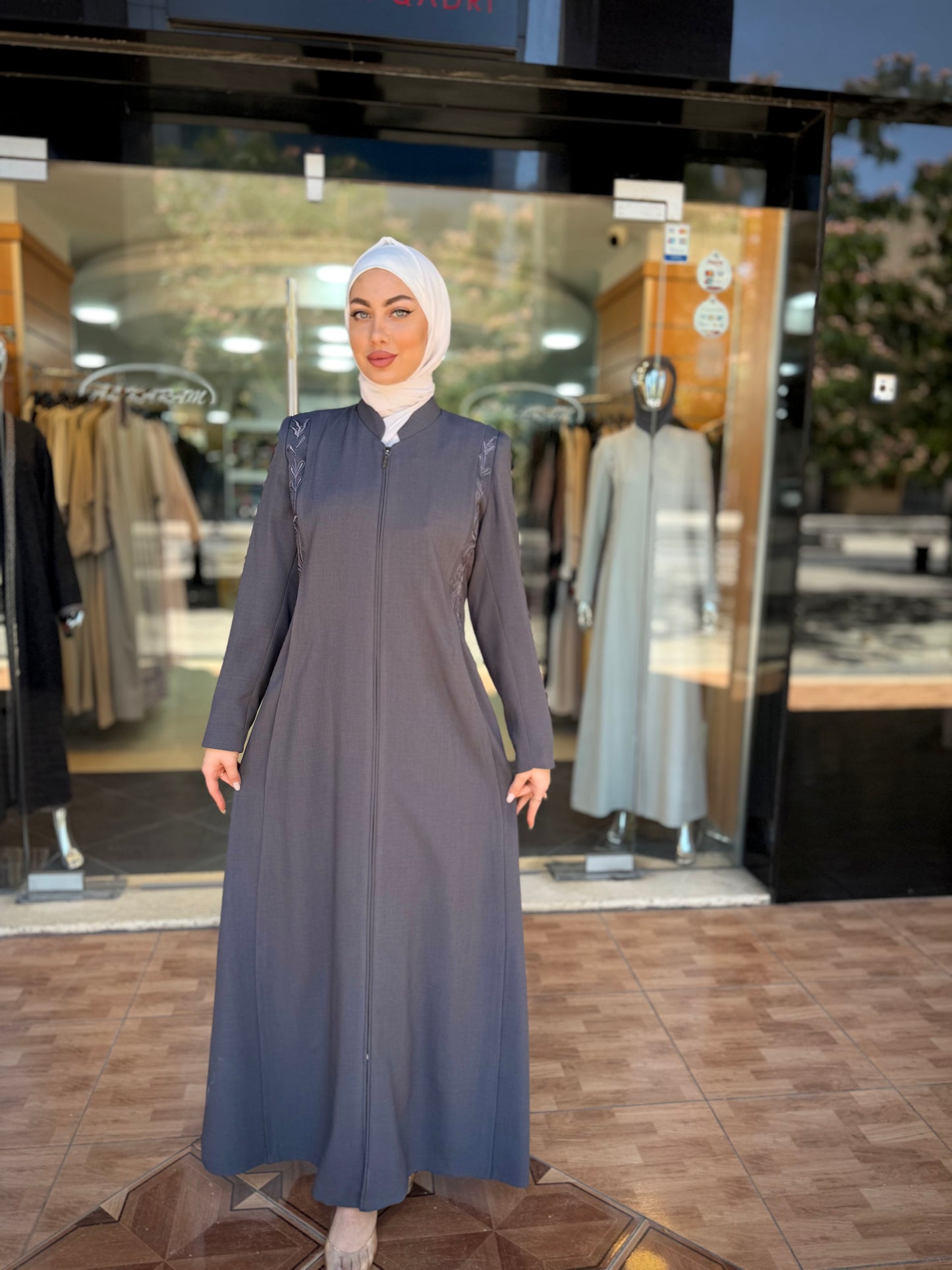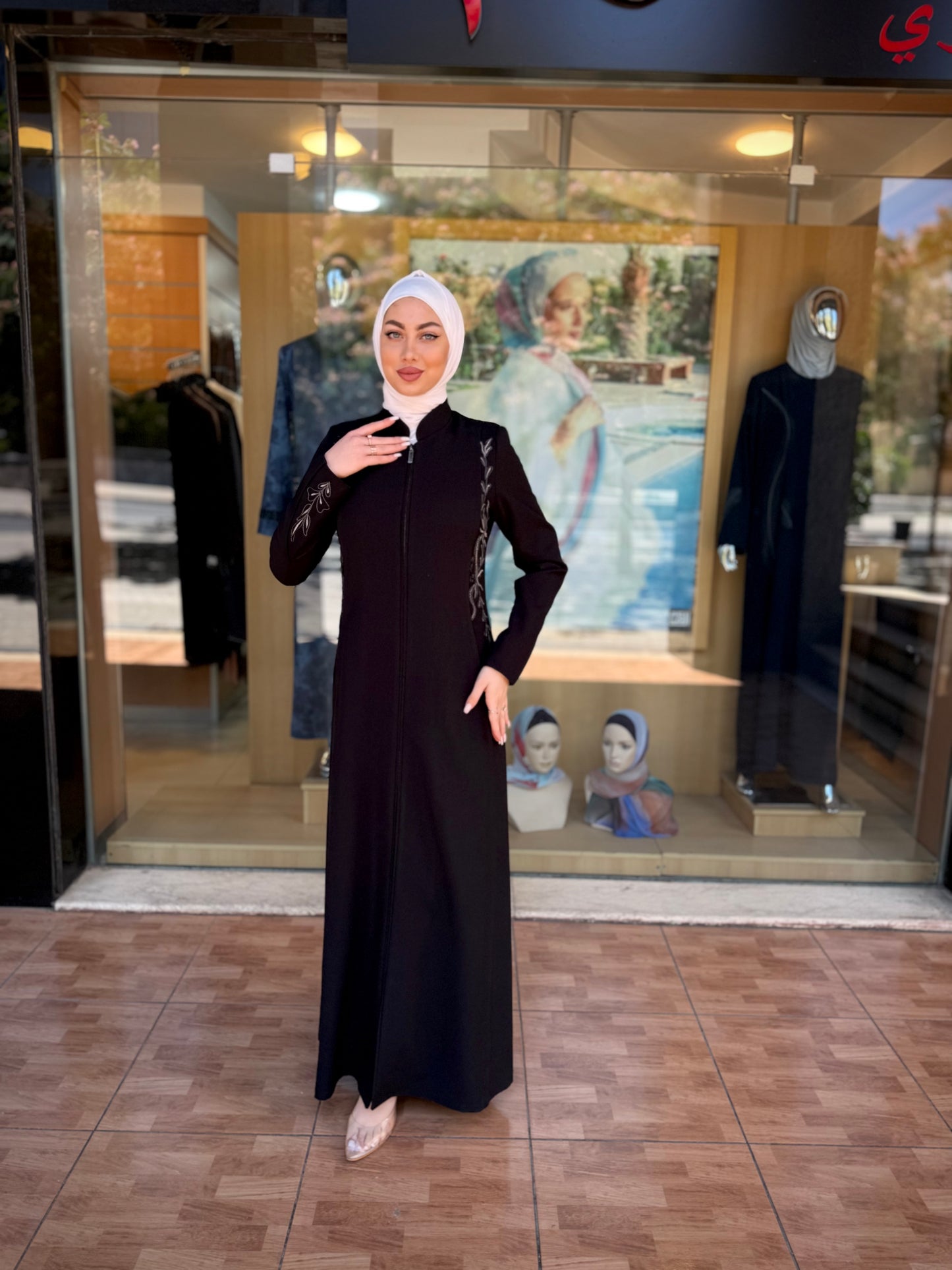 الراقية من العباءات والملابس النسائية الحصرية وتميزي بهذا الجلباب بقصة انسيابية راقية وتفاصيل من التطريز على الصدر والأكمام لإضافة لمسة من الفخامة الهادئة. يغلق من الأمام بسحاب لتوفير راحة وعملية، وهو مثالي للمناسبات الرسمية .