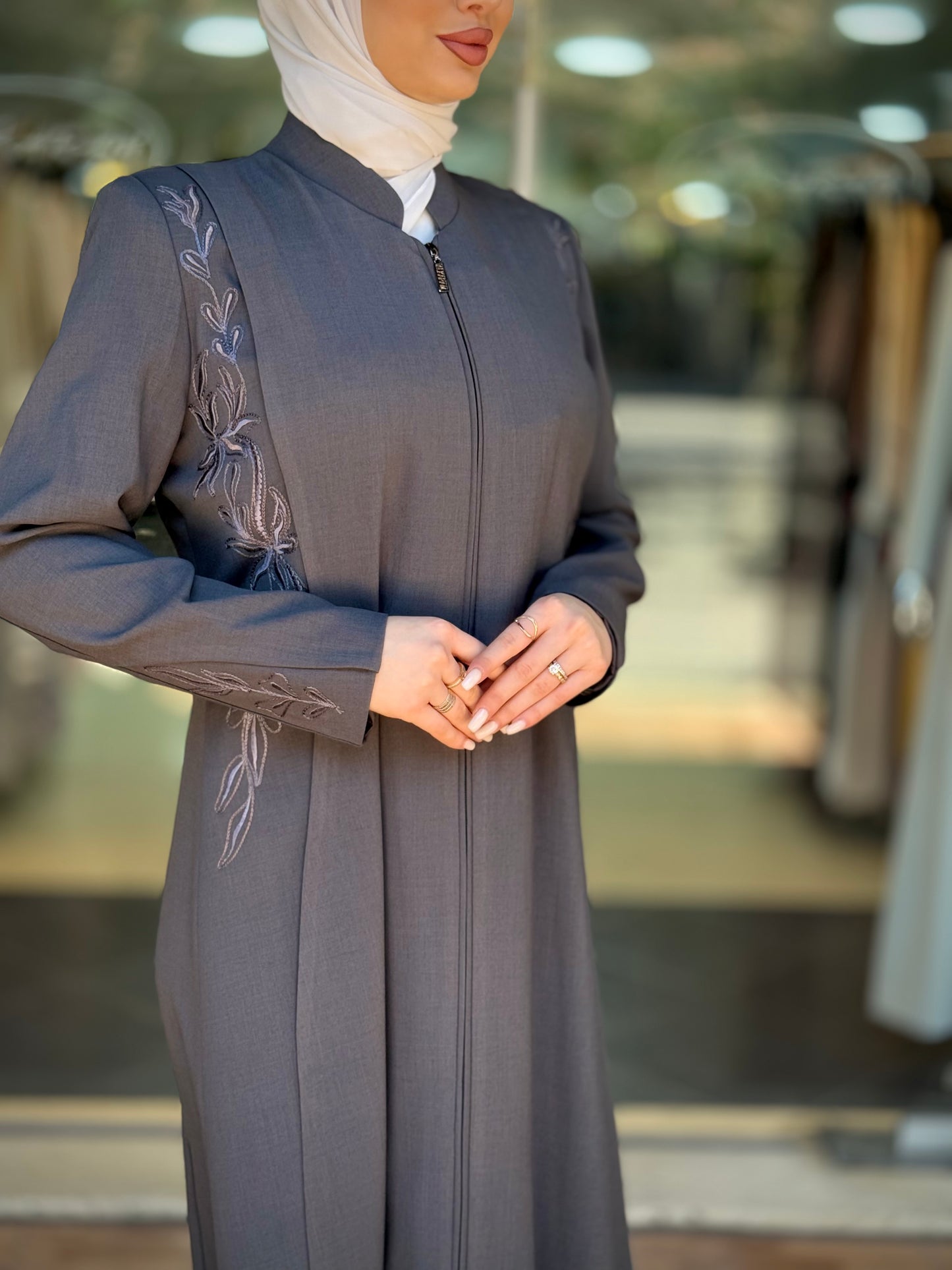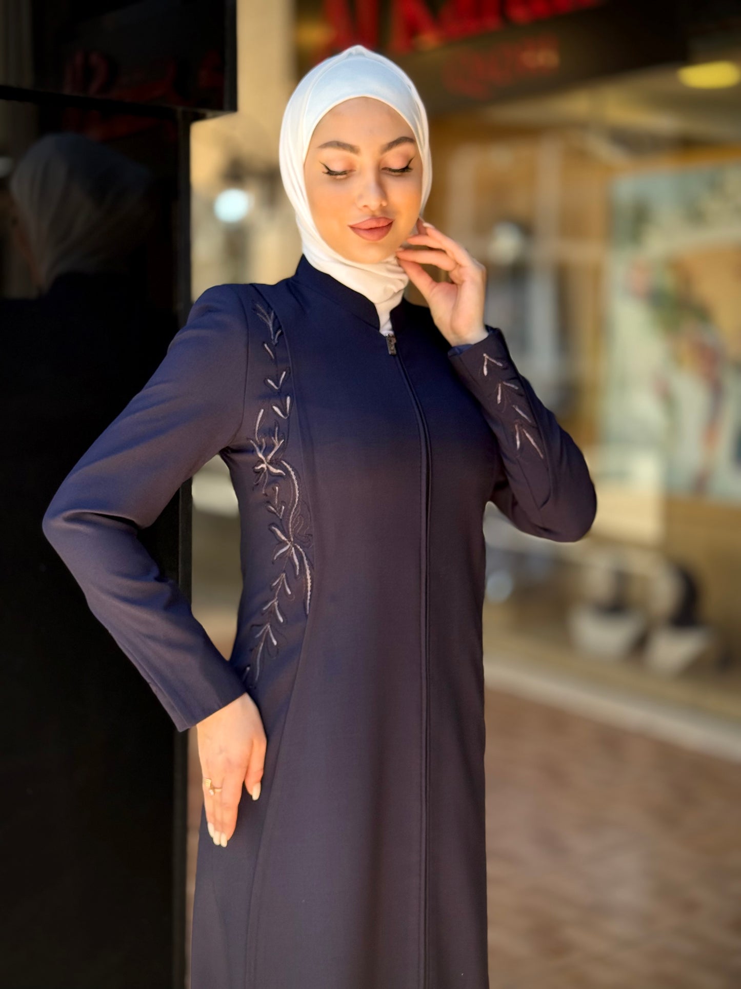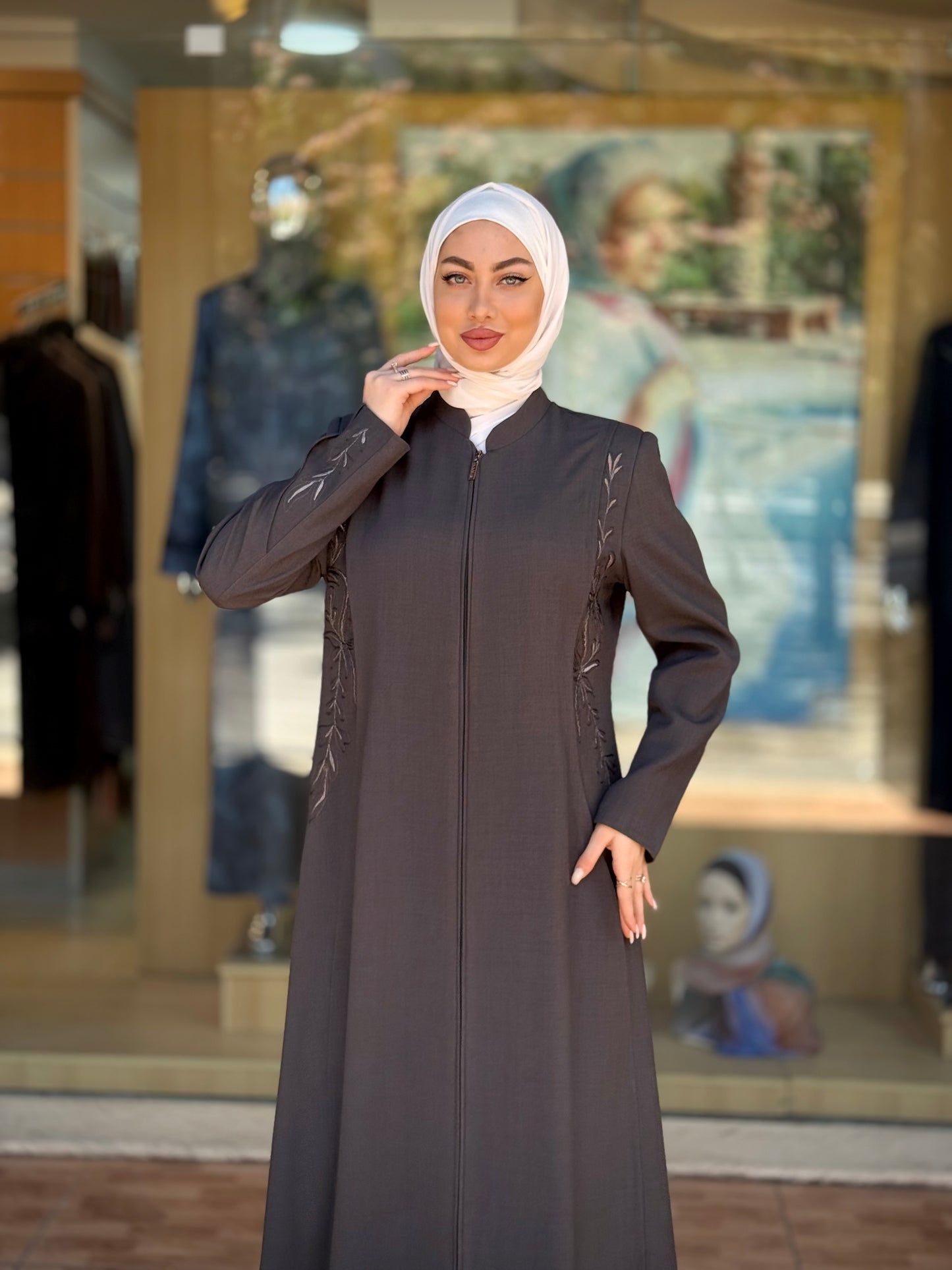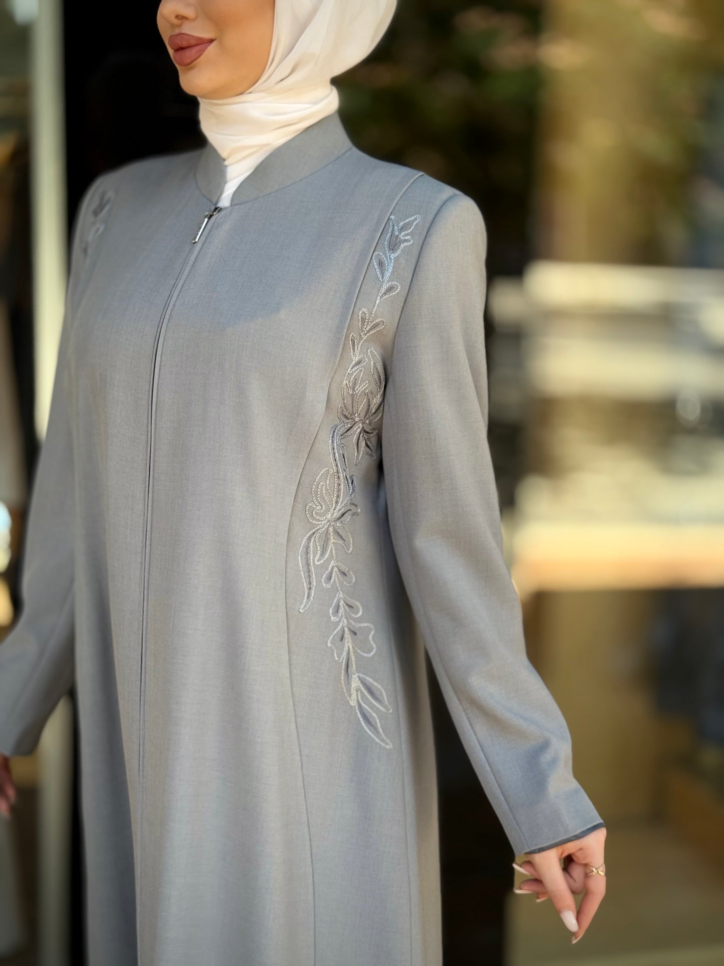 الراقية من العباءات والملابس النسائية الحصرية وتميزي بهذا الجلباب بقصة انسيابية راقية وتفاصيل من التطريز على الصدر والأكمام لإضافة لمسة من الفخامة الهادئة. يغلق من الأمام بسحاب لتوفير راحة وعملية، وهو مثالي للمناسبات الرسمية .
