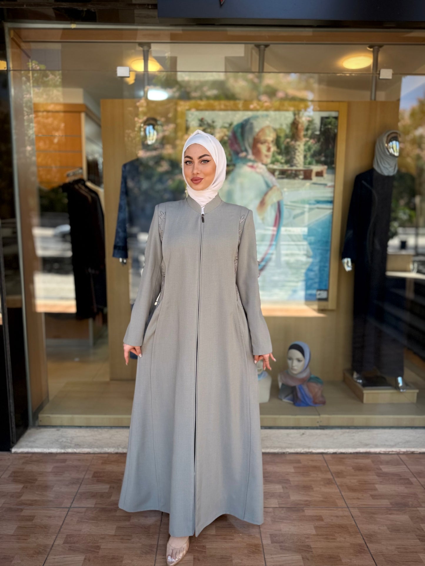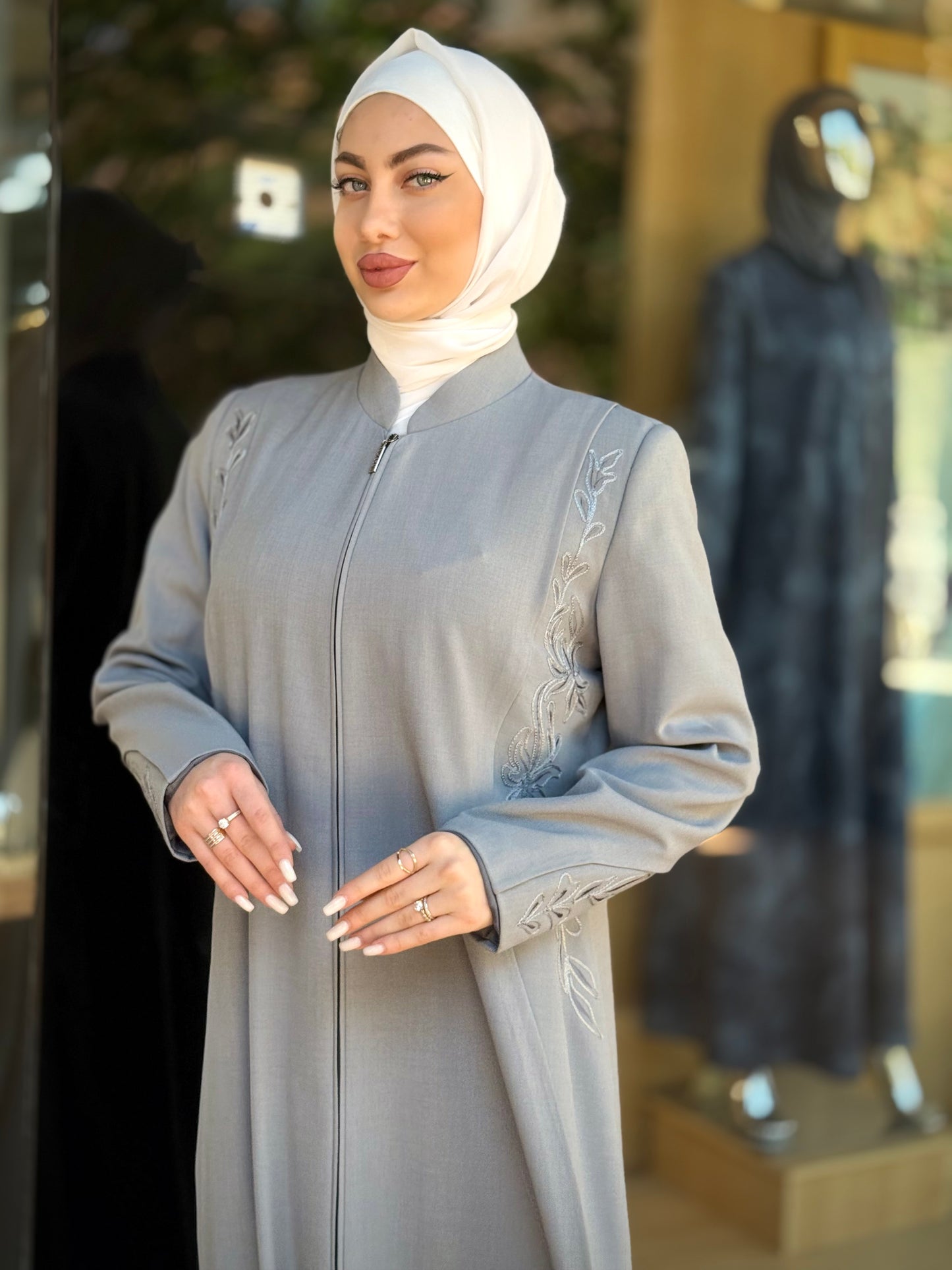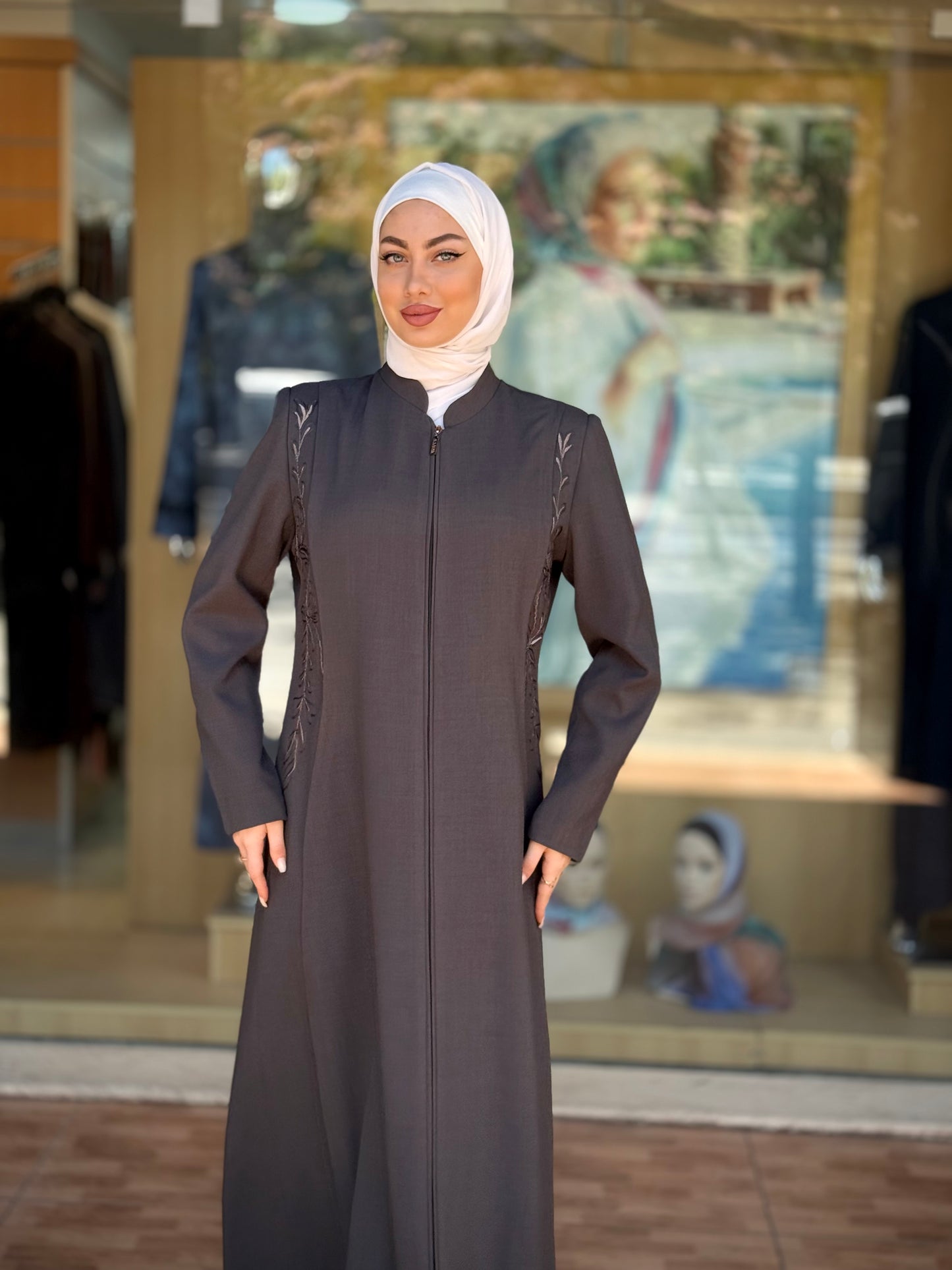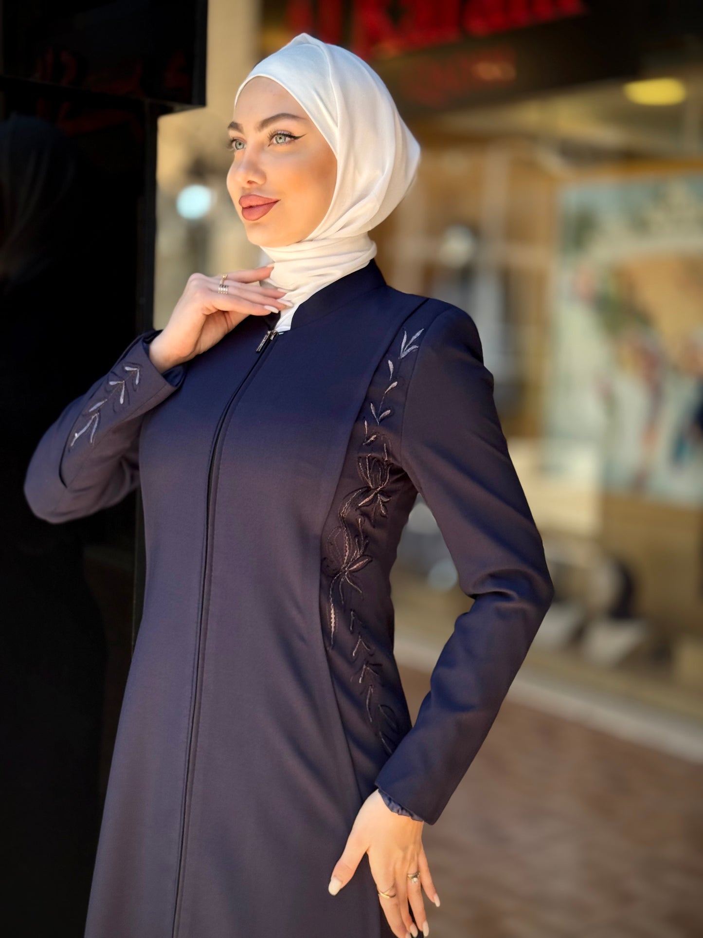 الراقية من العباءات والملابس النسائية الحصرية وتميزي بهذا الجلباب بقصة انسيابية راقية وتفاصيل من التطريز على الصدر والأكمام لإضافة لمسة من الفخامة الهادئة. يغلق من الأمام بسحاب لتوفير راحة وعملية، وهو مثالي للمناسبات الرسمية .