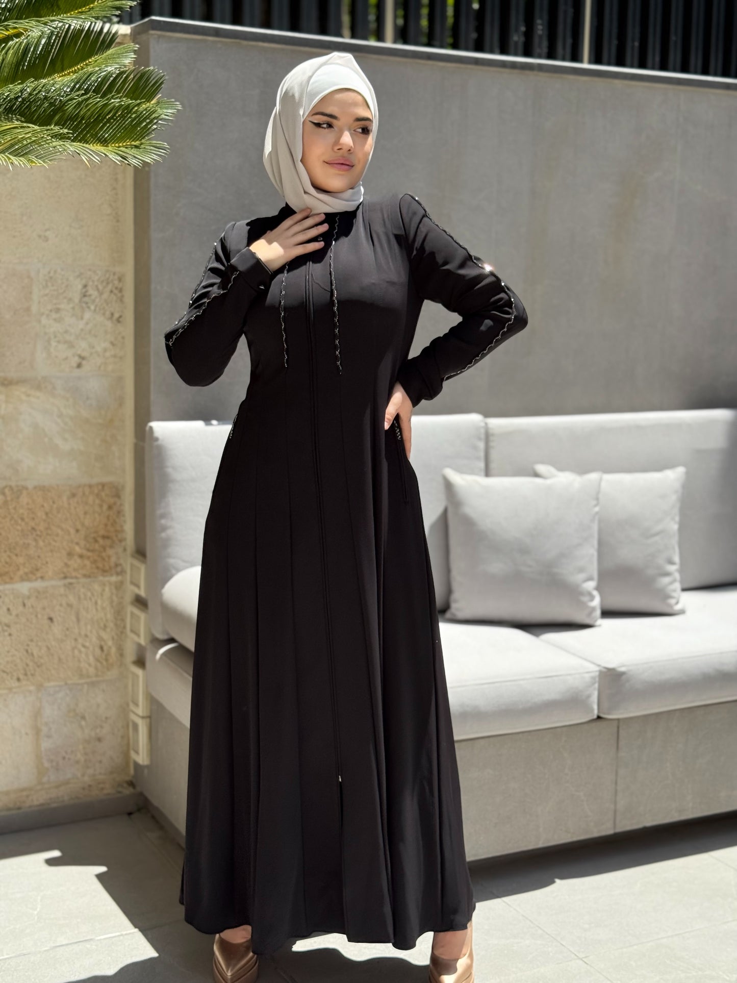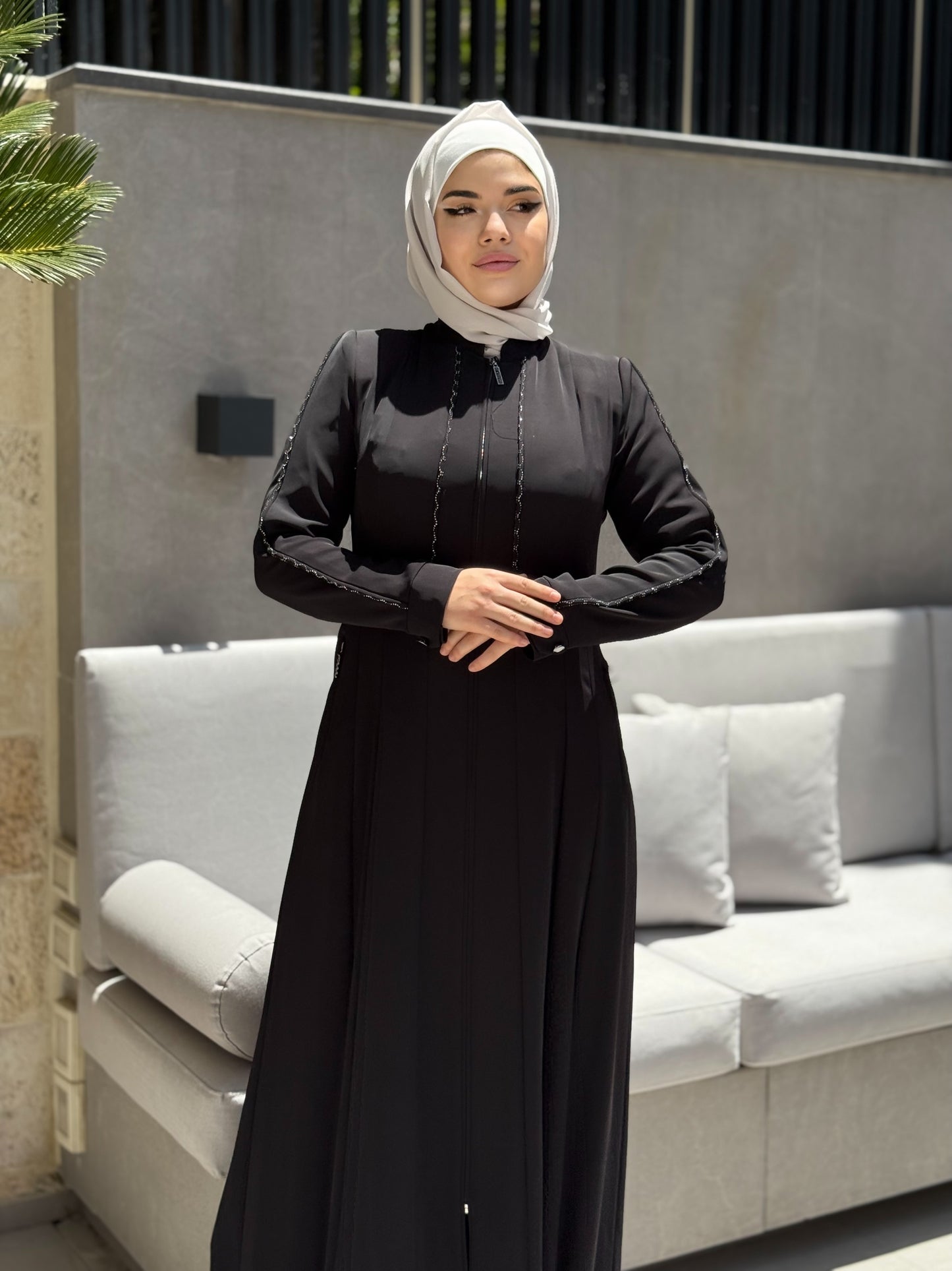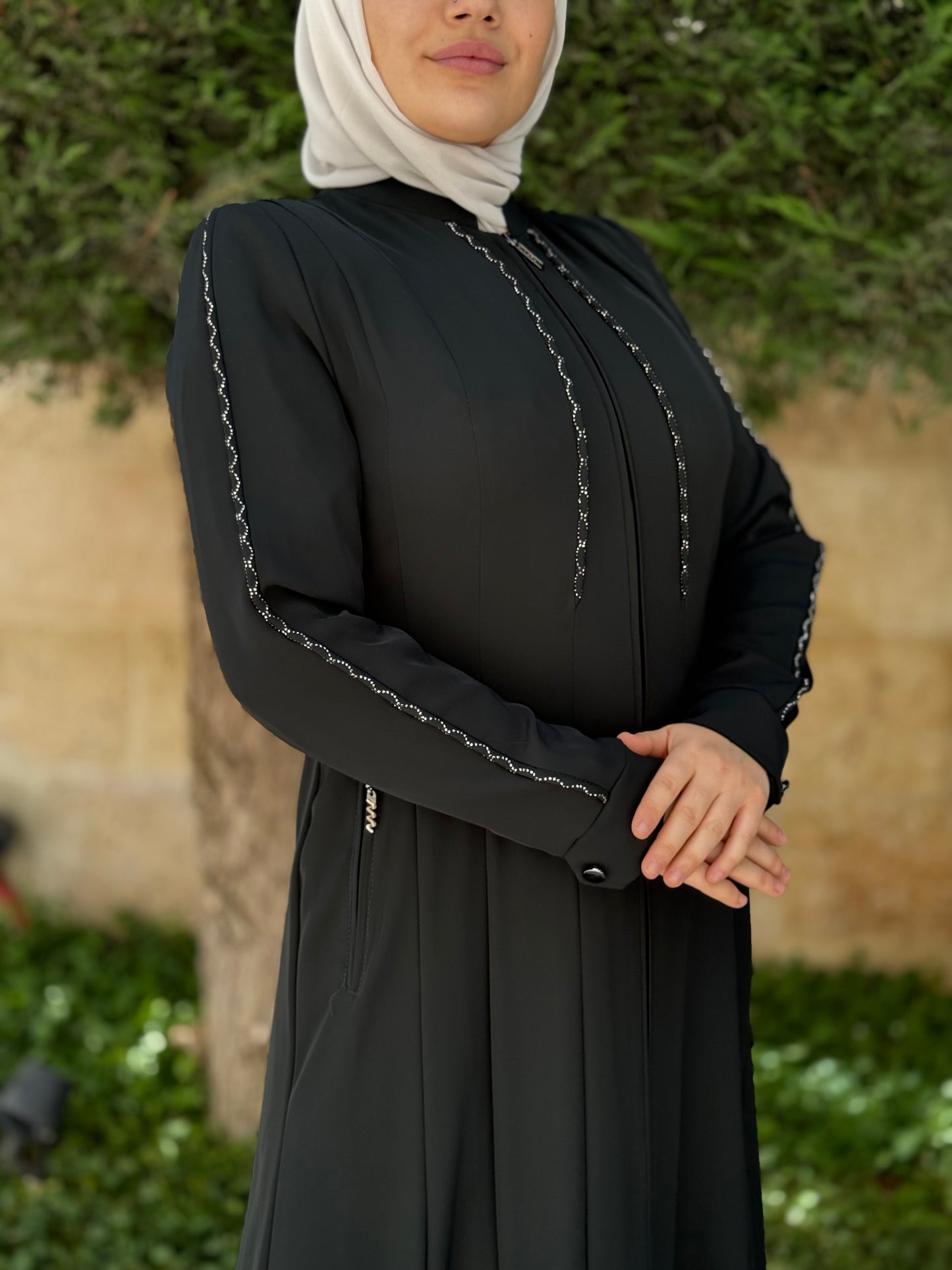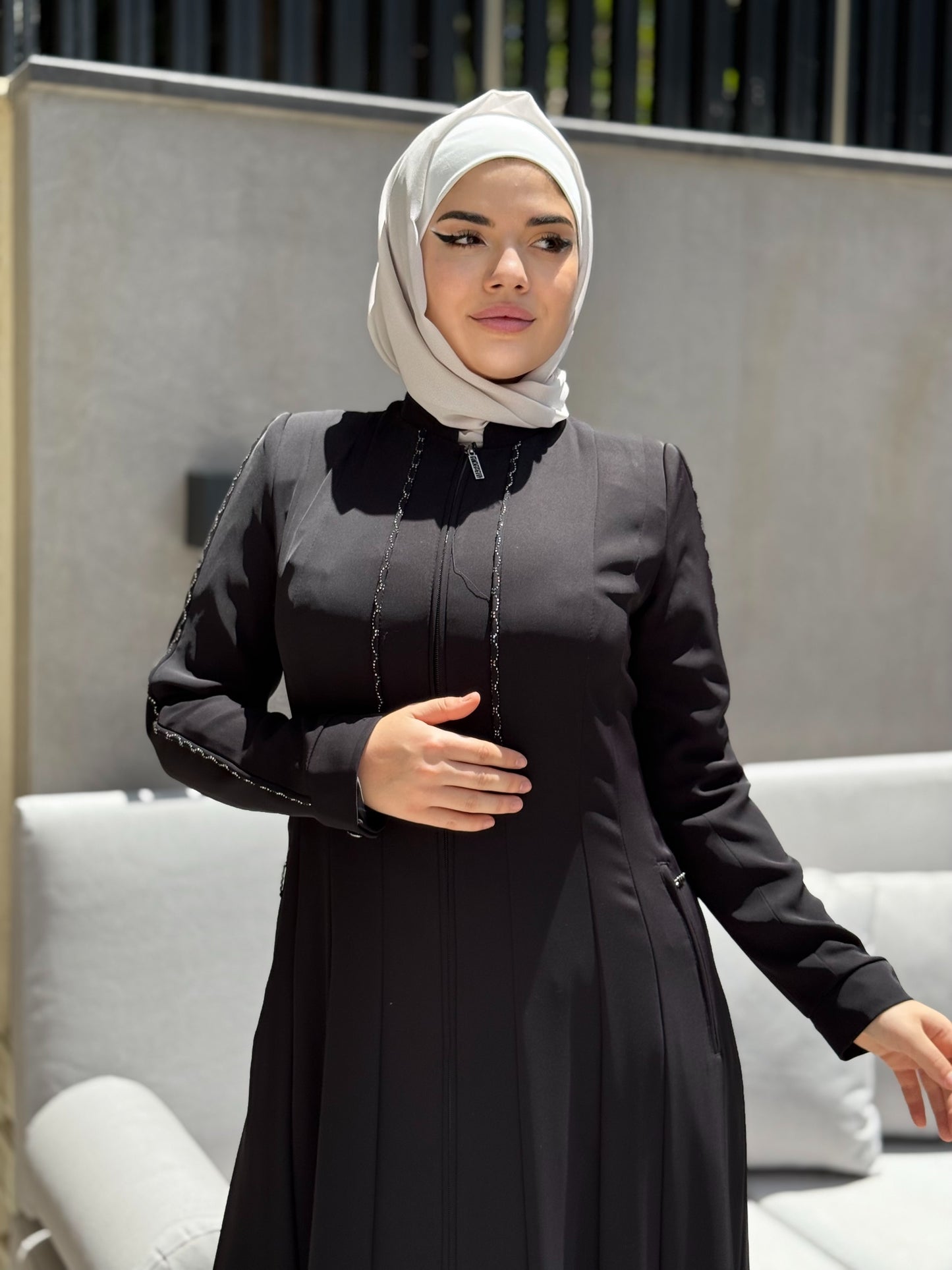 استمتعي بالراحة والأناقة مع مجموعة الكرم قادري العصرية للملابس النسائية والعبايات الواسعة من الجلابيب العصرية الفخمة والأنيقة لتتألقي بهذا الجلباب العملي من قماش نيو بلازما السادة المزين بتفاصيل عصرية من الستراس من الأمام وعلى الأكمام وهو مفتوح من الأمام يغلق بسحاب، صمم وصنع في الأردن بأفضل أنواع قماش النيو بلازما