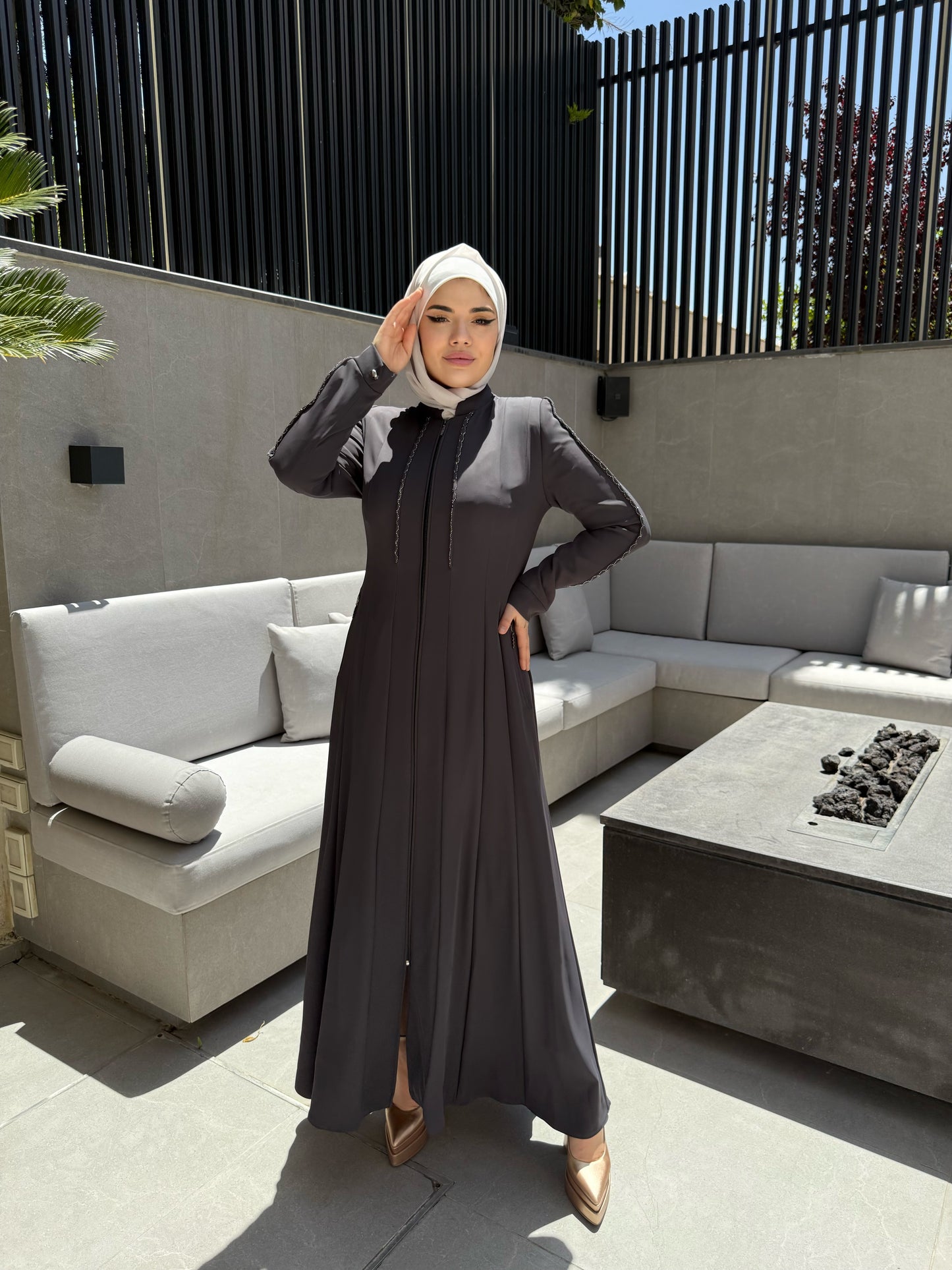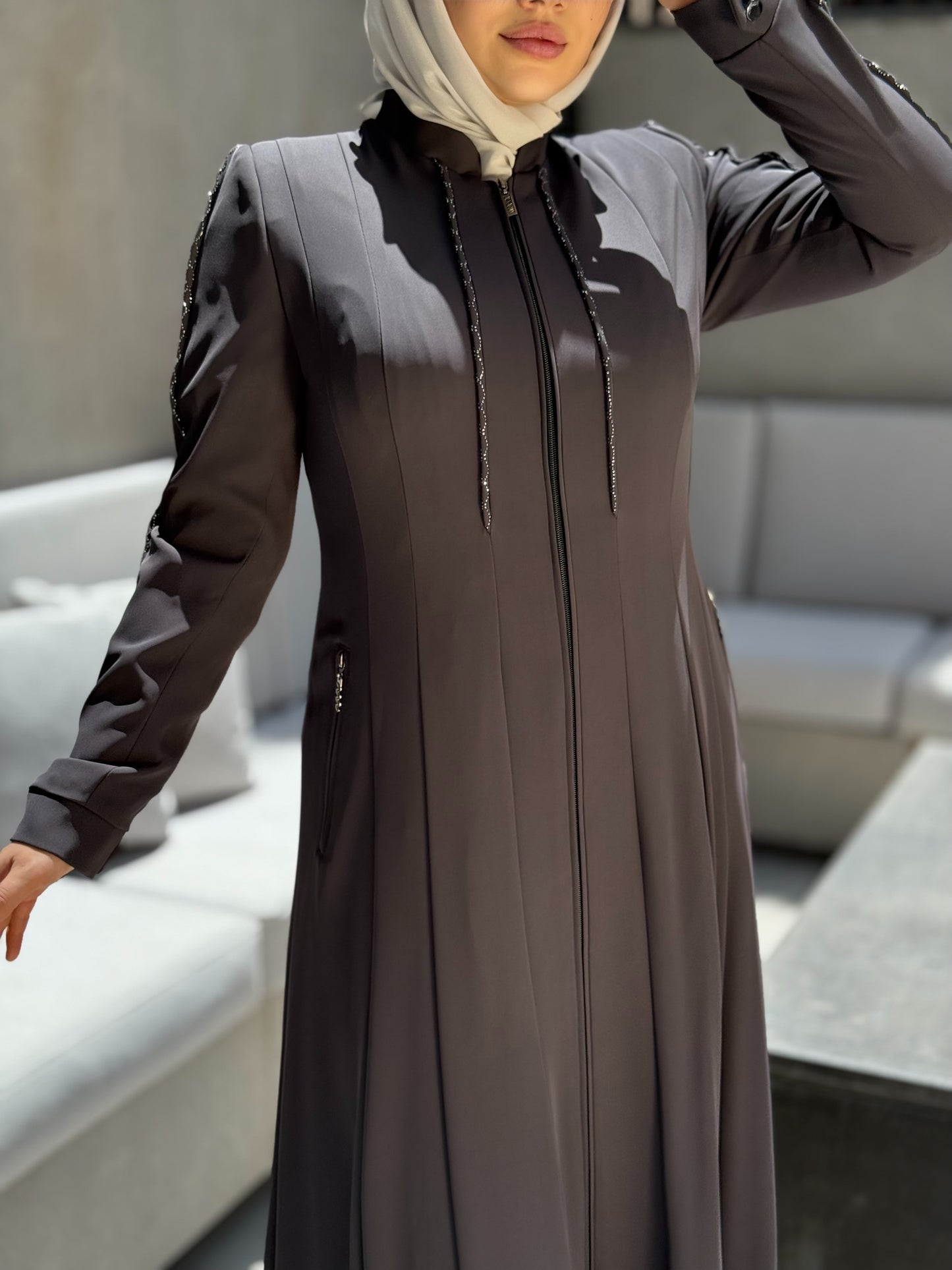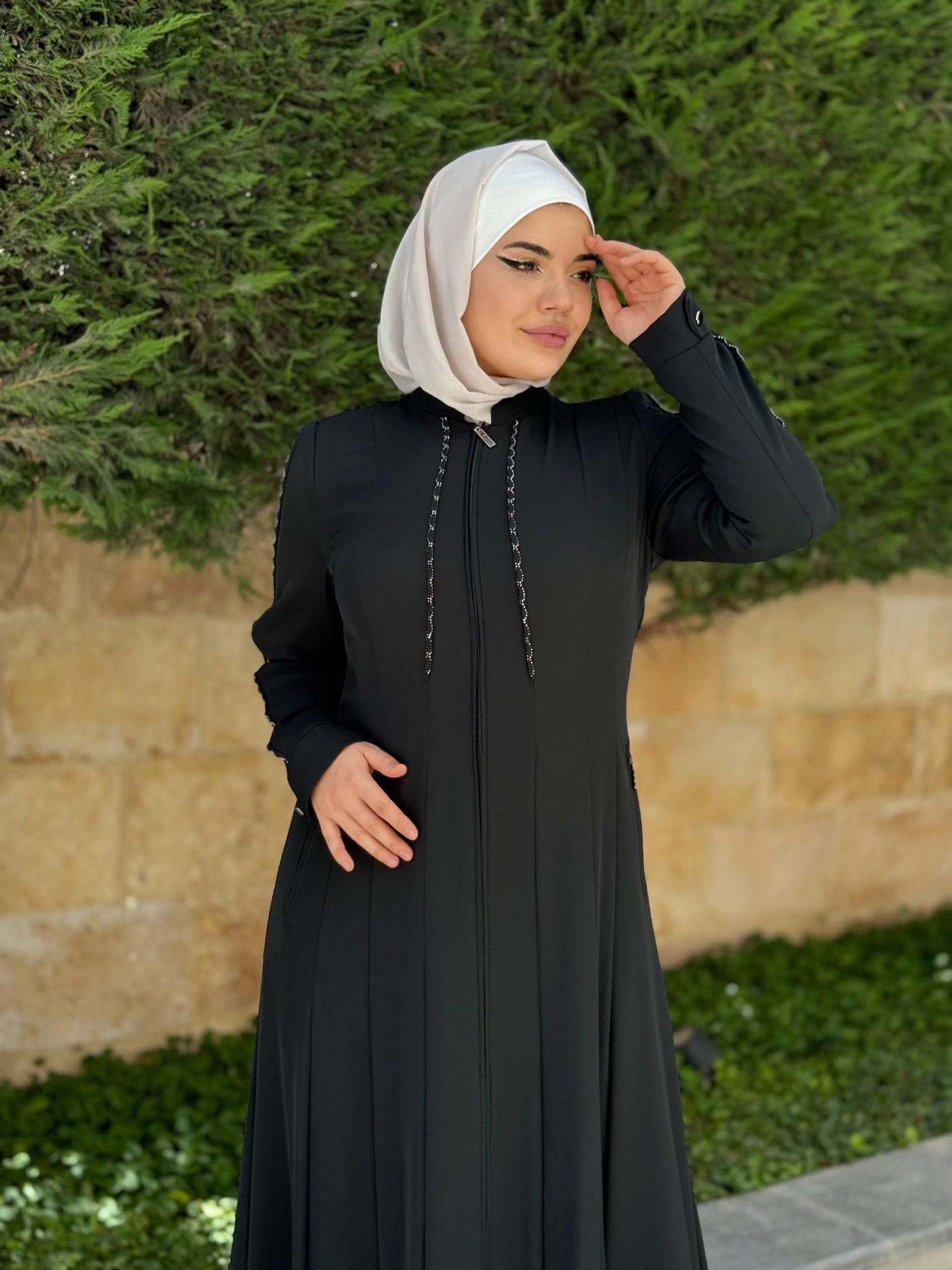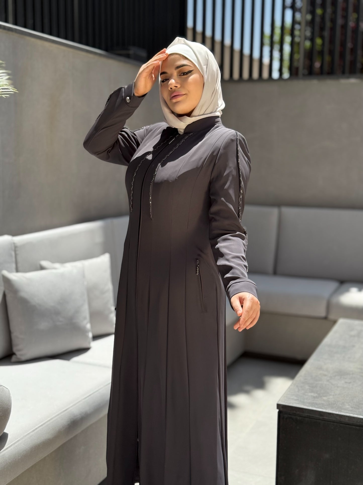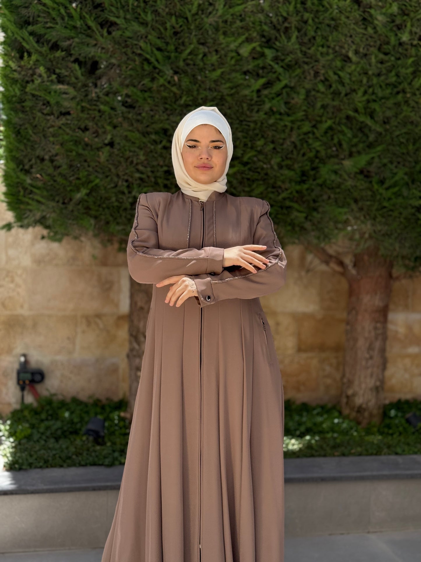 استمتعي بالراحة والأناقة مع مجموعة الكرم قادري العصرية للملابس النسائية والعبايات الواسعة من الجلابيب العصرية الفخمة والأنيقة لتتألقي بهذا الجلباب العملي من قماش نيو بلازما السادة المزين بتفاصيل عصرية من الستراس من الأمام وعلى الأكمام وهو مفتوح من الأمام يغلق بسحاب، صمم وصنع في الأردن بأفضل أنواع قماش النيو بلازما