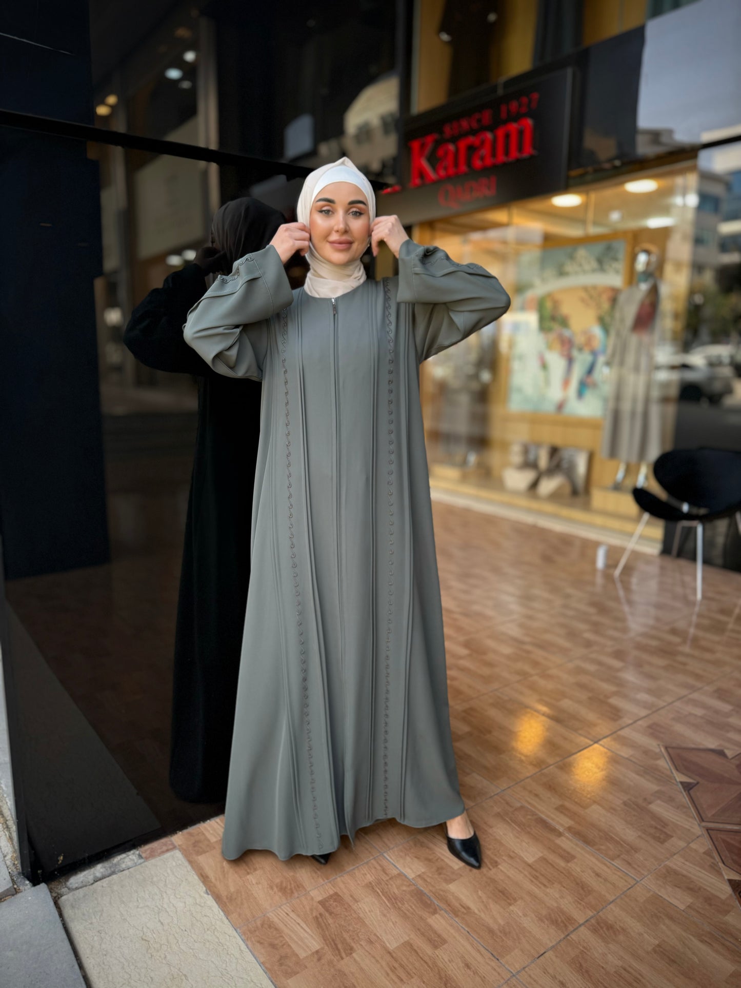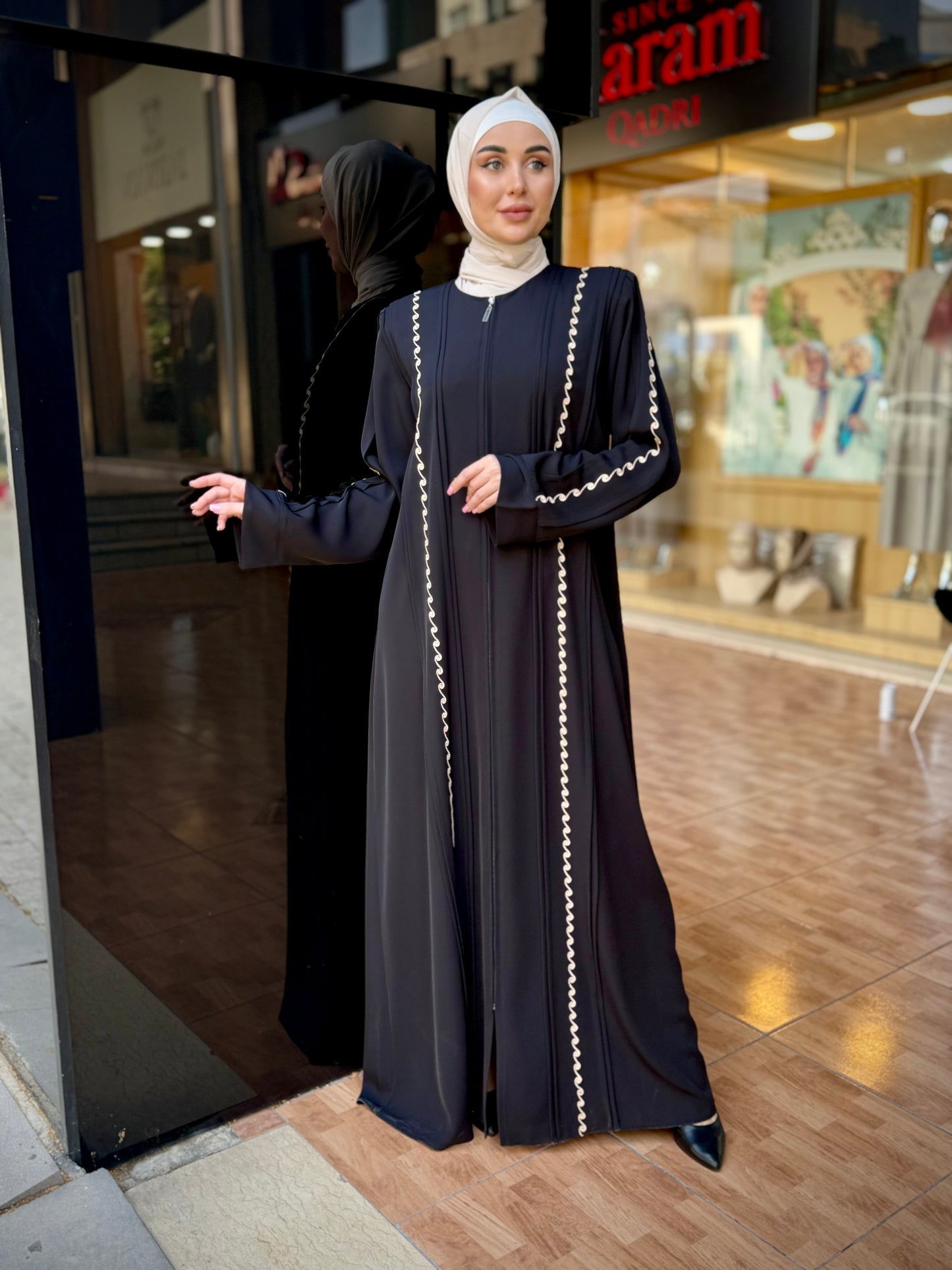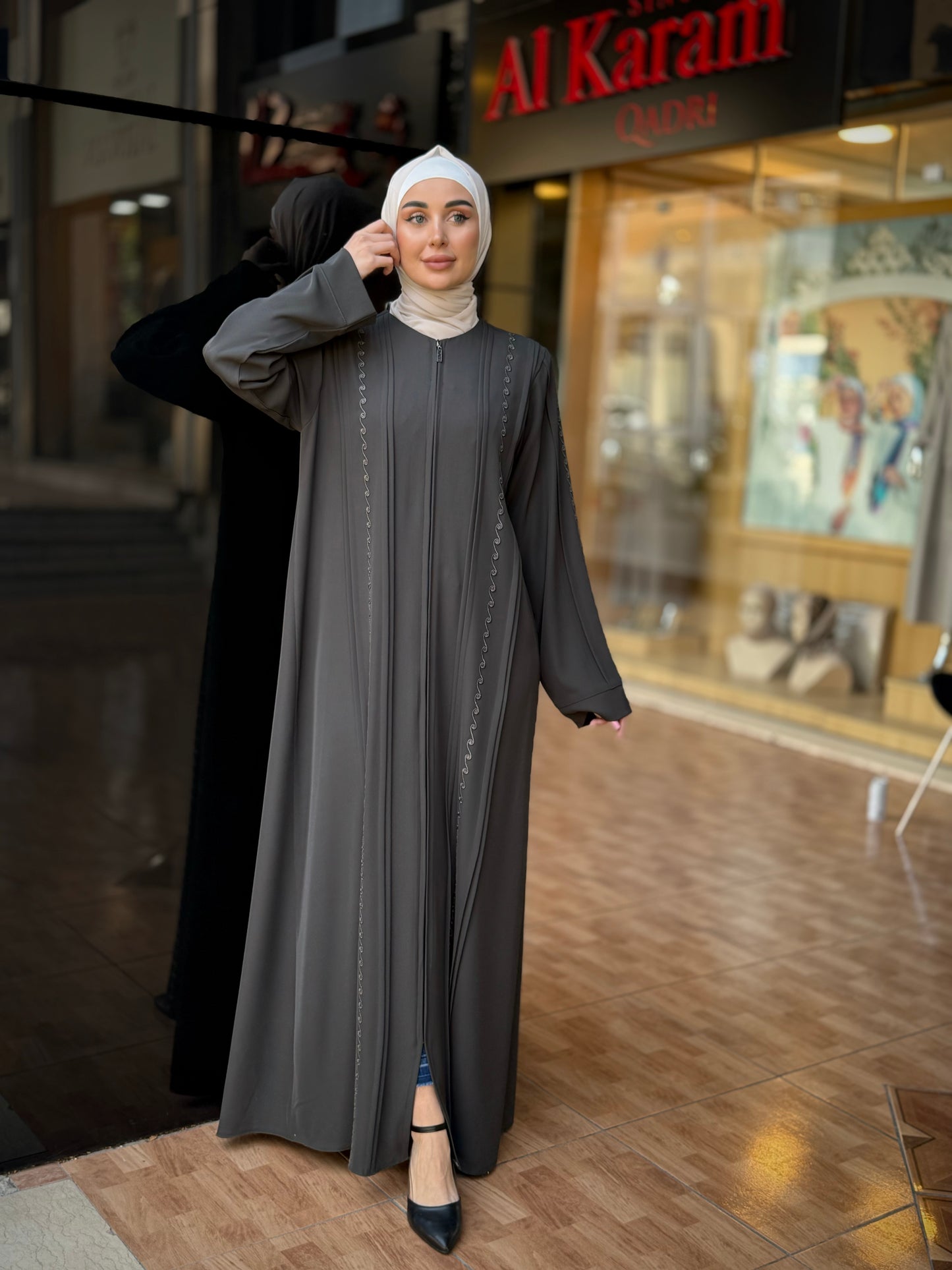 تألقي بإطلالة جذابة ومثيرة مع هذه العباية من أحدث تشكيلة الكرم قادري العصرية والمميزة . عباية عملية مغلقة من الأمام تفتح بسحاب لسهولة ارتداءها ، مزينة بالتطريز اليدوي من الأمام وعلى الأكمام ، صممت وصنعت في الأردن بأفضل أنواع قماش البلازما
