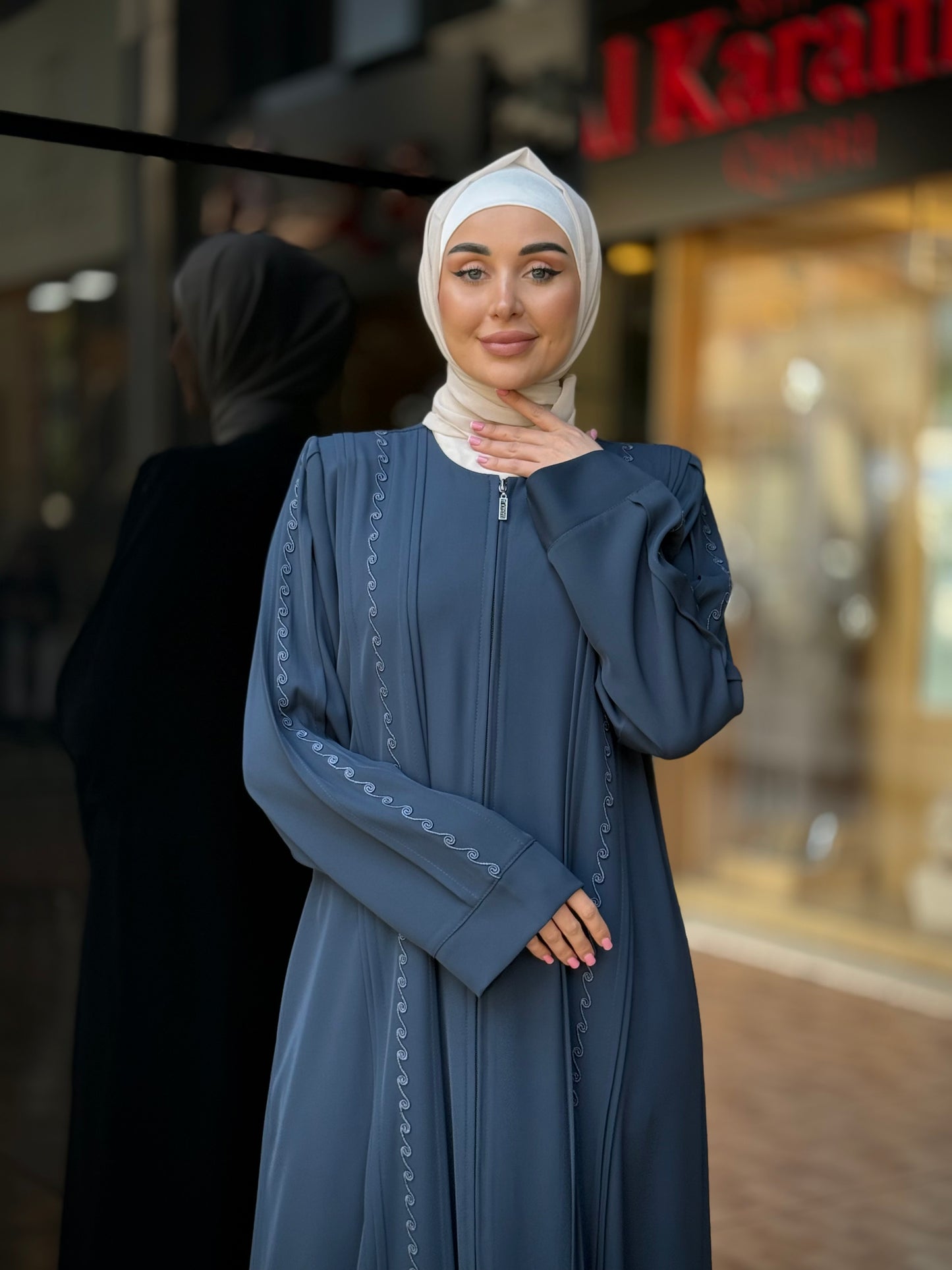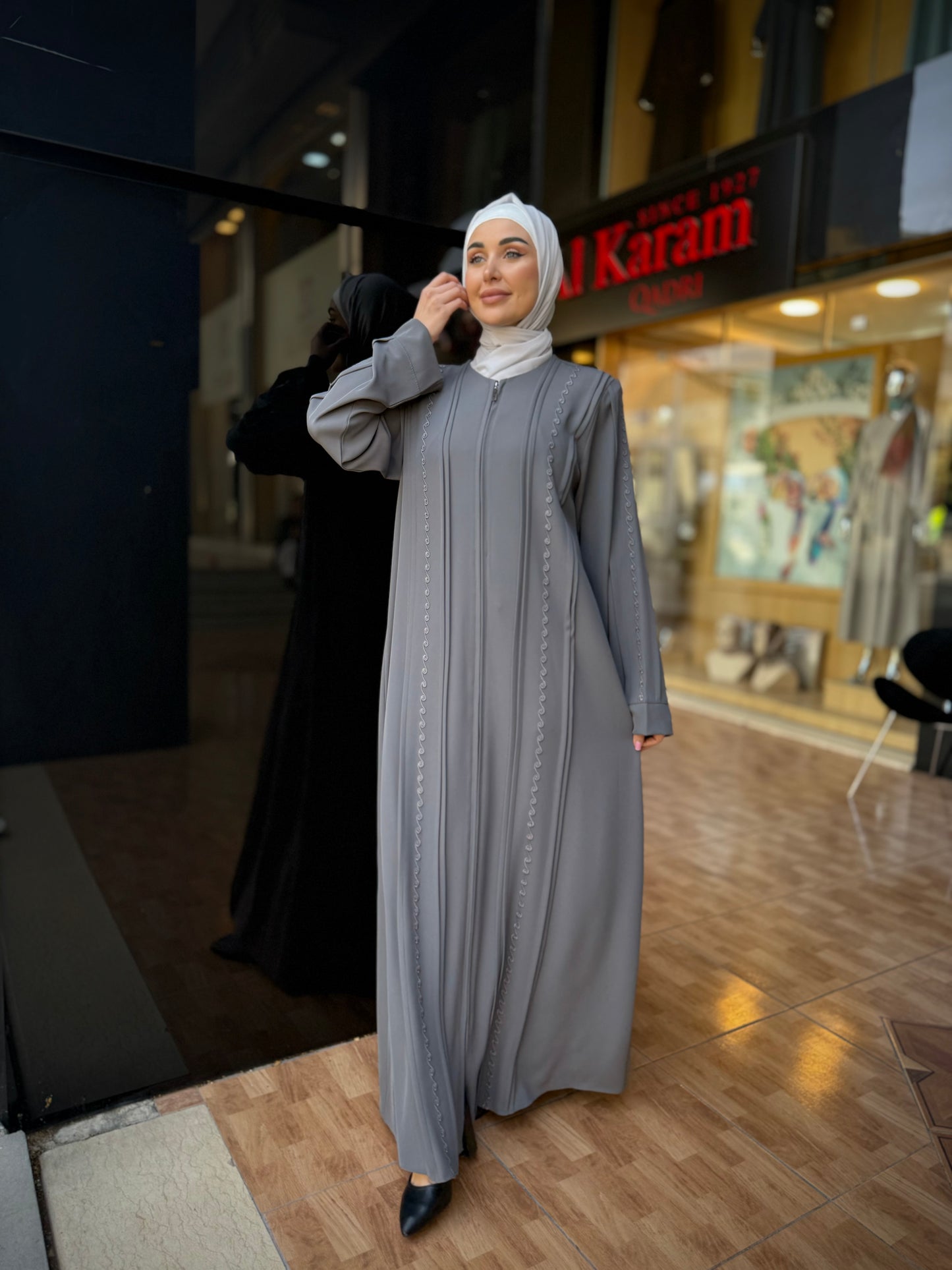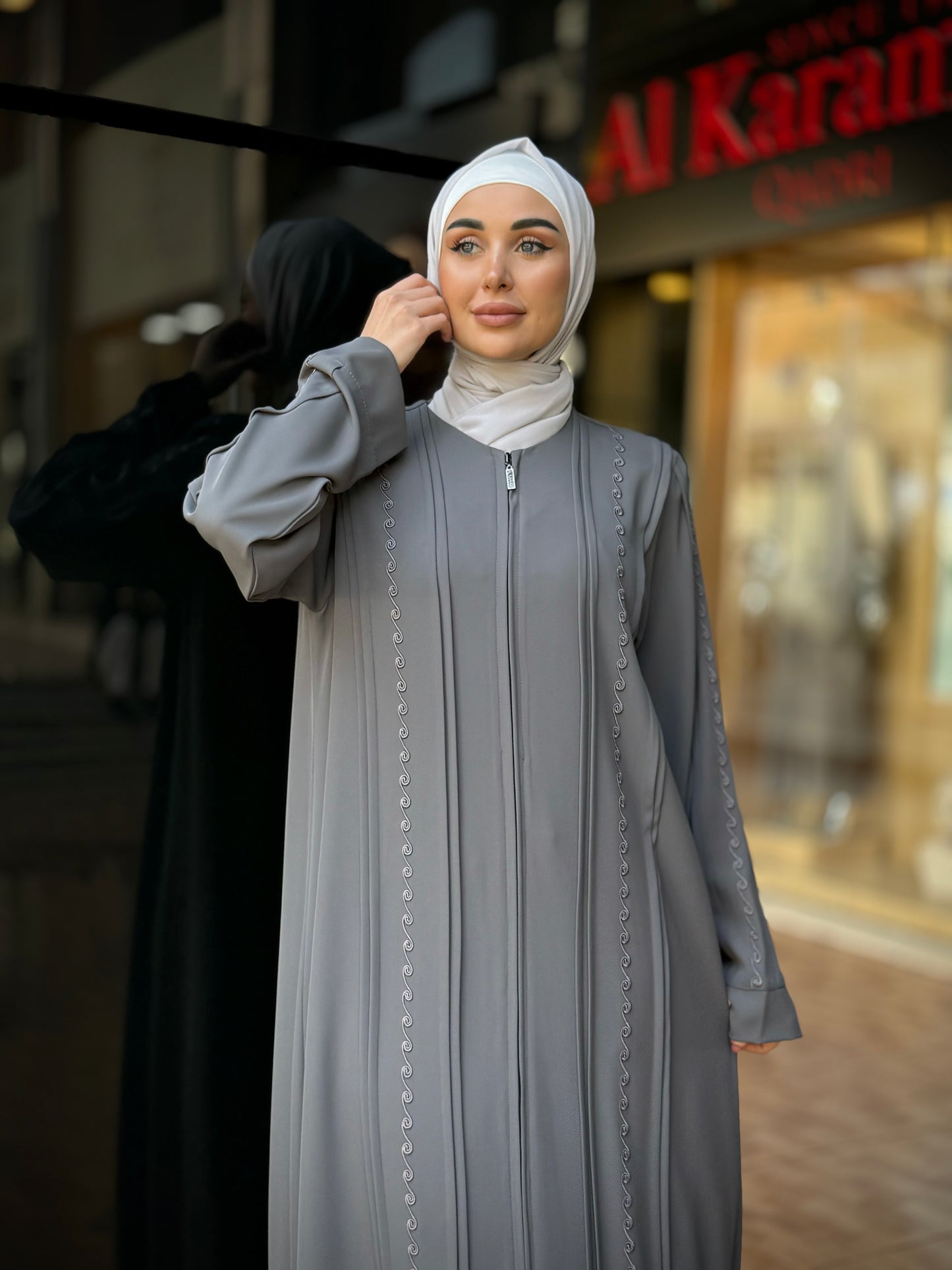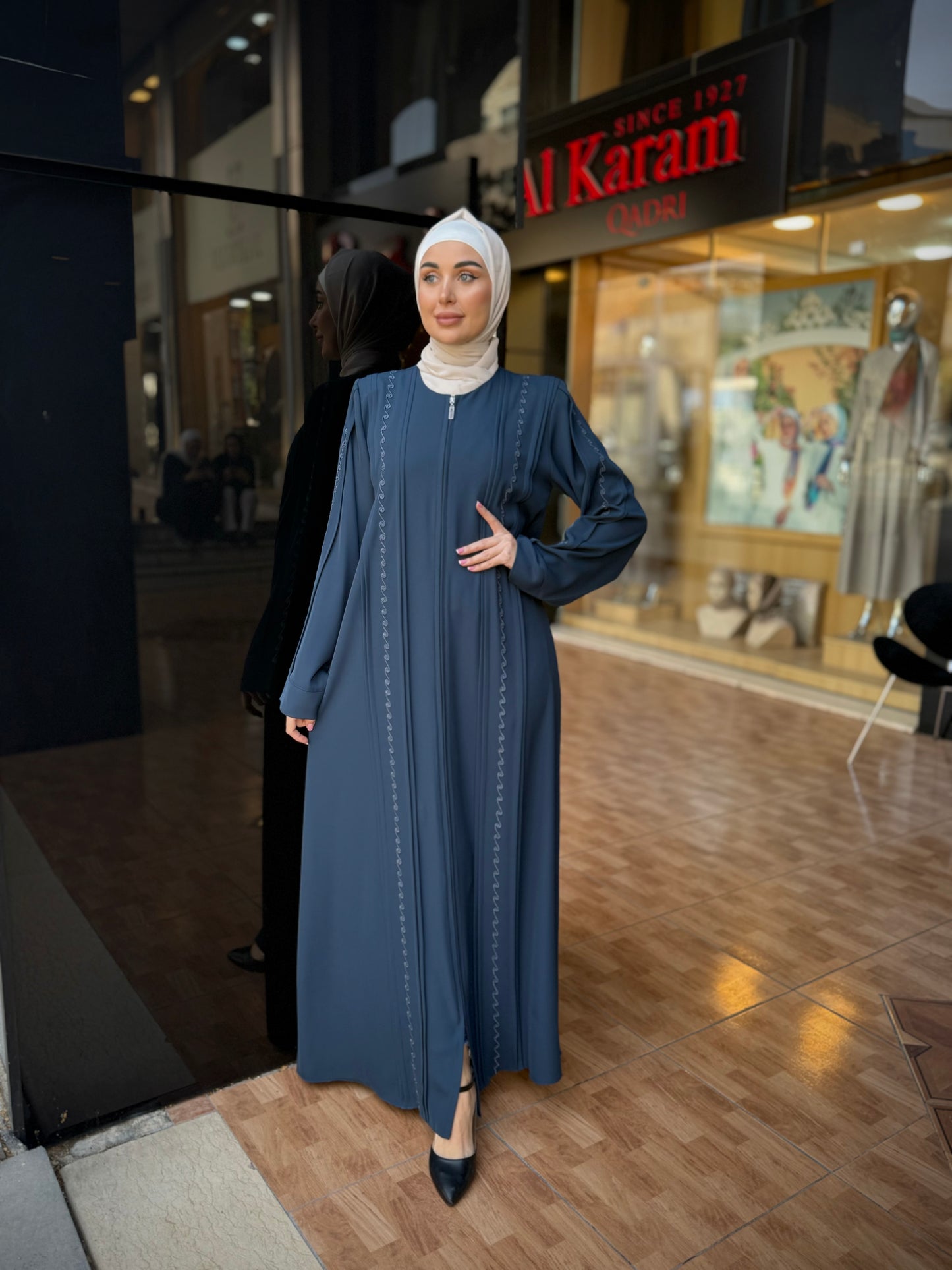 تألقي بإطلالة جذابة ومثيرة مع هذه العباية من أحدث تشكيلة الكرم قادري العصرية والمميزة . عباية عملية مغلقة من الأمام تفتح بسحاب لسهولة ارتداءها ، مزينة بالتطريز اليدوي من الأمام وعلى الأكمام ، صممت وصنعت في الأردن بأفضل أنواع قماش البلازما
