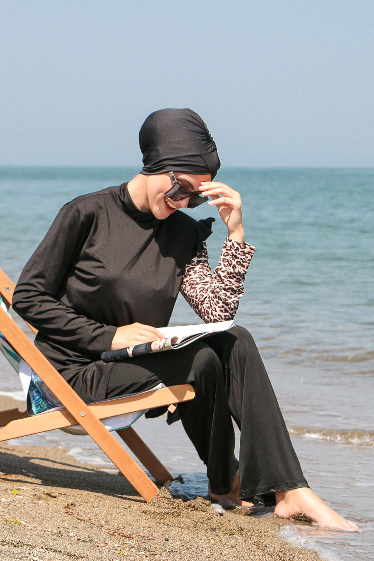 ملابس سباحة مميزة وأنيقة ، تأتي بأربع قطع ، وهي غطاء للرأس وبنطال وبدي وسترة مقاومة للماء .