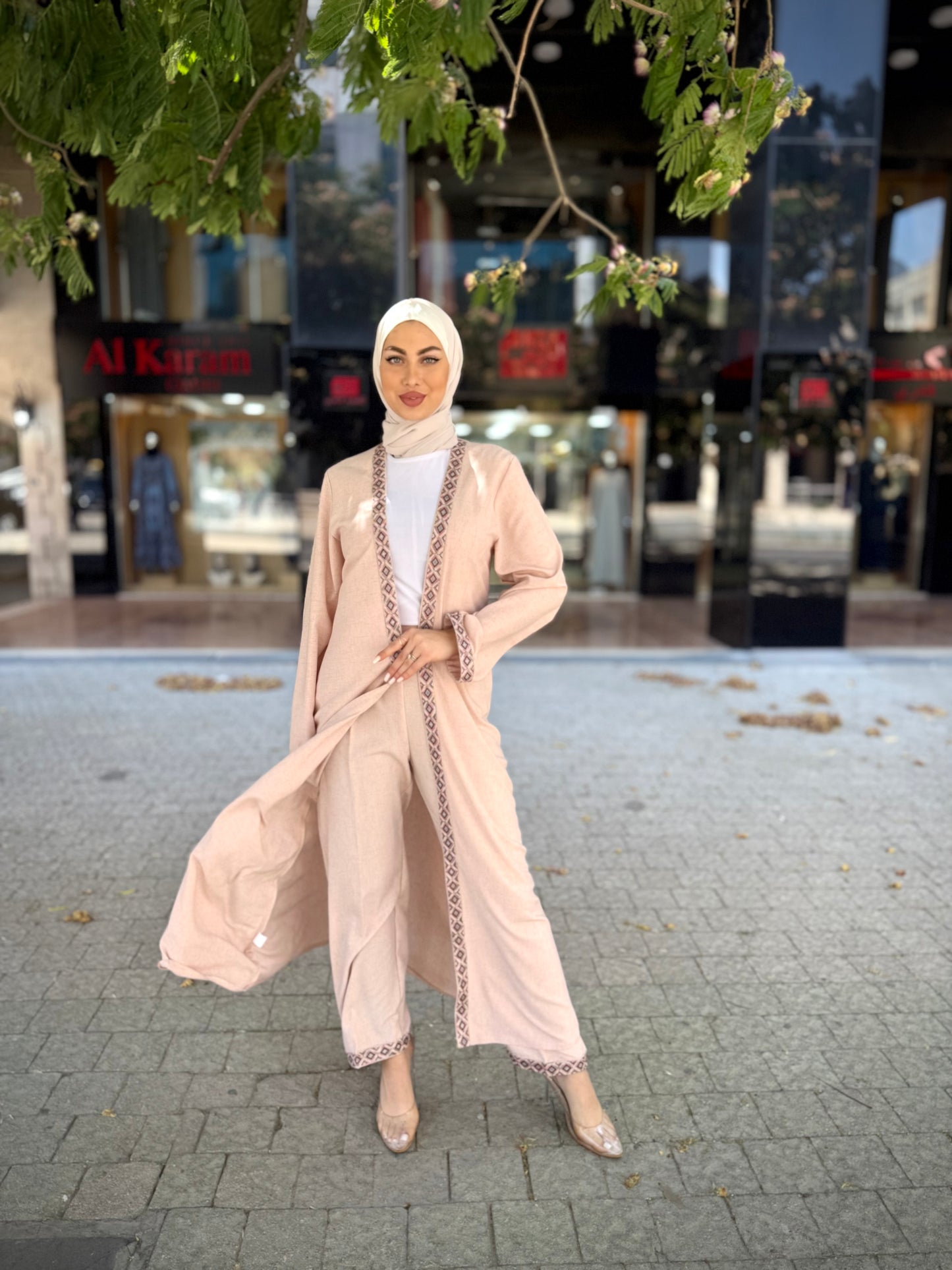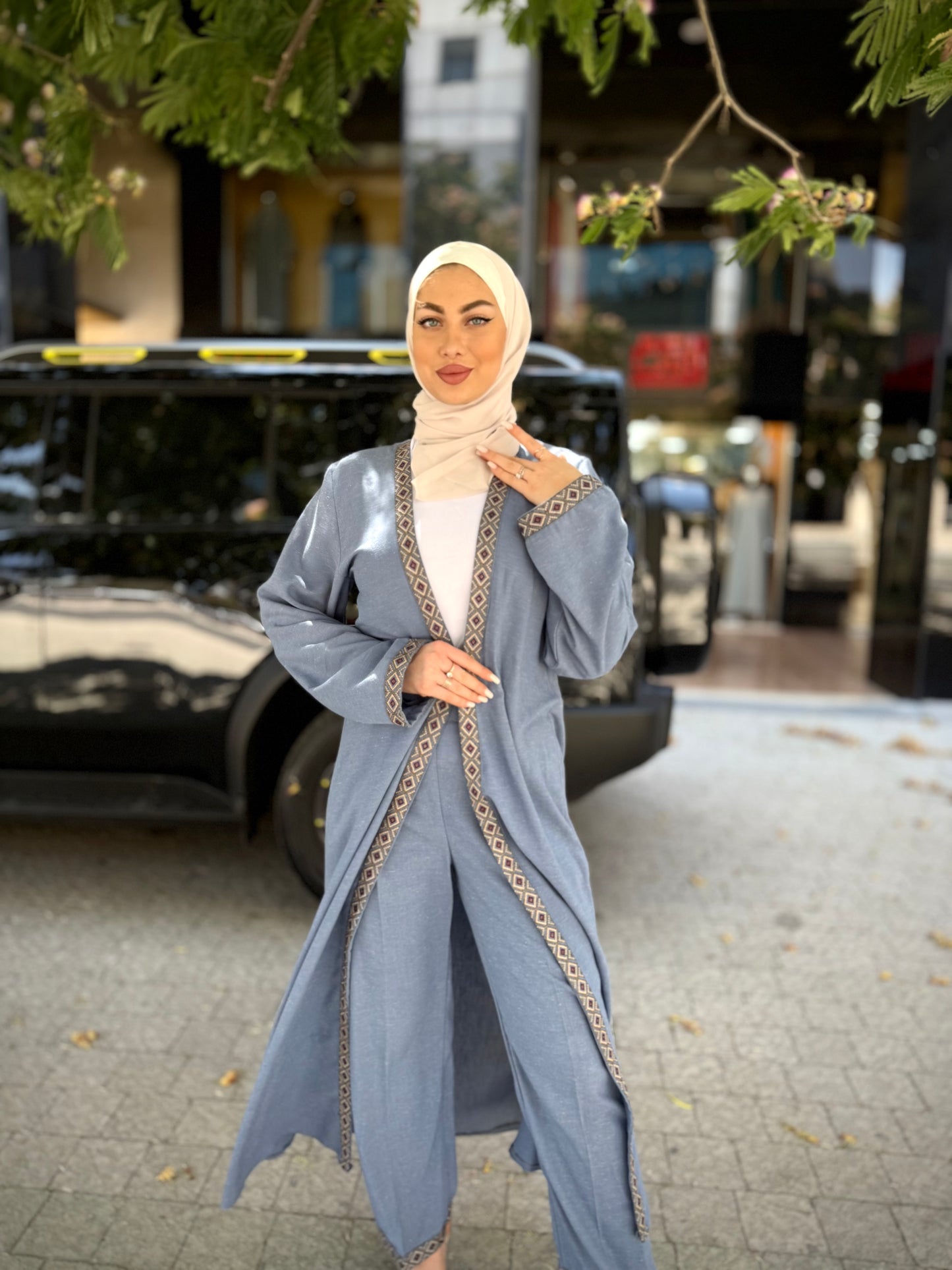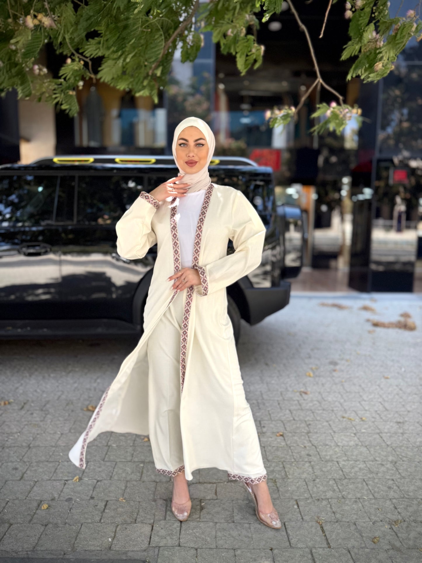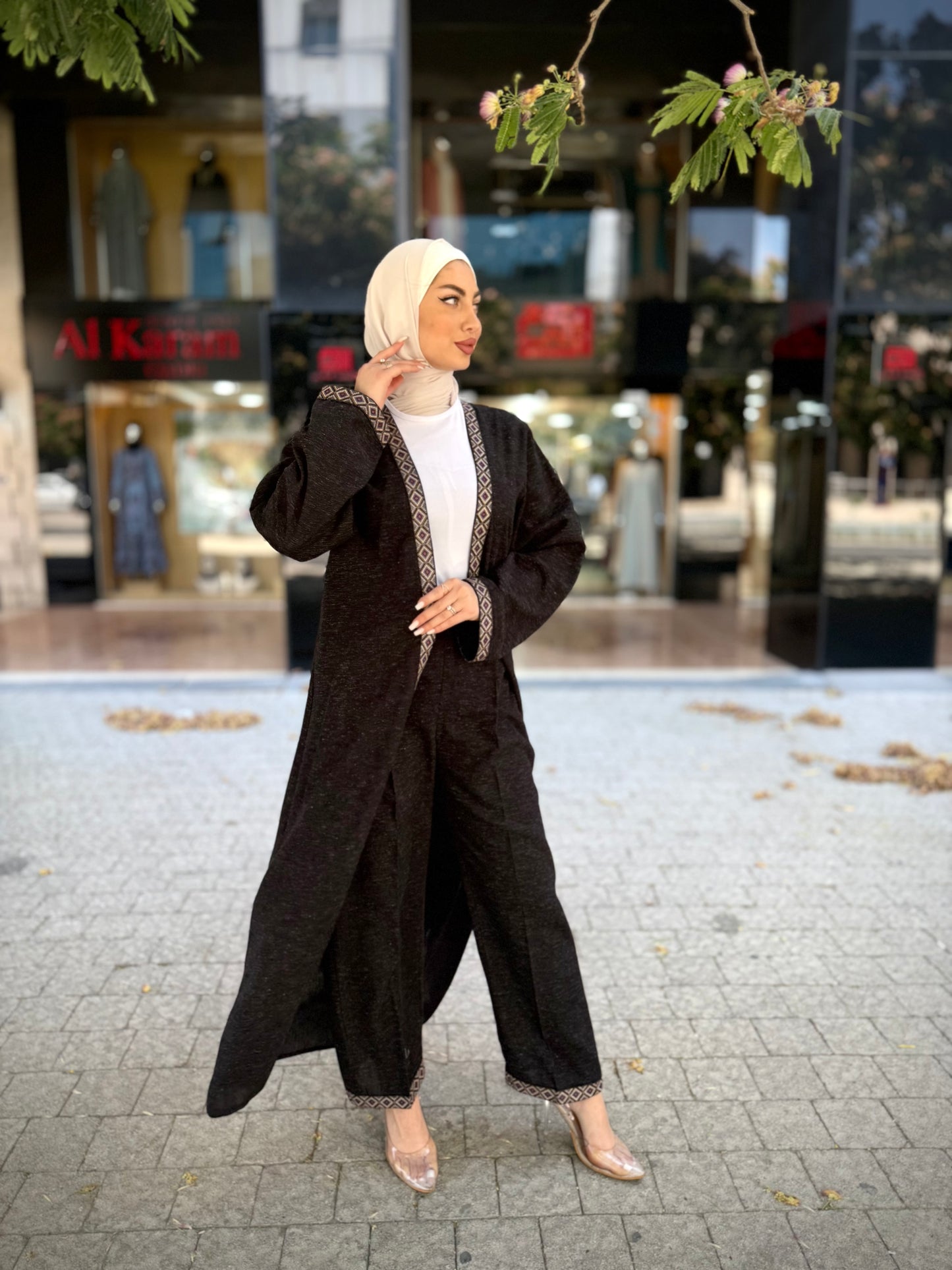 استمتعي بالراحة والأناقة مع مجموعة الكرم قادري للملابس النسائية والعبايات الواسعة والجلابيب العصرية الفخمة والأنيقة لتتألقي بهذه العباءة مع بنطال بقصة انسيابية راقية وتفاصيل من التطريز العصري من الأمام ومن الخلف وعلى الأكمام لإضافة لمسة من الفخامة الهادئة، وهو مثالي للأعمال اليومية والمناسبات .