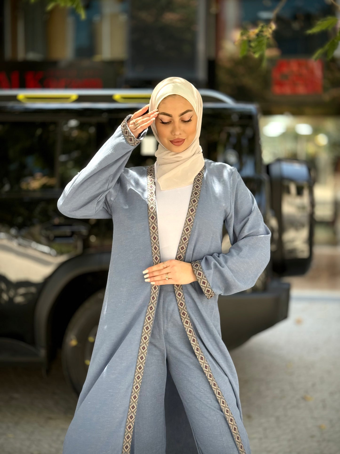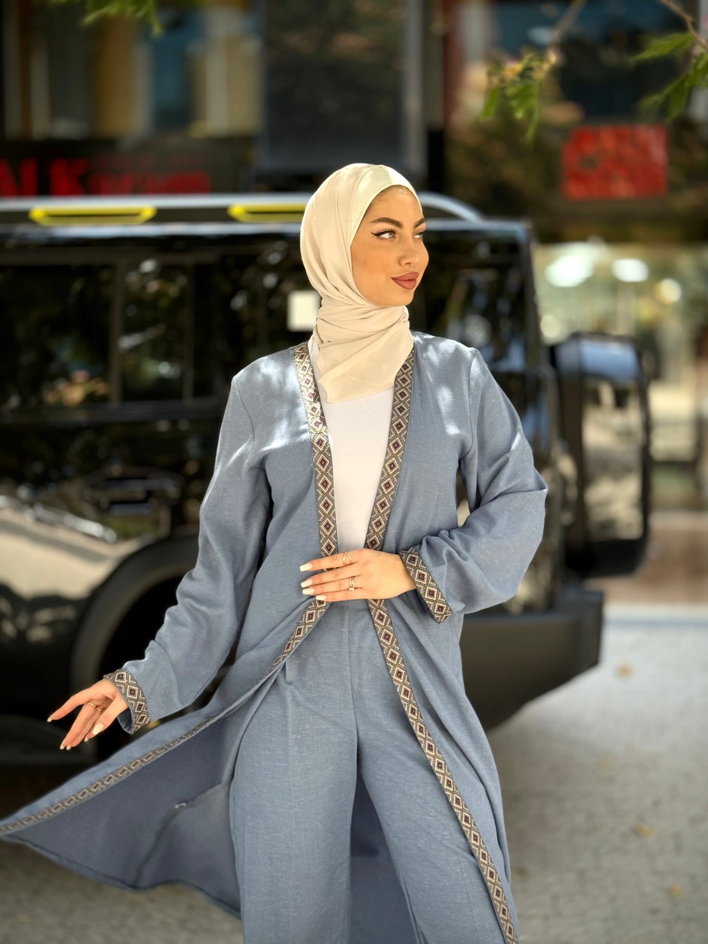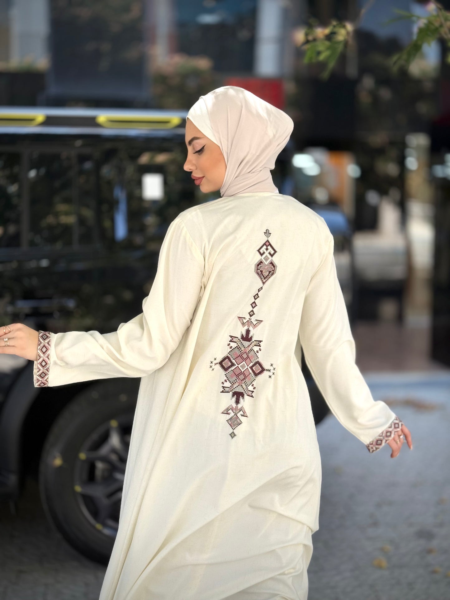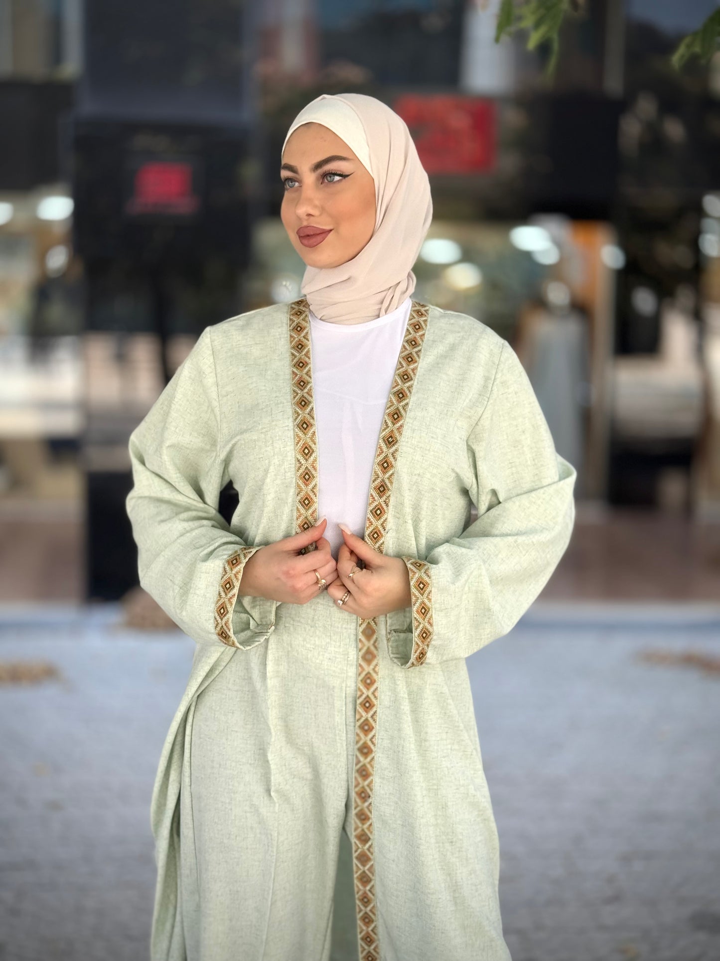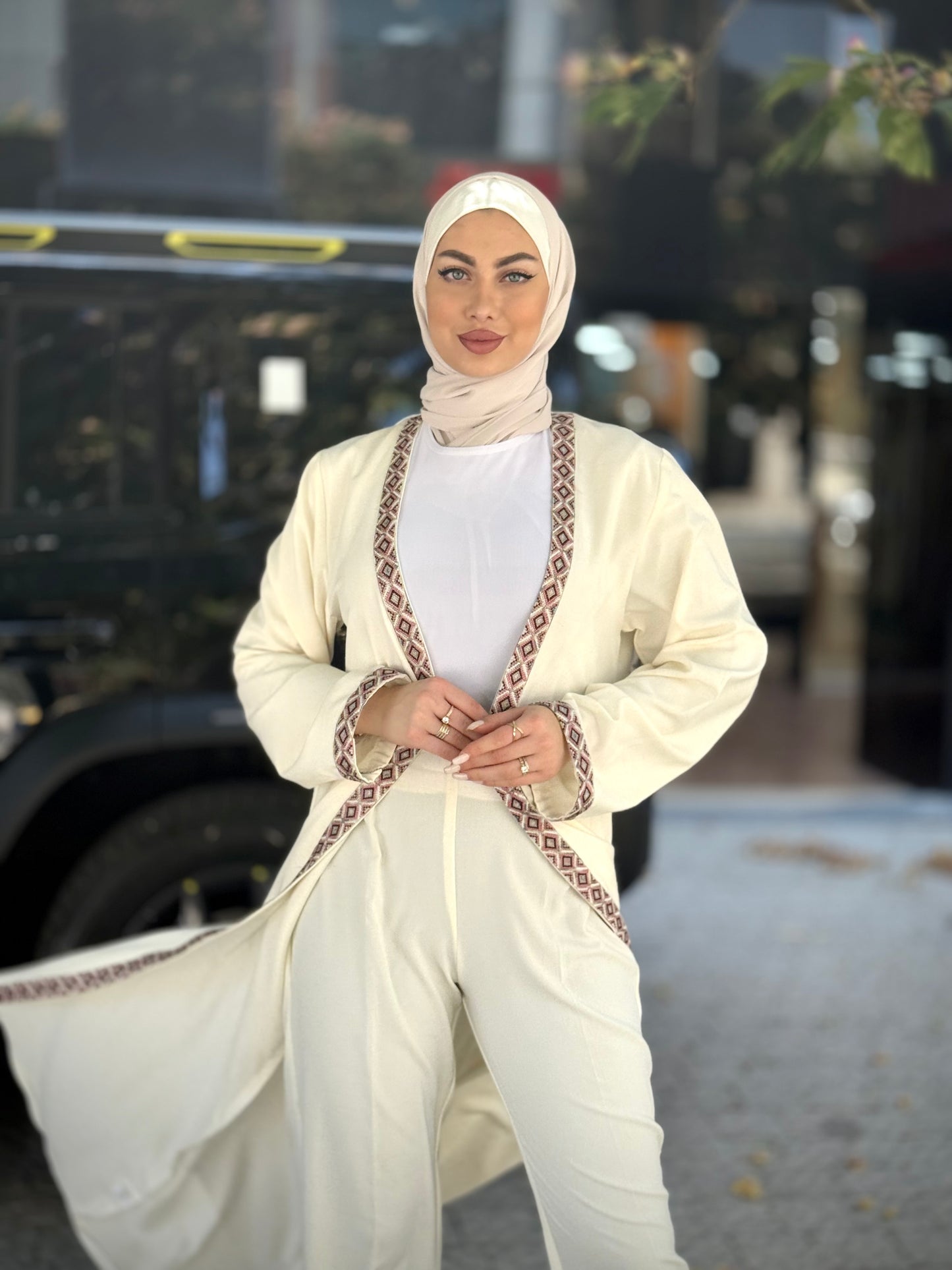 استمتعي بالراحة والأناقة مع مجموعة الكرم قادري للملابس النسائية والعبايات الواسعة والجلابيب العصرية الفخمة والأنيقة لتتألقي بهذه العباءة مع بنطال بقصة انسيابية راقية وتفاصيل من التطريز العصري من الأمام ومن الخلف وعلى الأكمام لإضافة لمسة من الفخامة الهادئة، وهو مثالي للأعمال اليومية والمناسبات .