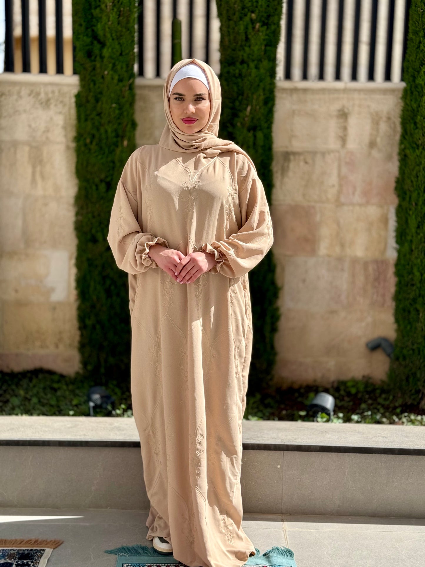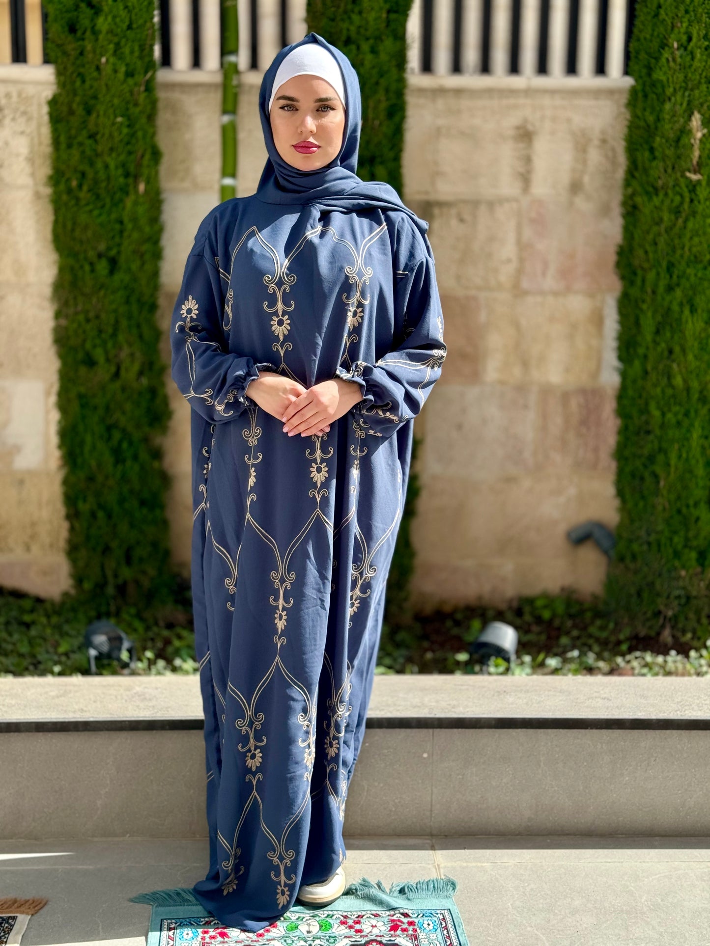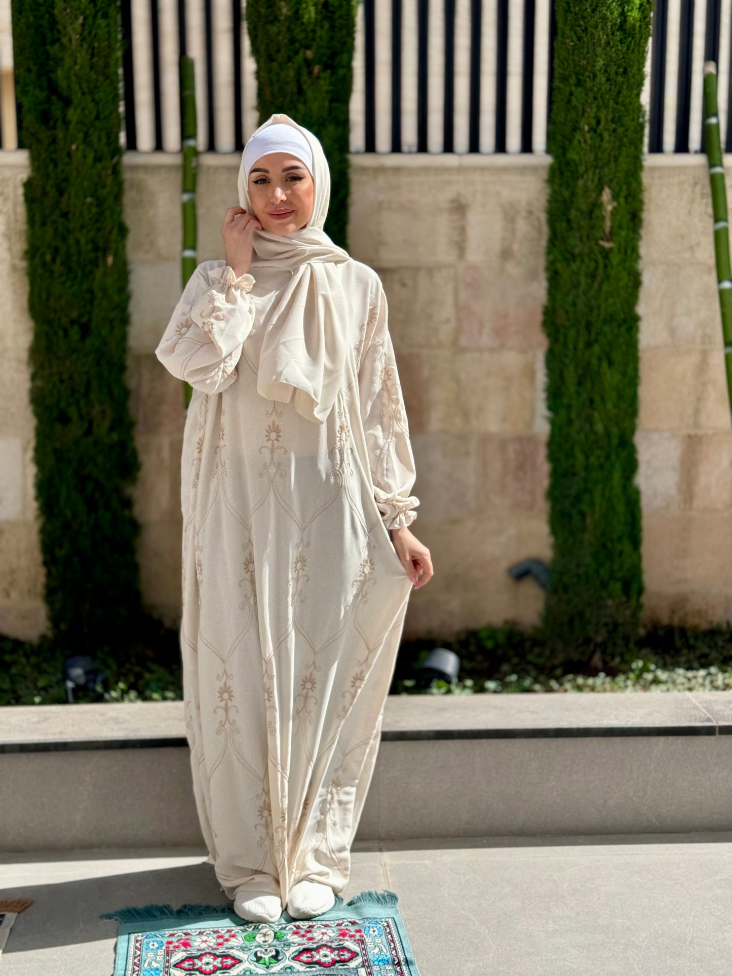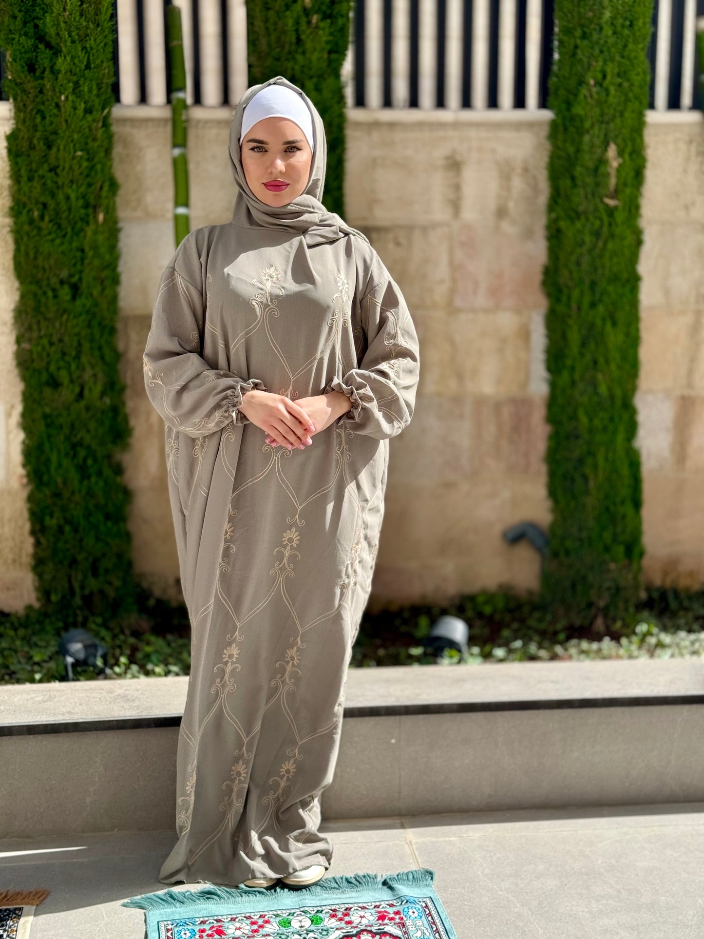 طقم صلاة عملي من مجموعتنا العصرية والأنيقة من أطقم الصلاة، صمم وصنع في الأردن بأفضل أنواع الأقمشة الخفيفة والباردة المعروفة باسم (سي واي) التي لاتَشِف ولا تتأثر بالغسيل وبألوانها العصرية والمميزة. مكون من قطعه واحدة مطرزة بأكمام متصل به شال سادة غير قابل للإزالة، طول القطعة من رأس الكتف 146 سم ومحيط عرضها 150 سم. وطول الشال 160 سم وعرضه 55 سم