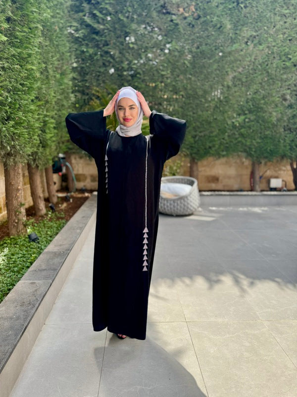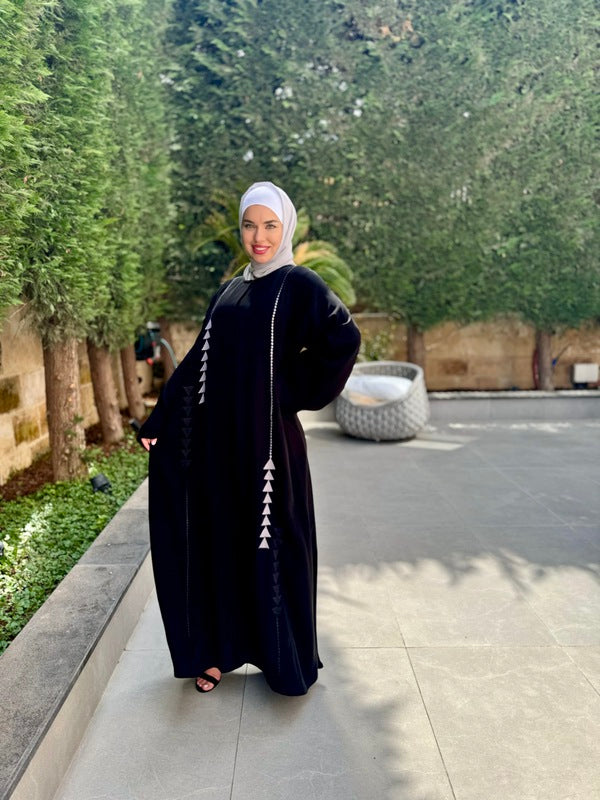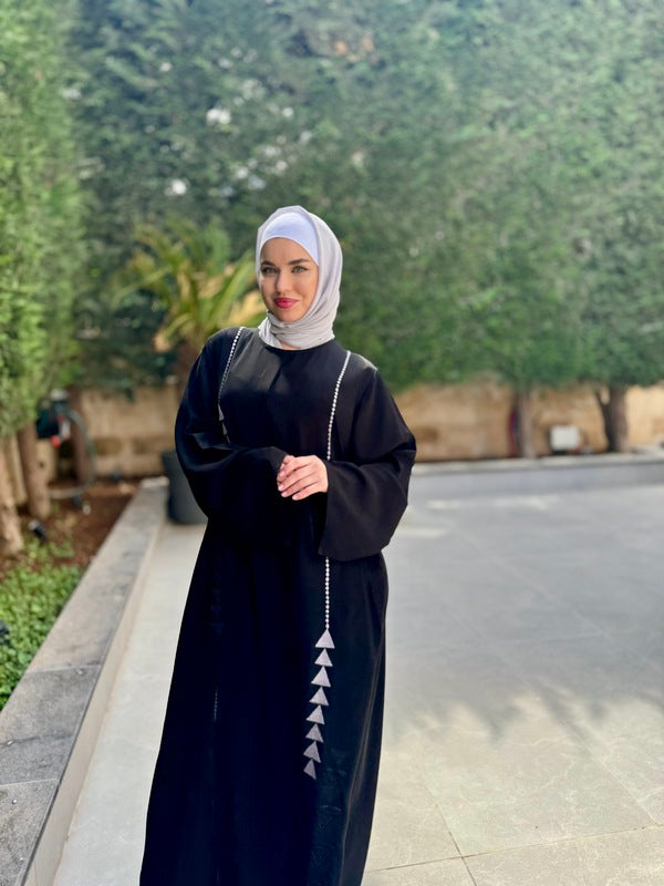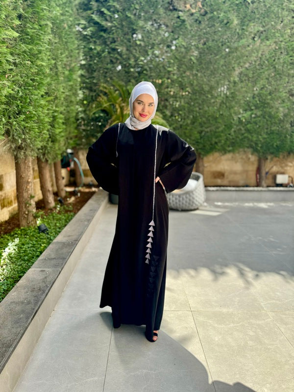 Dazzle in this exquisite Gulf abaya from our modern and elegant collection. Embellished with delicate embroidery and rhinestone details, it boasts a front zipper opening at the upper chest area. Designed and meticulously crafted in Kuwait using the finest fabrics available.