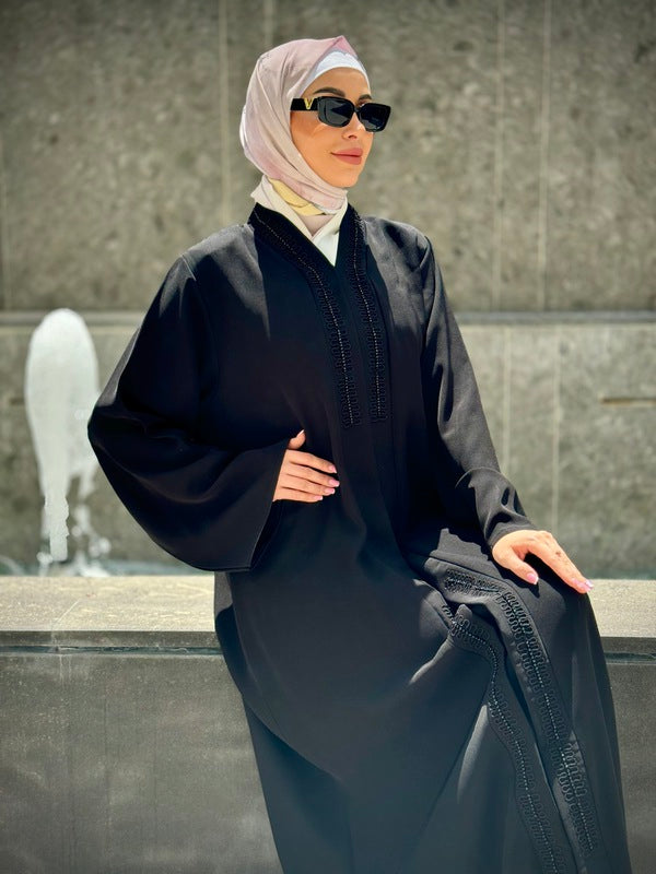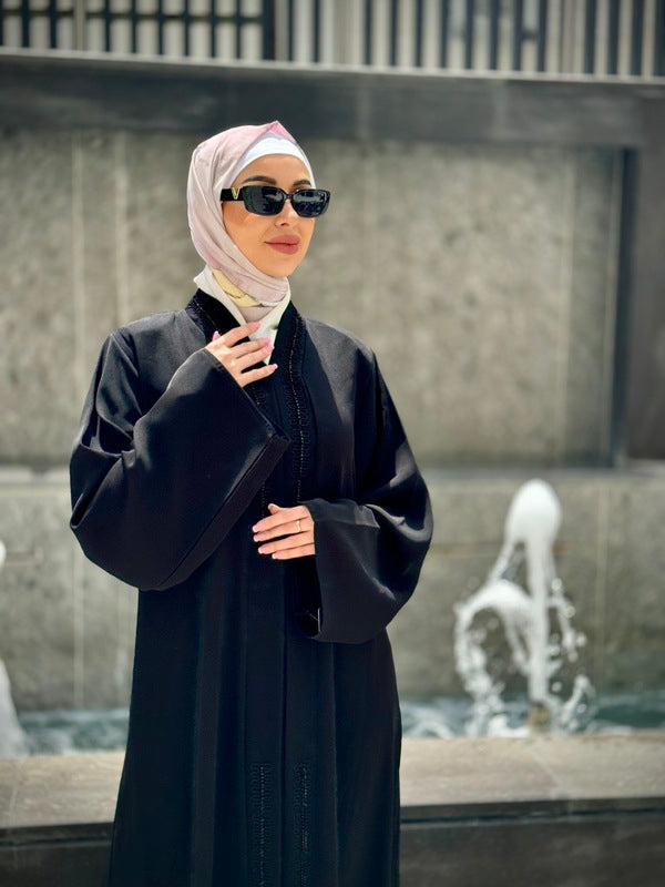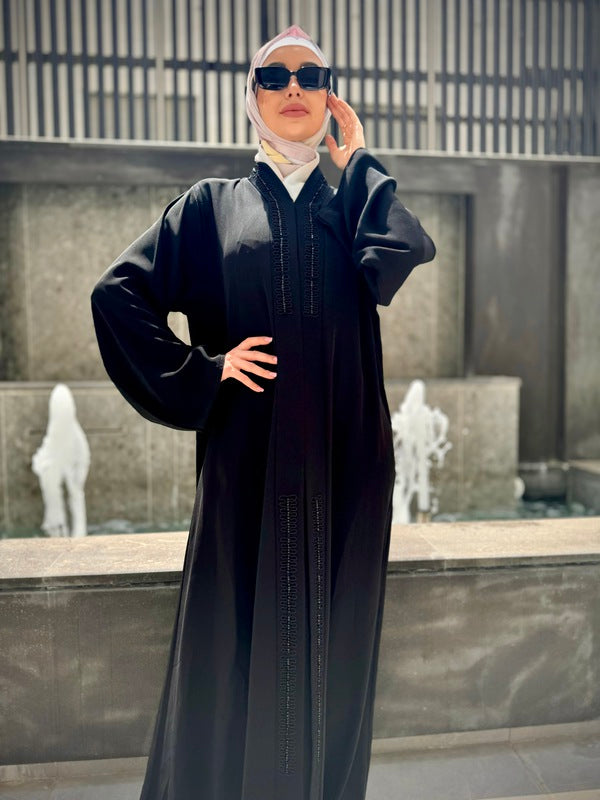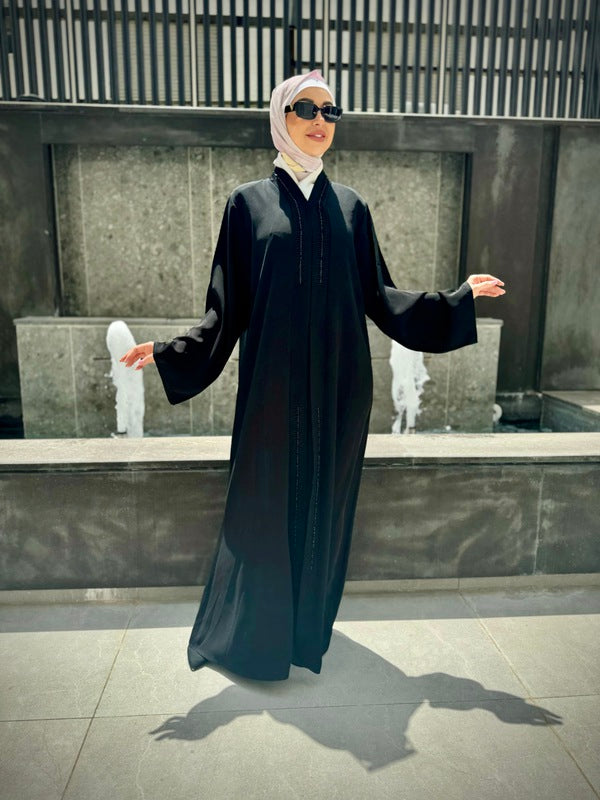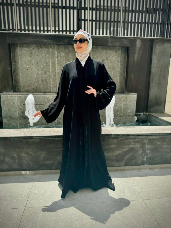 Elevate your style with this exceptional Gulf abaya from our modern and chic collection. Adorned with simple embroidery and rhinestone details, it's closed with a zipper at the upper chest area for a refined touch. Designed and crafted in Kuwait using the finest fabrics available.