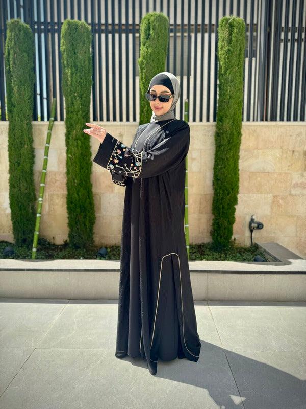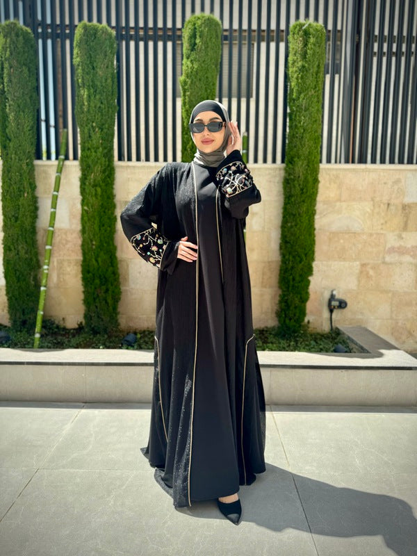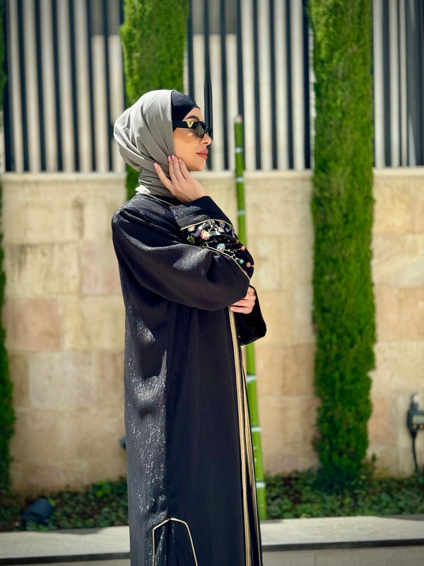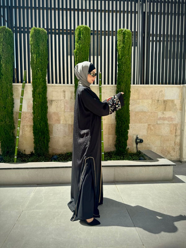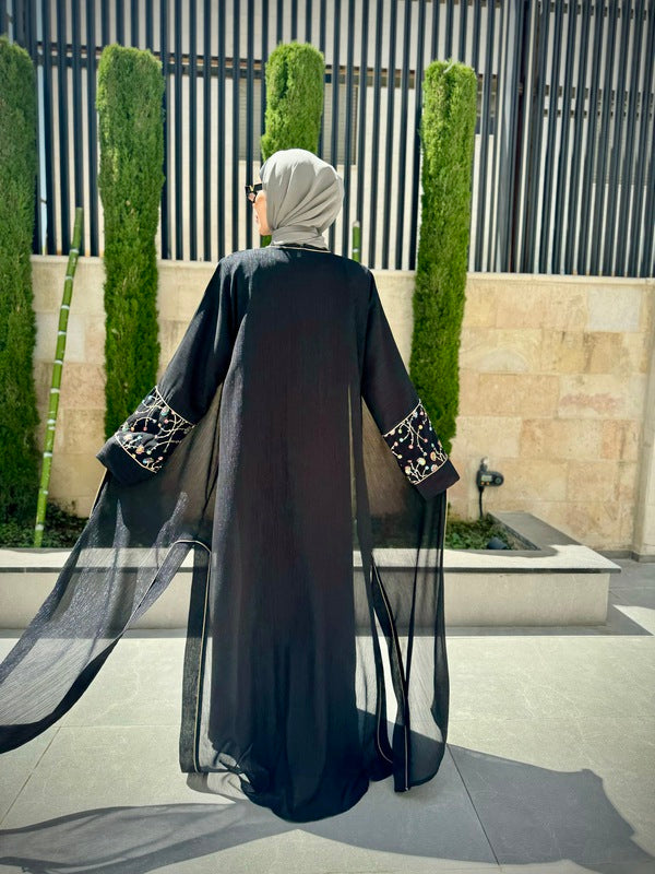 Introducing our innovative two-piece abaya, distinguished by the interplay of its fabrics. The inner piece is closed from the front with a back zipper, while the outer piece remains open, providing a unique and distinctive appearance from our modern and elegant collection. Designed and crafted in Jordan using the finest fabrics.