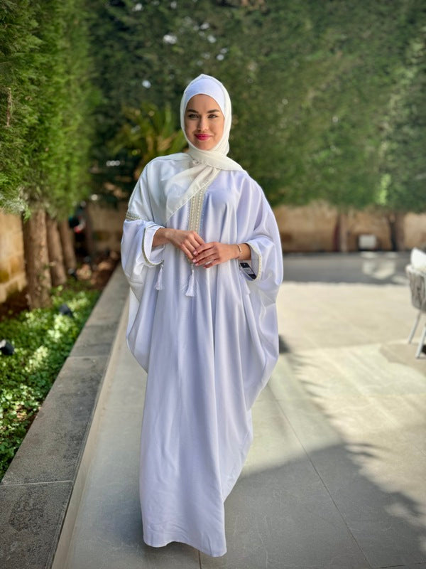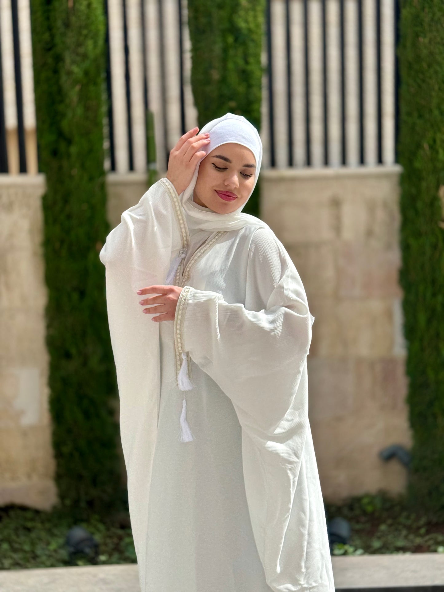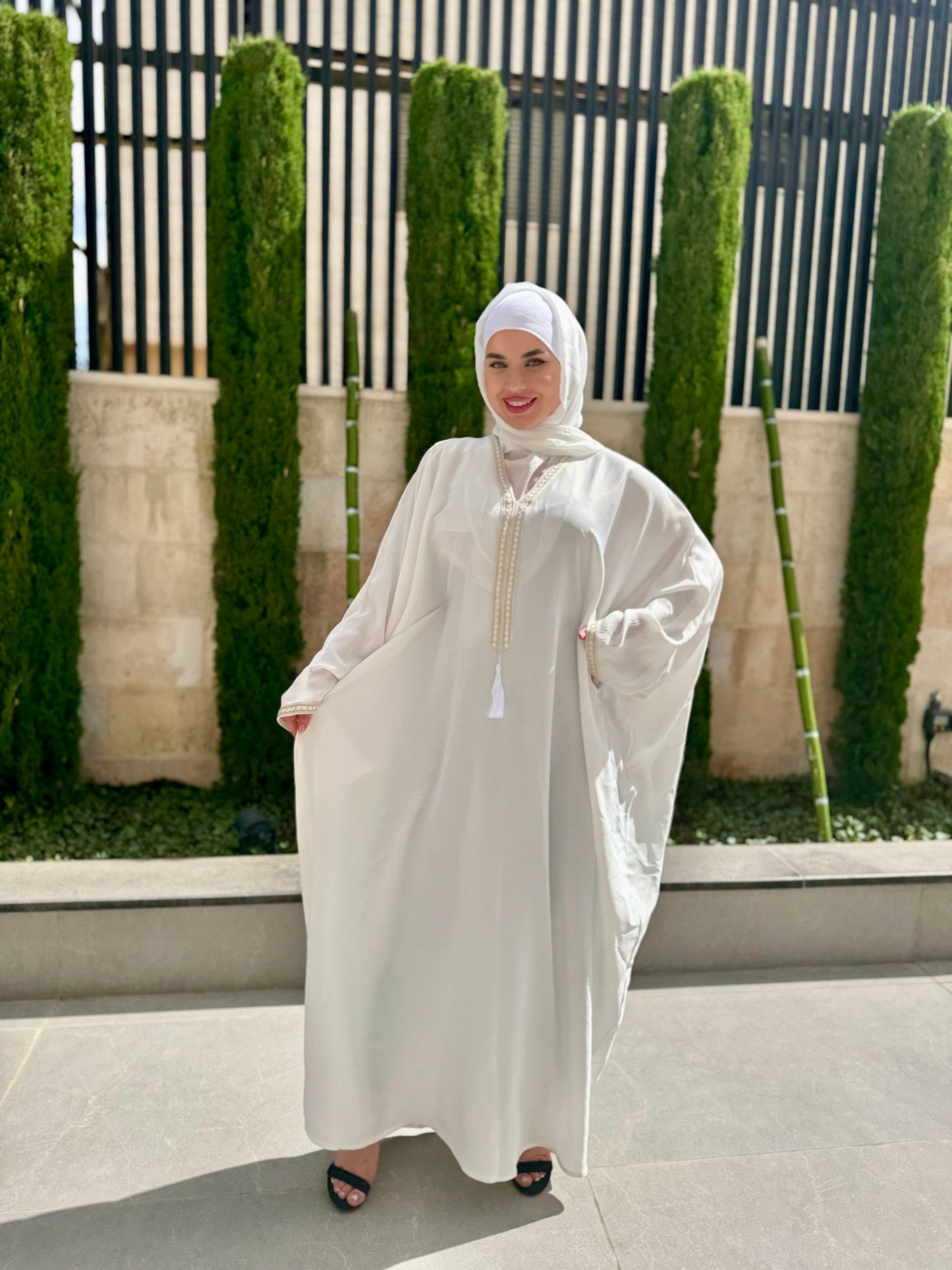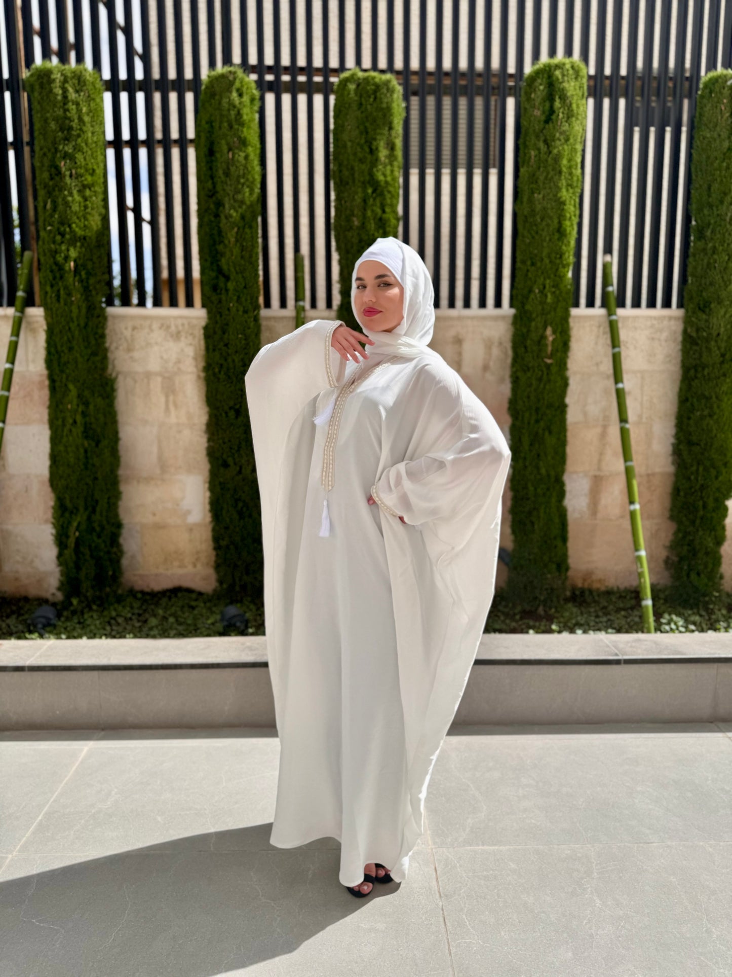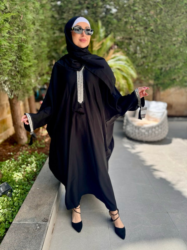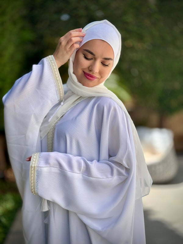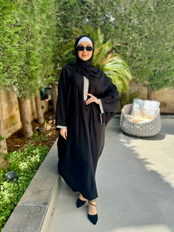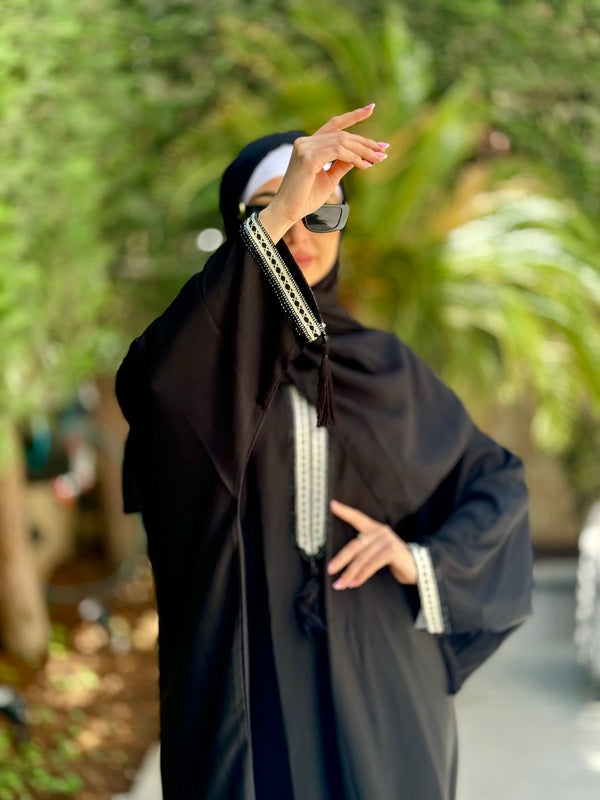 Elevate your style with this elegant Gulf abaya from our modern and chic collection. Adorned with simple embroidery and rhinestone details, it's closed from the front and comes with a practical and stylish shawl. Designed and crafted in the UAE using the finest fabrics.