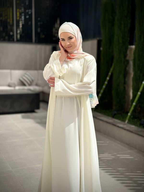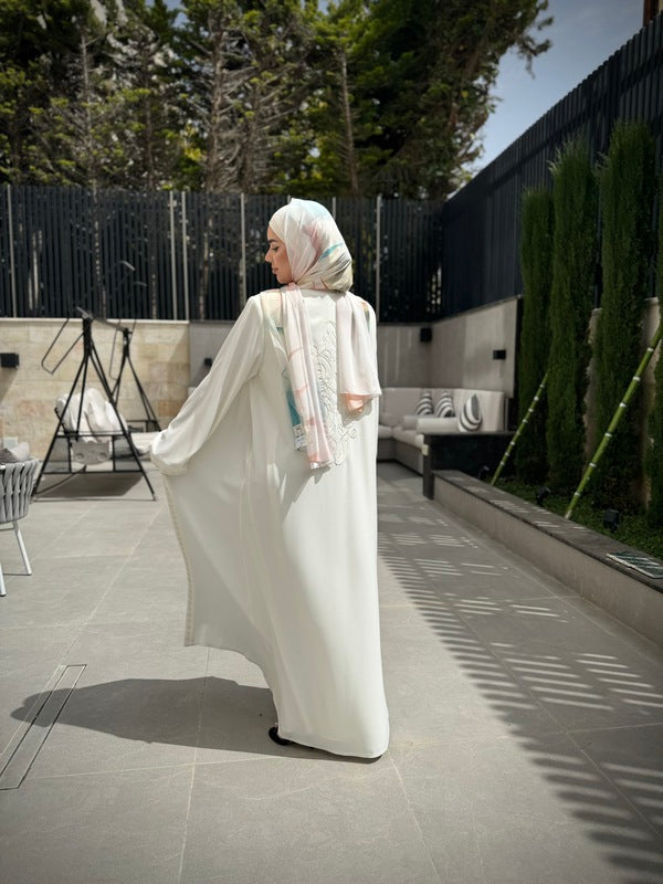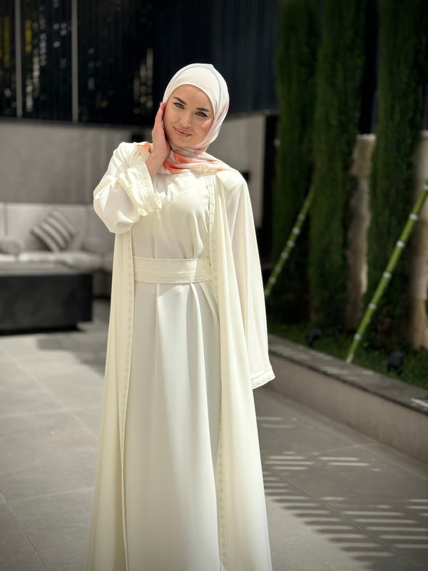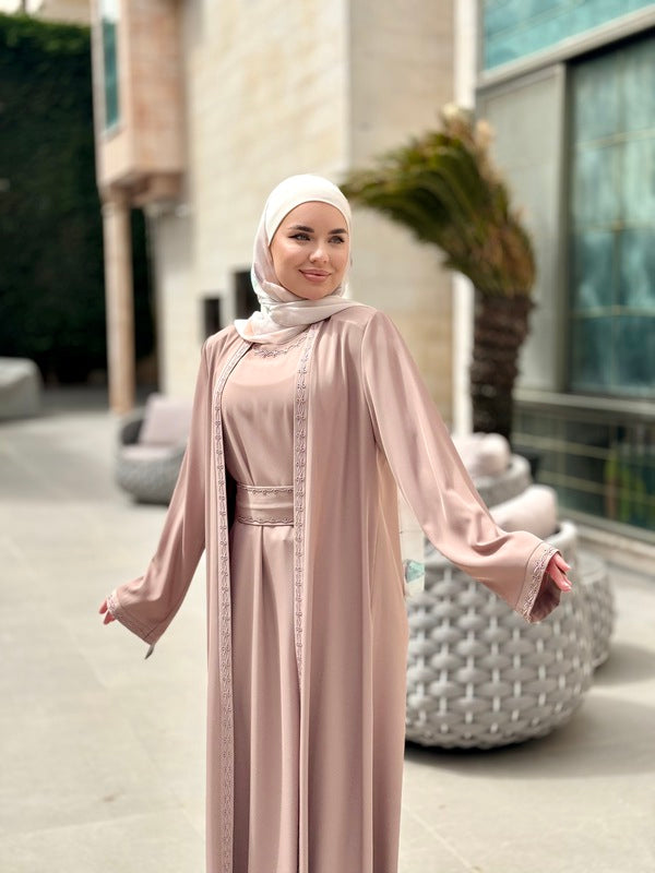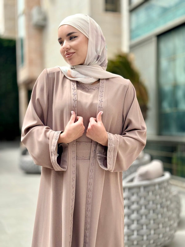 Regular price $40.99 USDDiscover our elegant two-piece abaya, seamlessly blending style and practicality. The inner piece features a closed front with a zip closure at the back, complemented by an embroidered belt for a cinched waist look. The outer piece is open, adorned with embroidery on both the front and back, offering a unique and distinctive appearance from our modern and chic collection. Designed and crafted in Jordan using the finest fabrics.