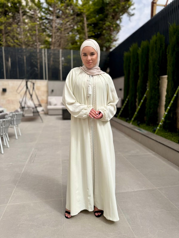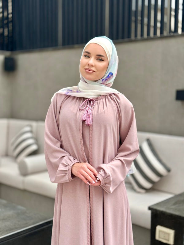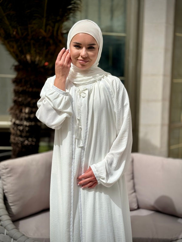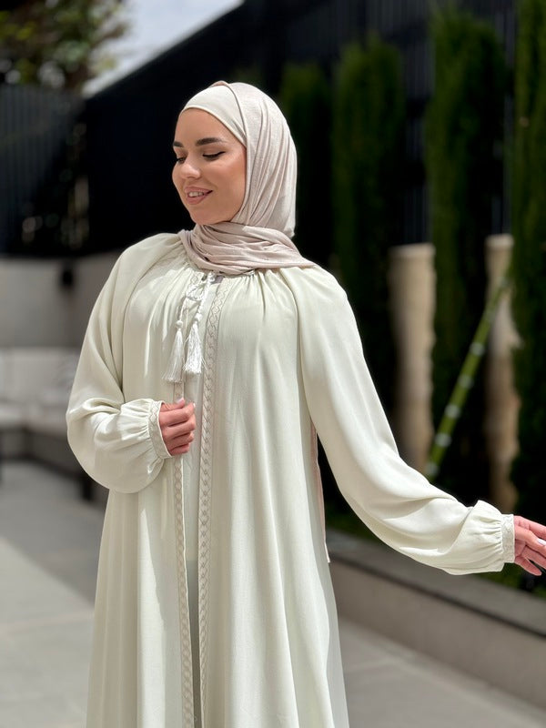 Crafted with sophistication and functionality in mind, our two-piece abaya offers versatility and style. The inner piece is securely closed at the front with a zipper at the back, while the outer piece remains open. Adorned with embroidery on the front and sleeves, this ensemble promises a unique and distinguished look from our modern and chic collection. Designed and crafted in Jordan using the finest fabrics.