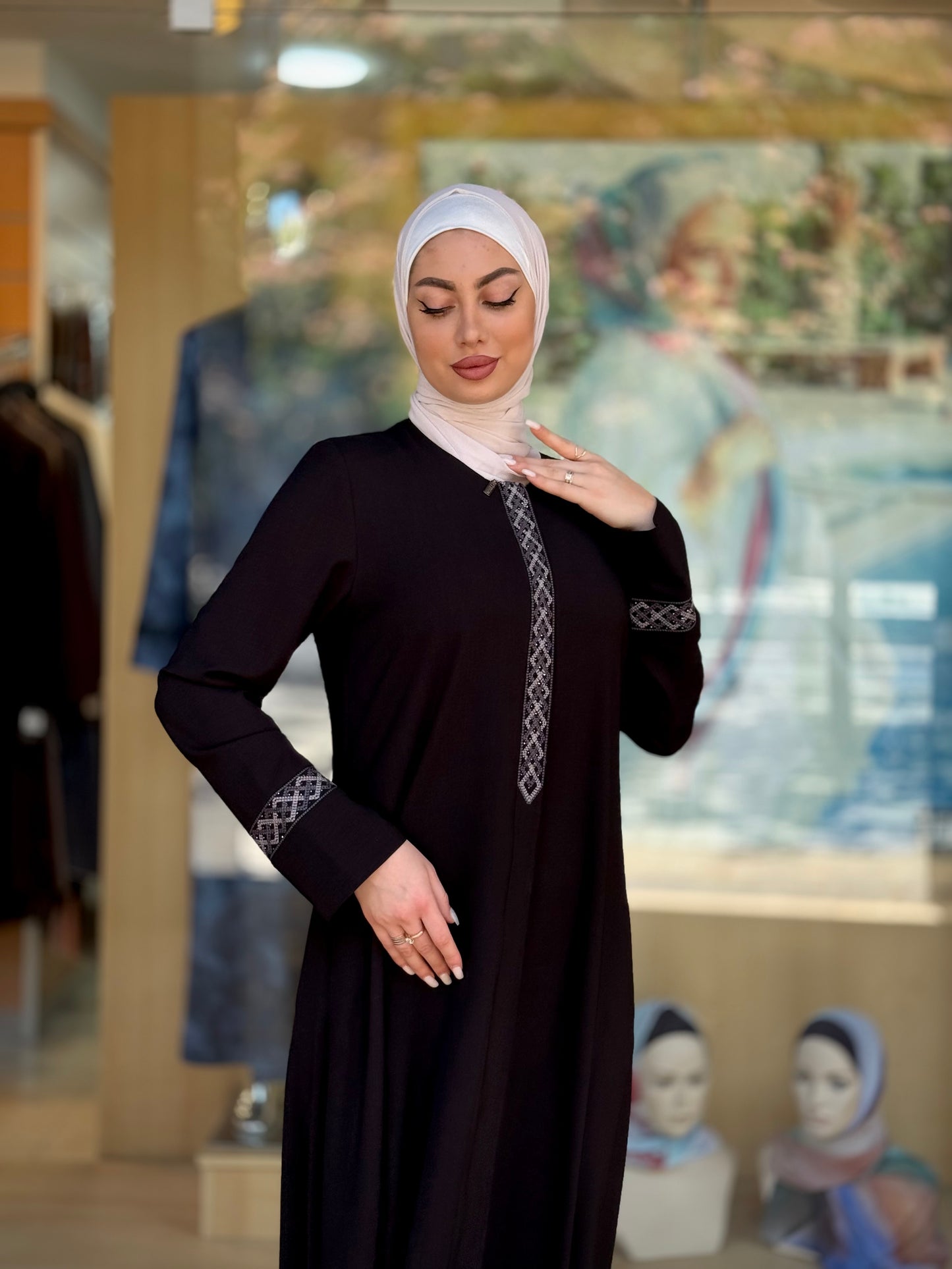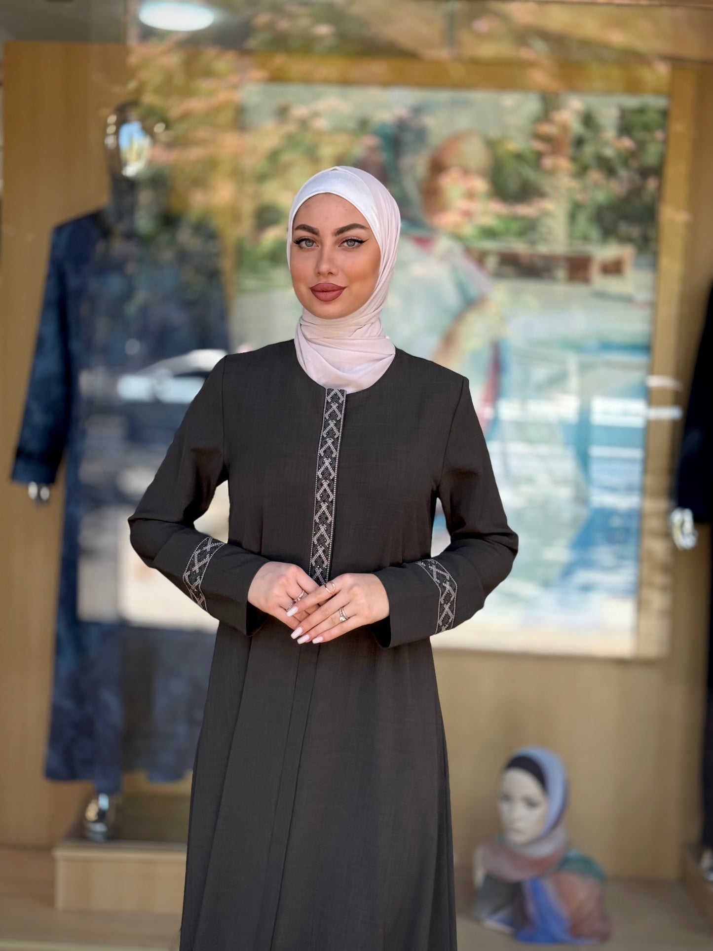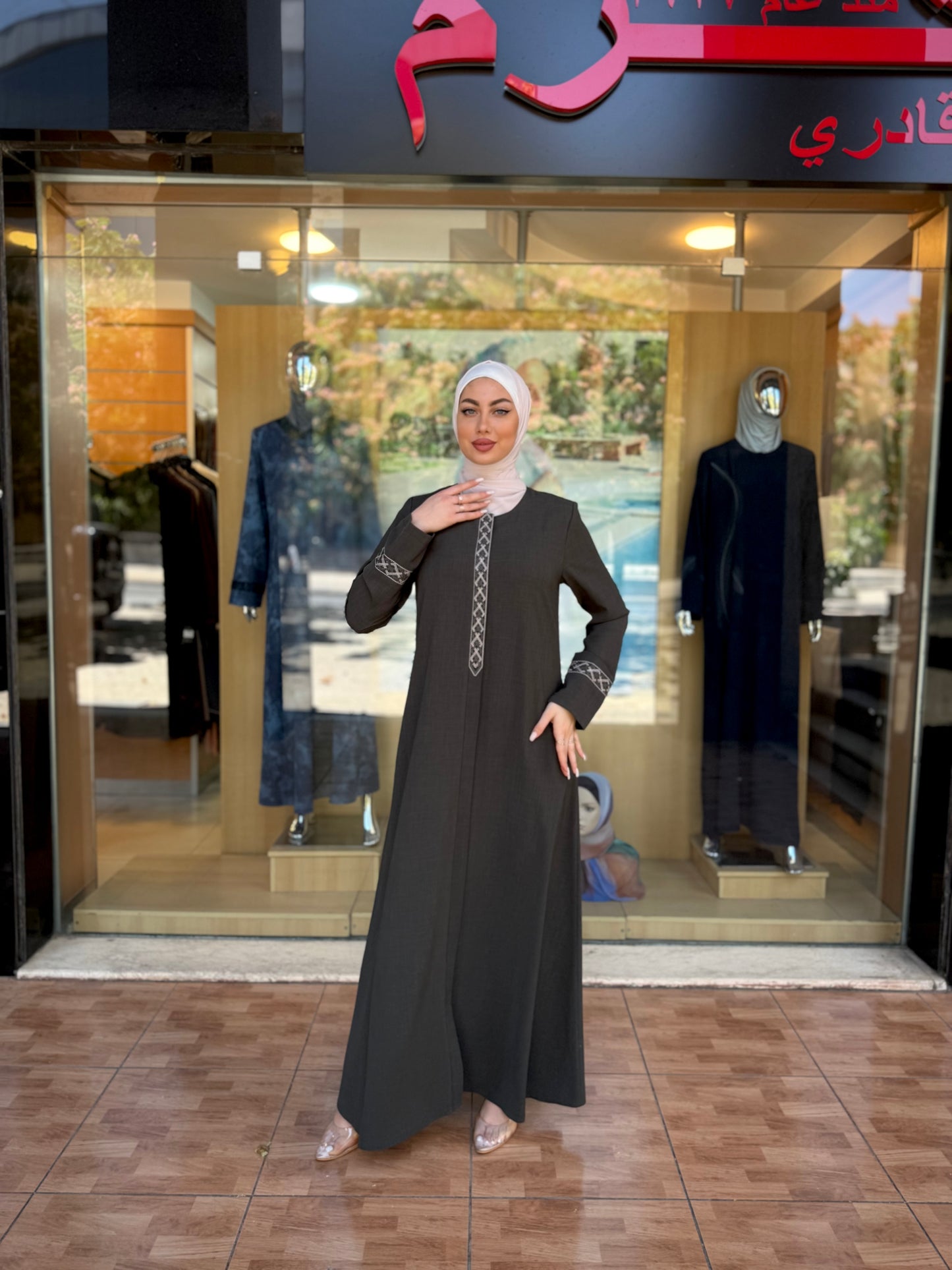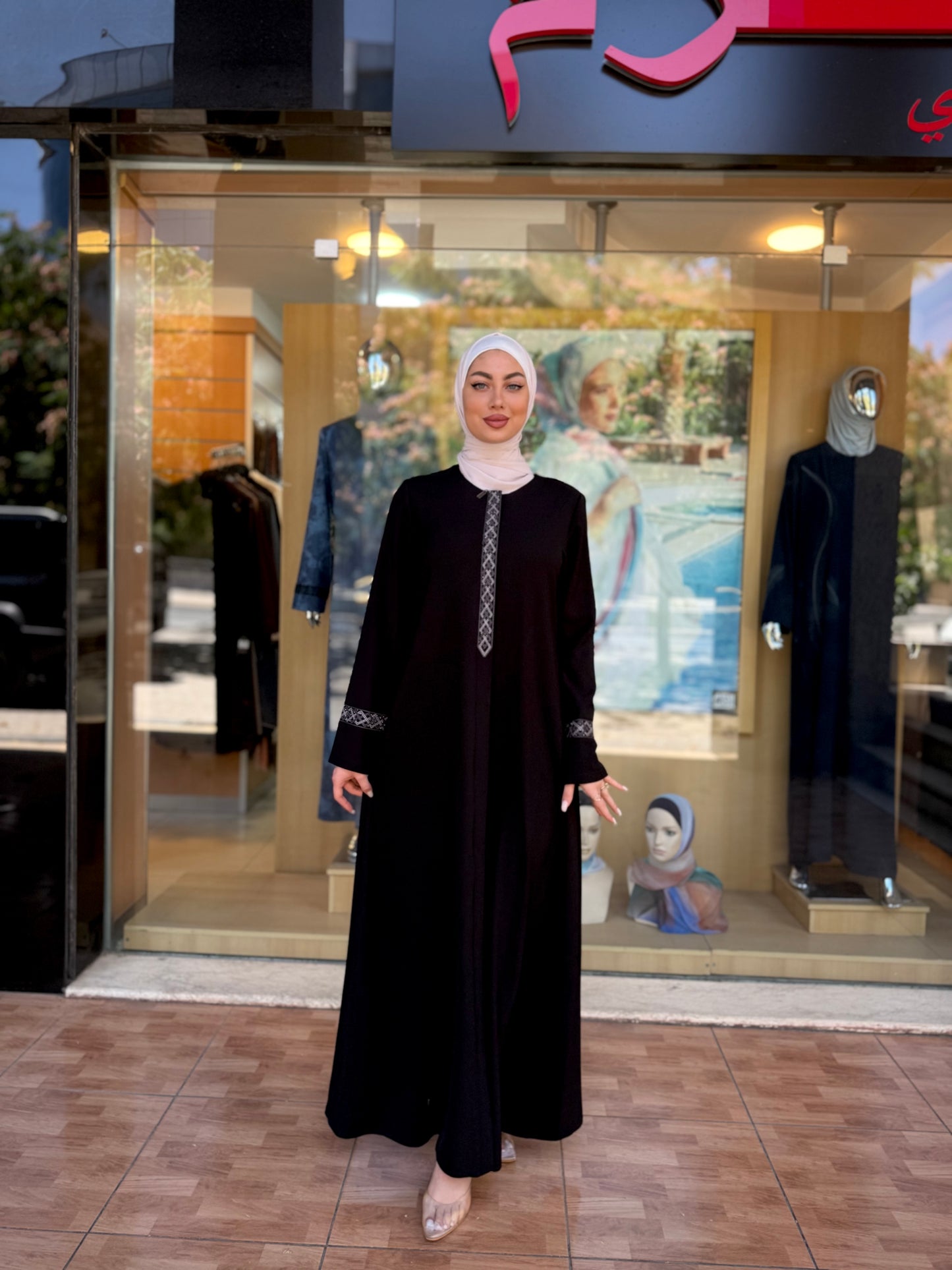 This modern abaya features a graceful, flowing cut with delicate embroidery on the chest and sleeves, adding a touch of quiet sophistication.