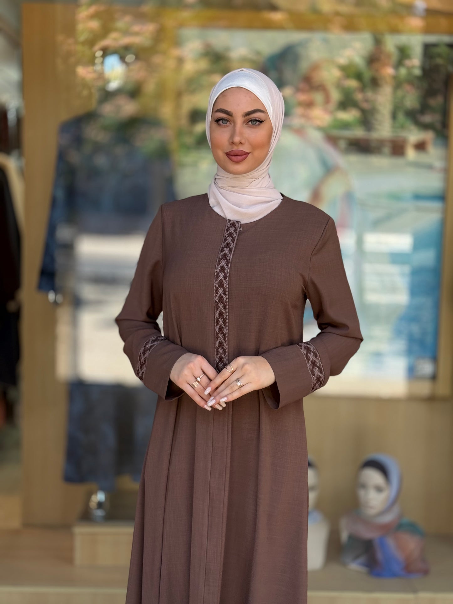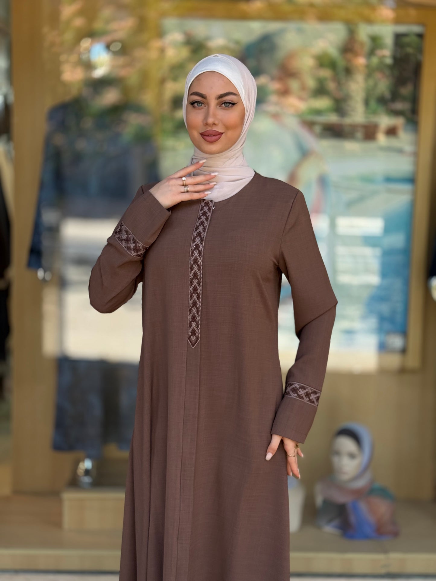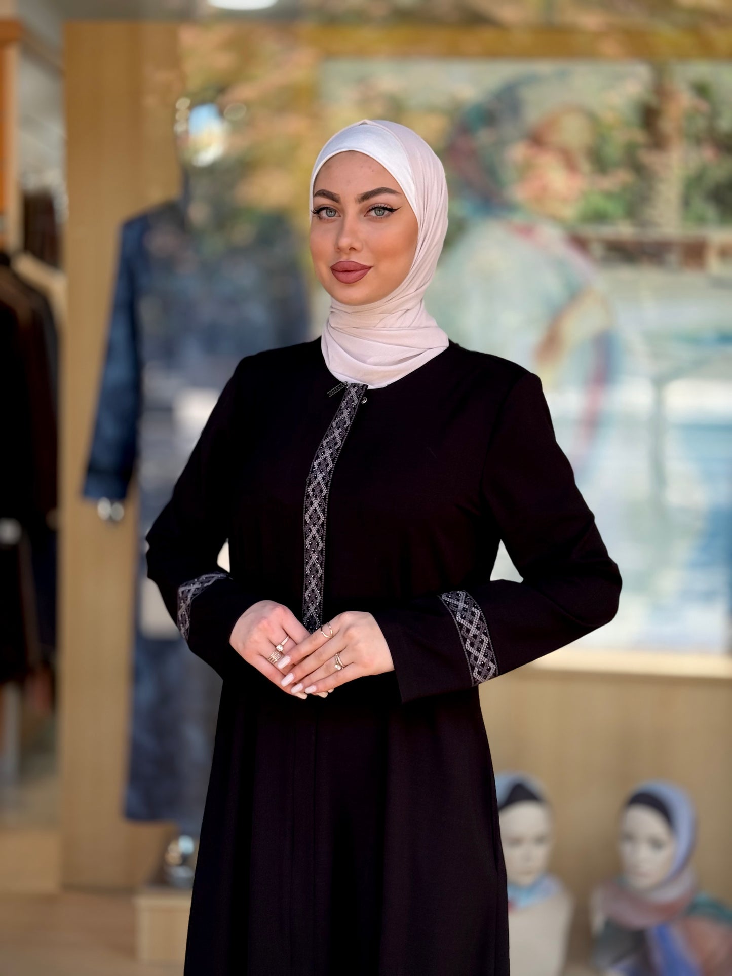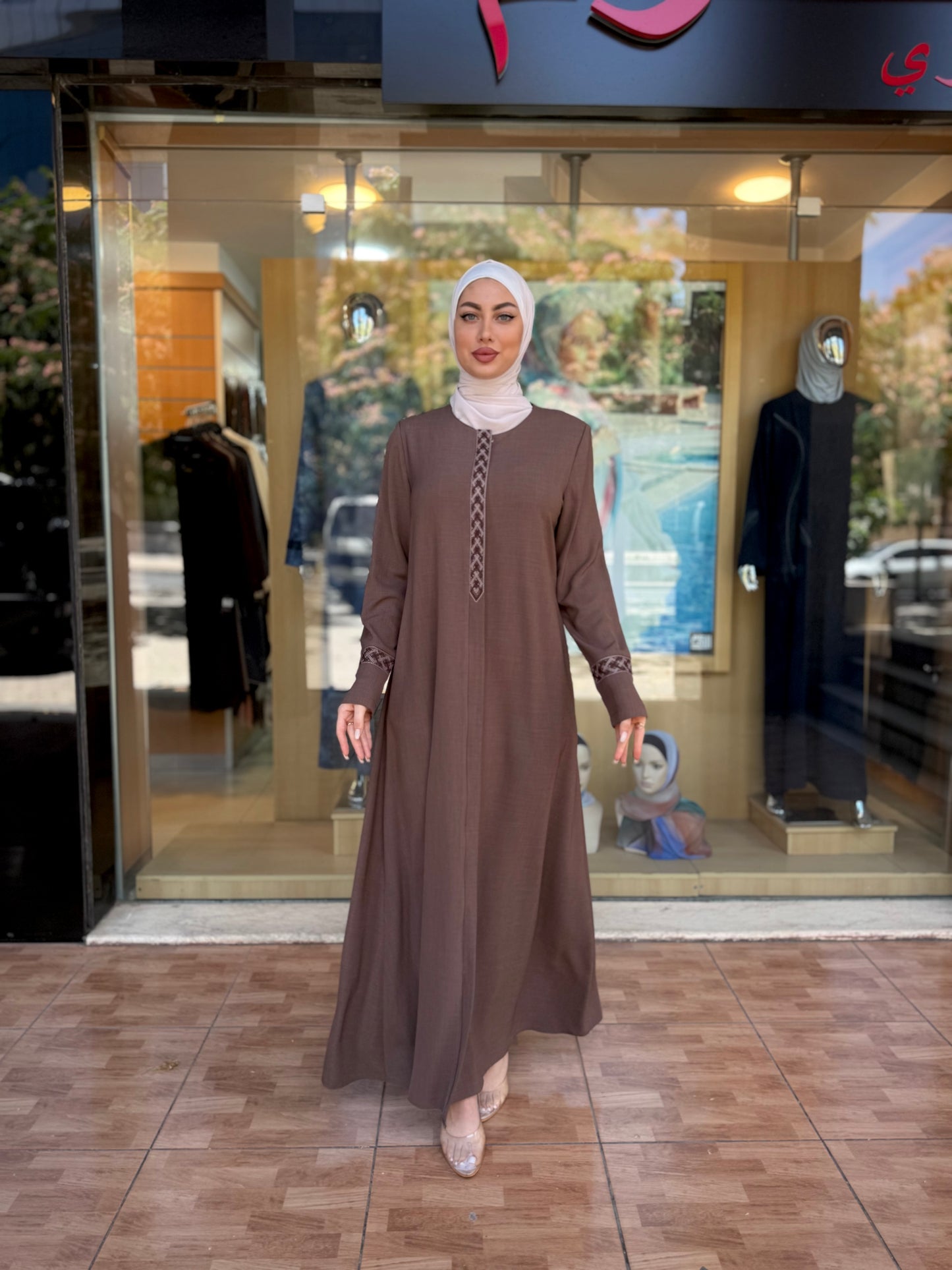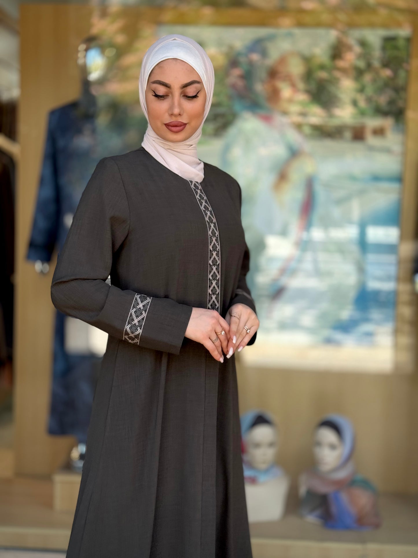 This modern abaya features a graceful, flowing cut with delicate embroidery on the chest and sleeves, adding a touch of quiet sophistication.