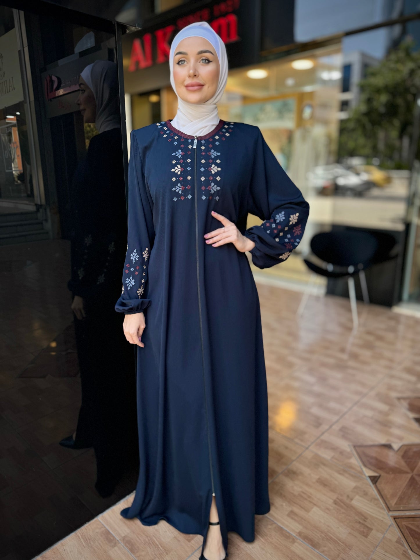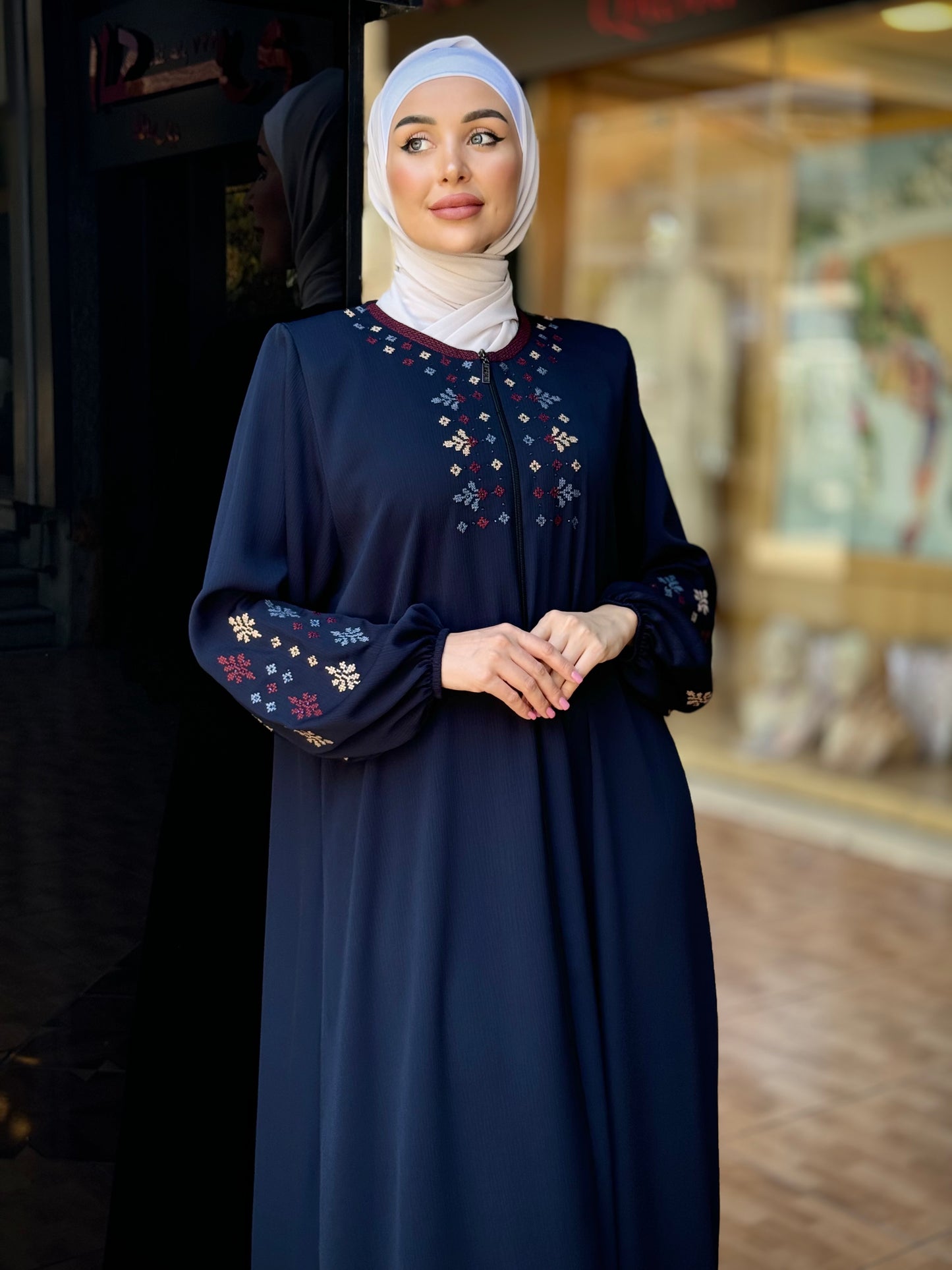 The sleeves are loose with embroidery that gradually descends, giving a chic, modern look.