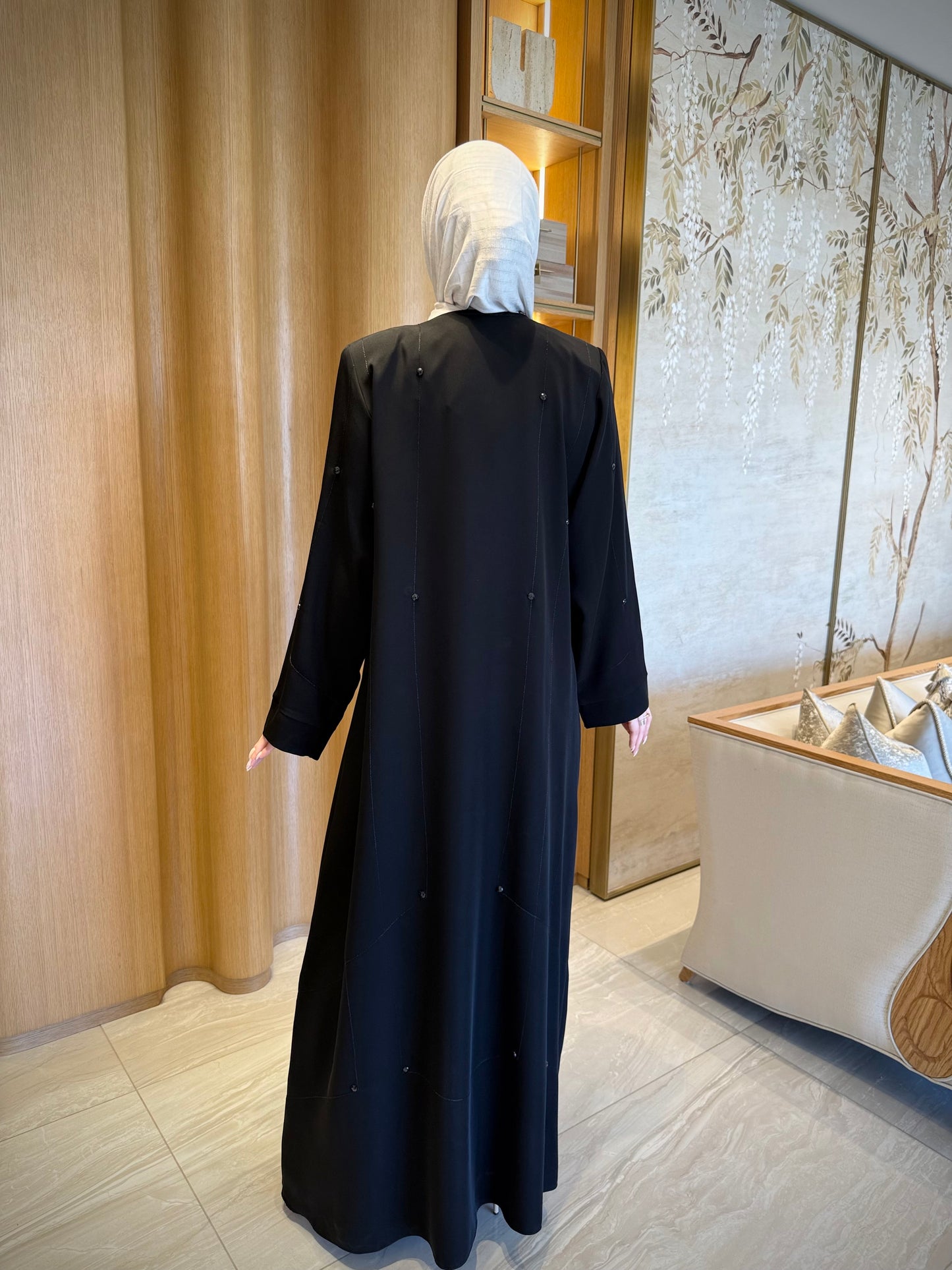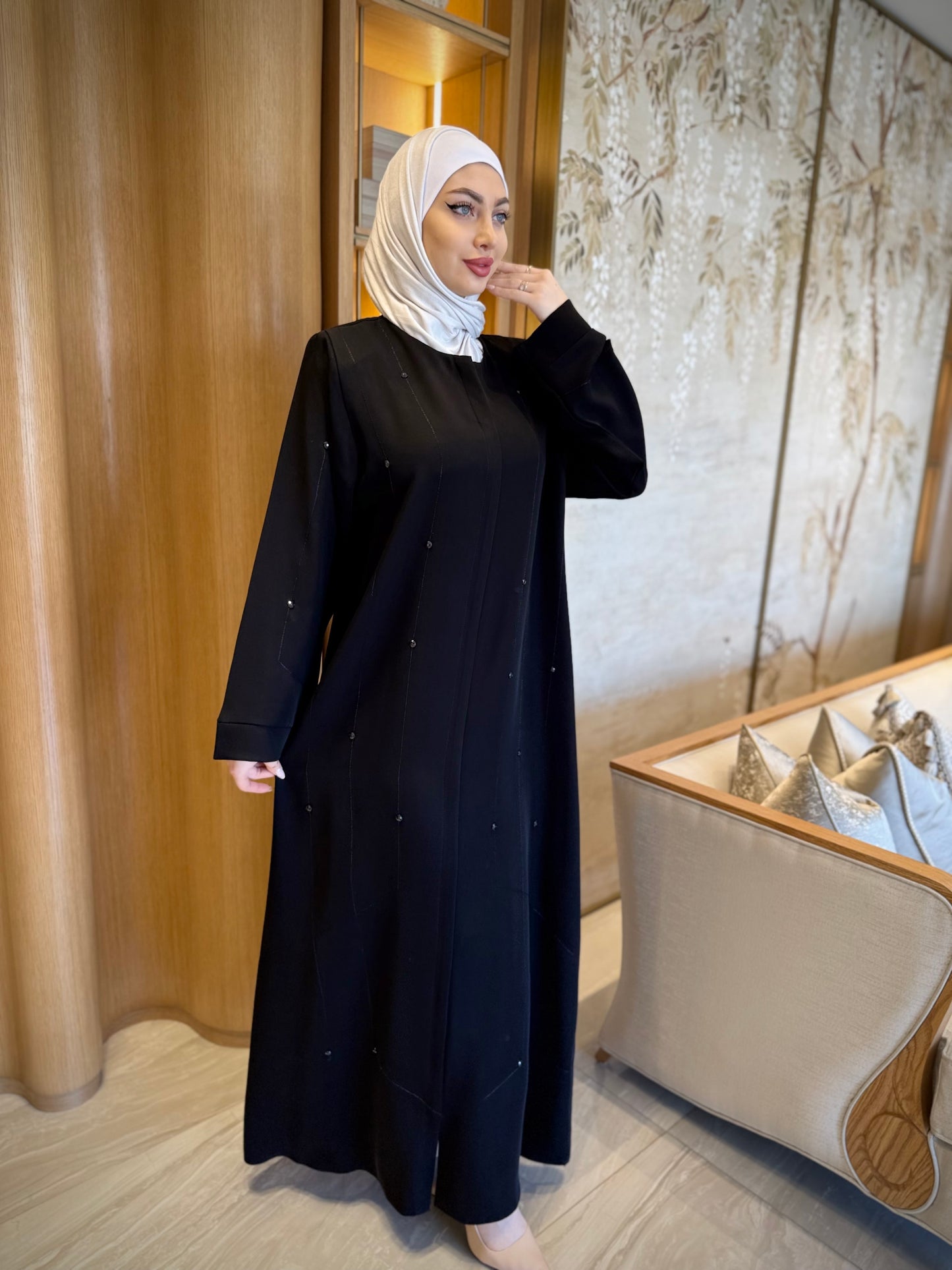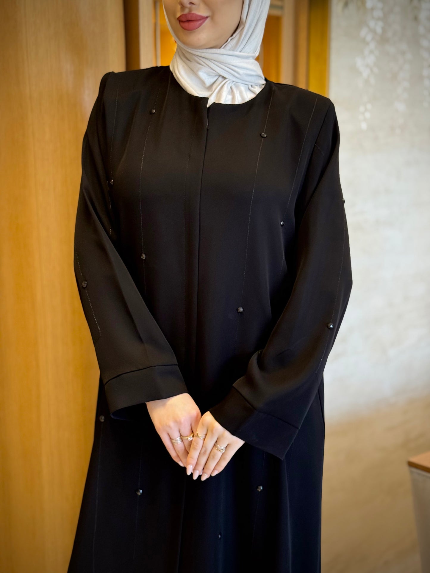 An abaya adorned with hand-beaded embroidery on the front, back, and sleeves, for a complete and elegant everyday look