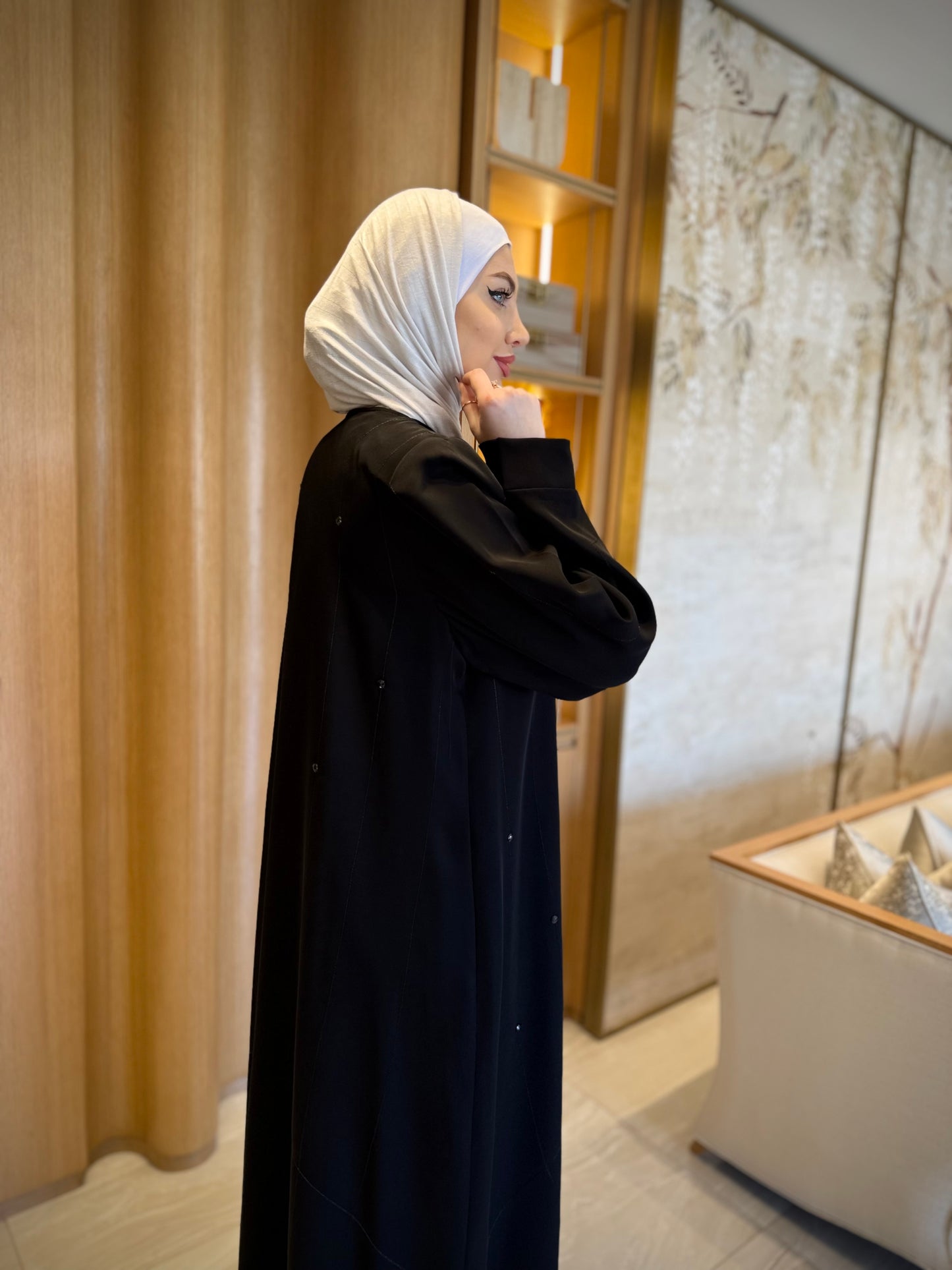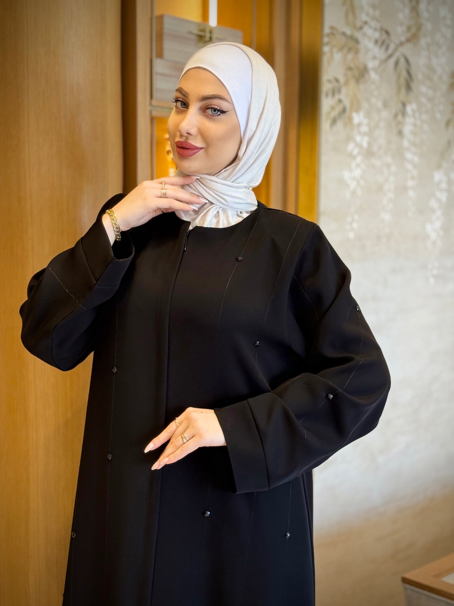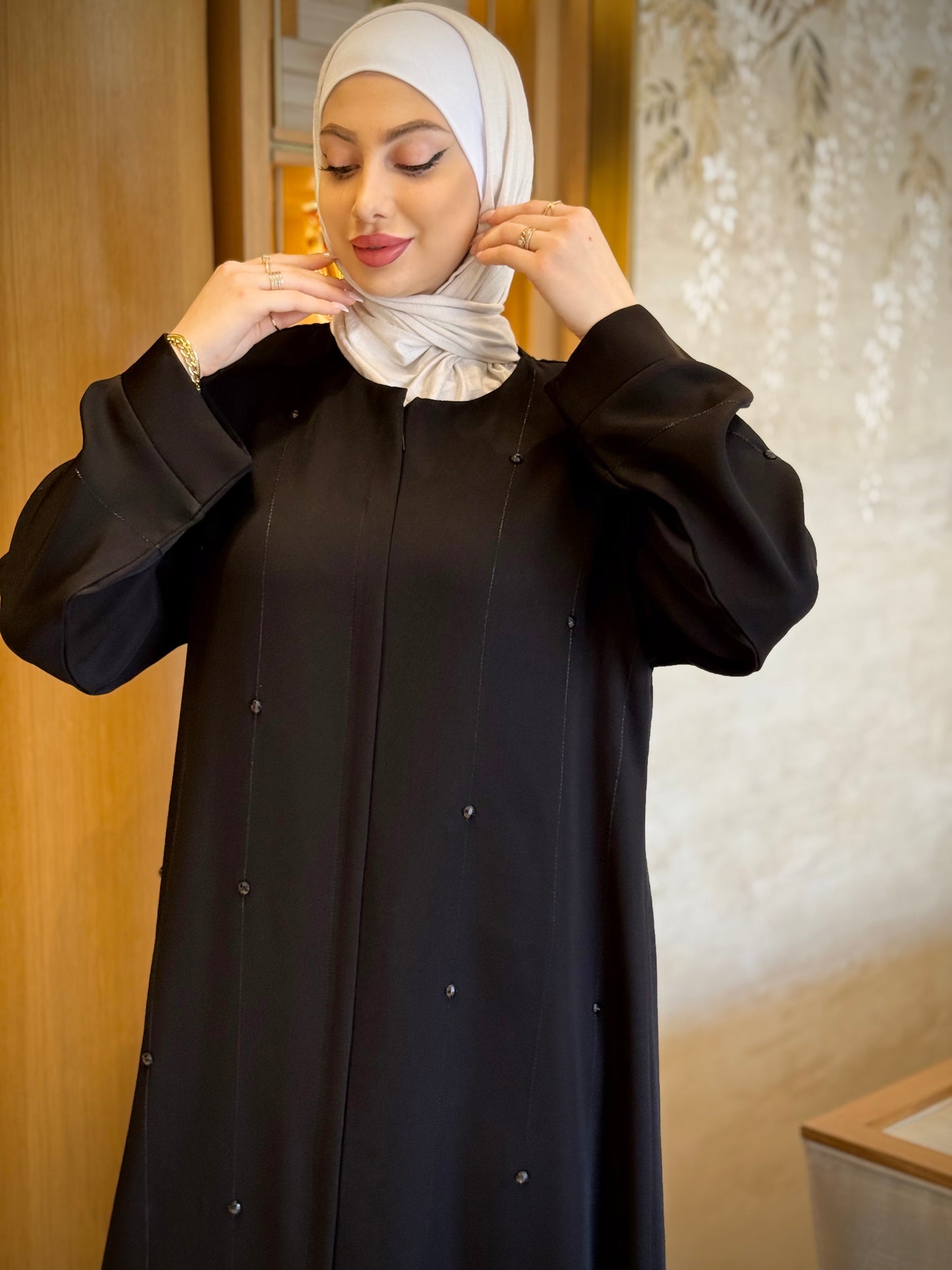 An abaya adorned with hand-beaded embroidery on the front, back, and sleeves, for a complete and elegant everyday look