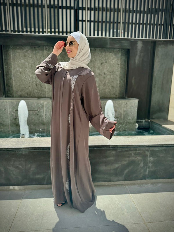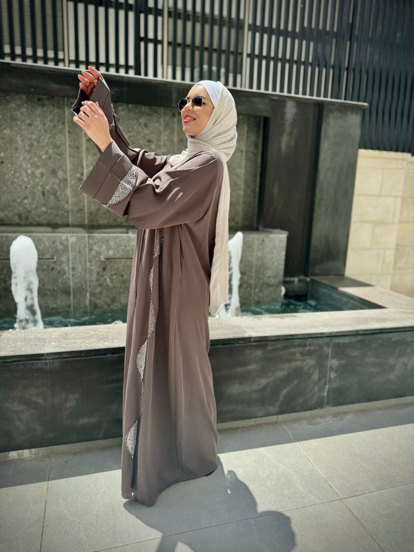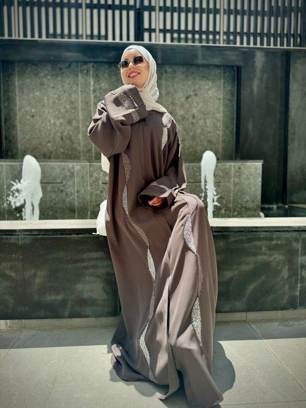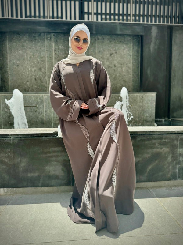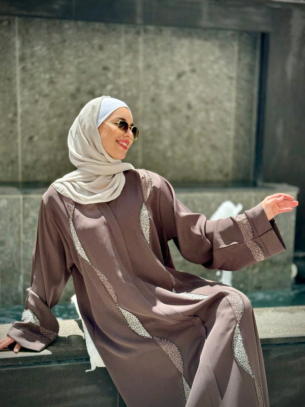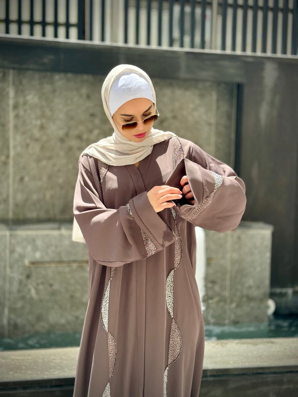 Step into elegance with this exceptional Gulf abaya from our modern and chic collection. Adorned with simple embroidery and rhinestone details, it's closed with a zipper at the upper chest area for a sleek finish. Designed and crafted in Kuwait using the finest fabrics.