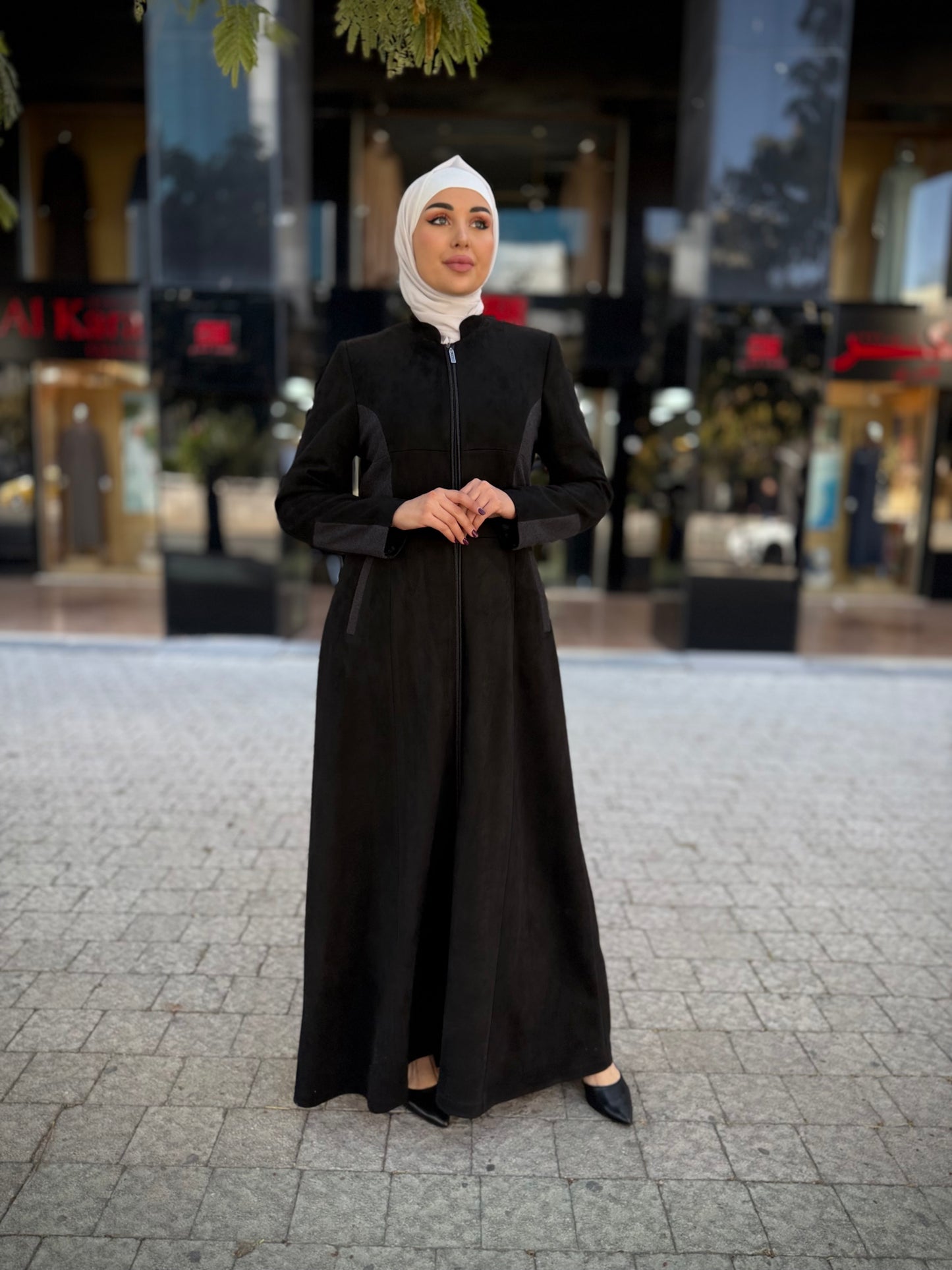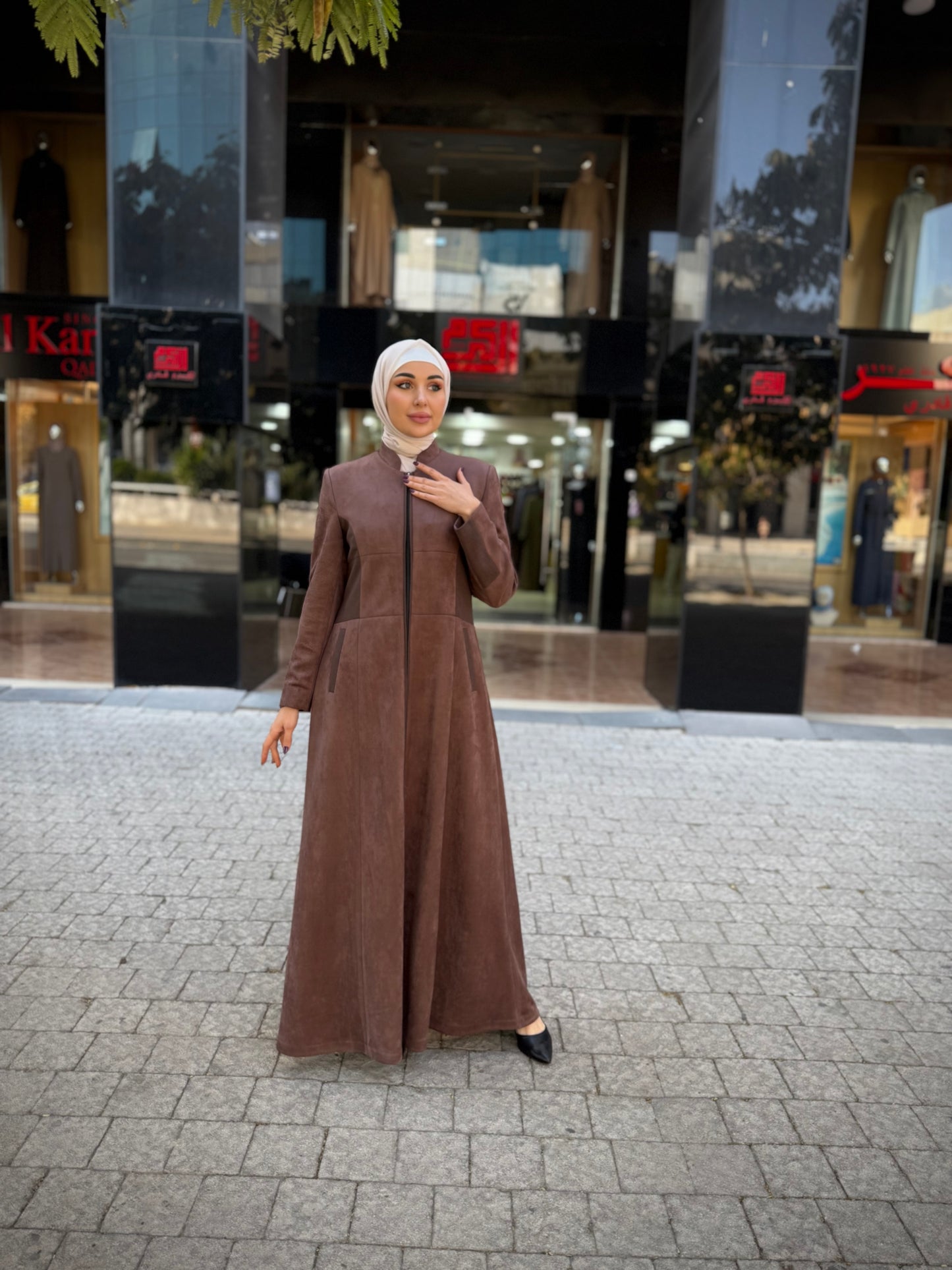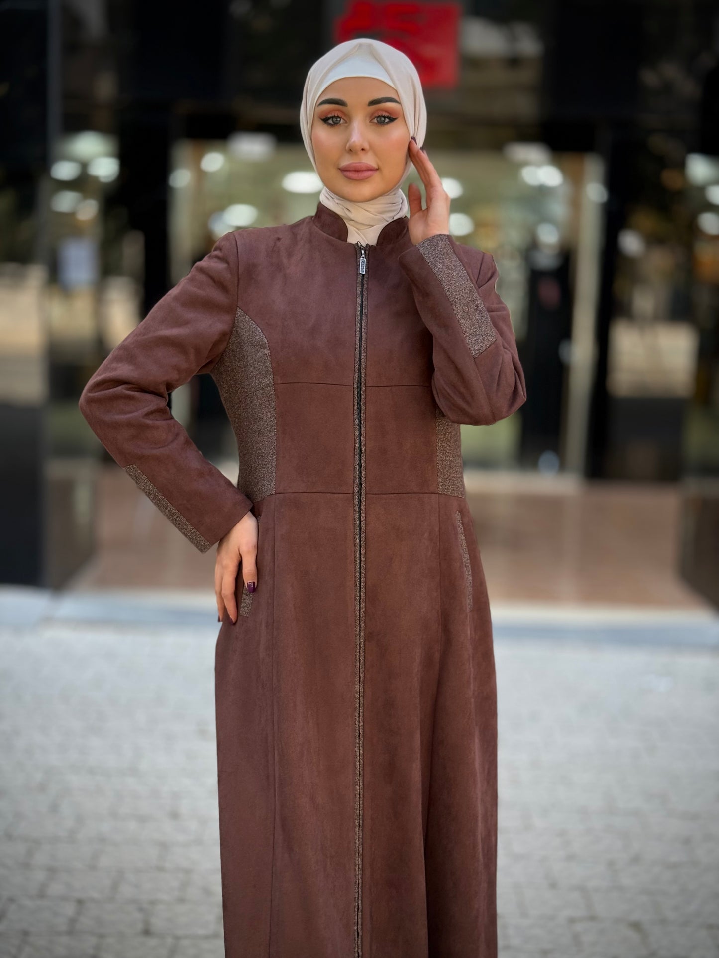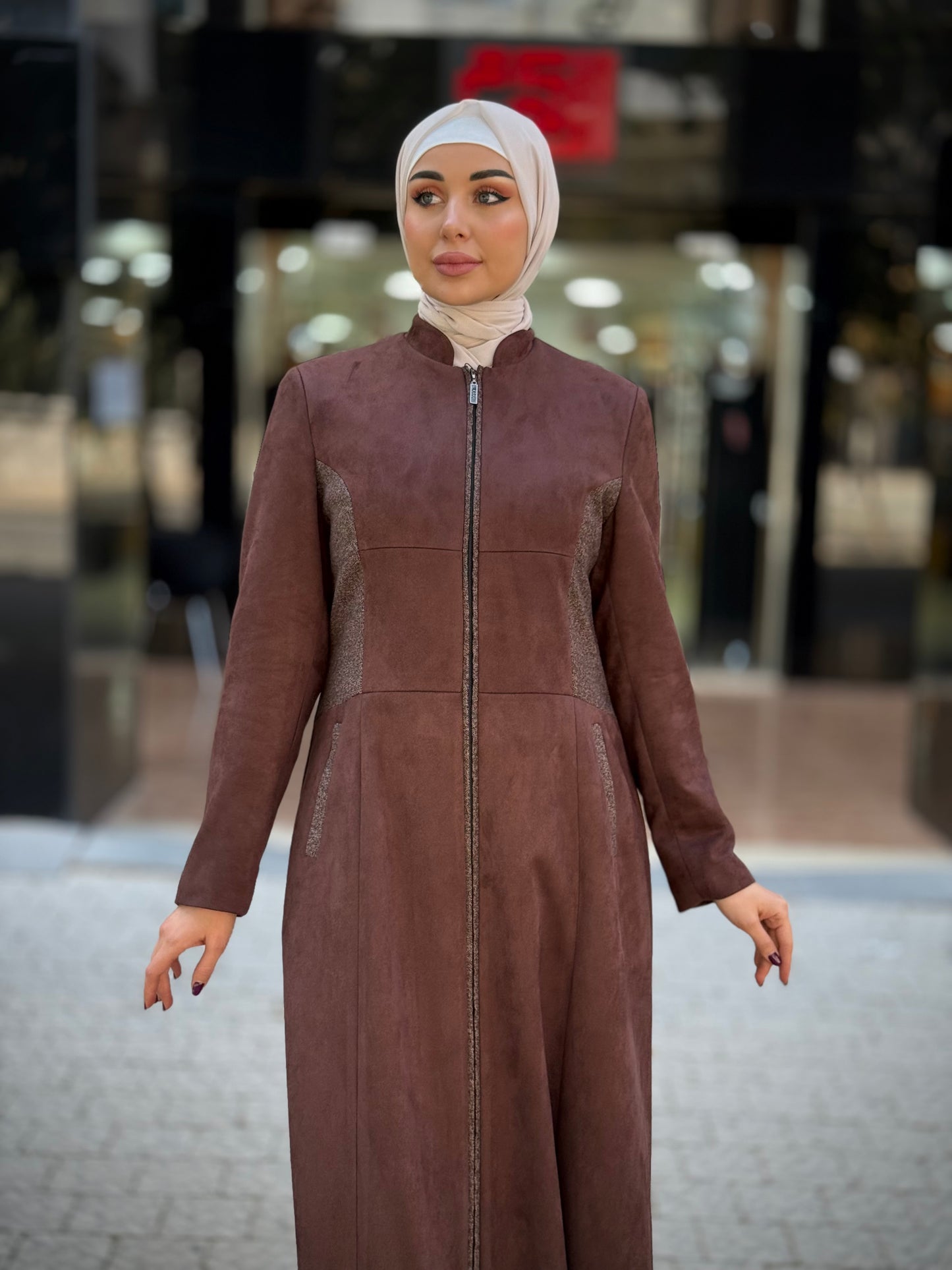 Shine with a modern and stunning look from Al Karam Qadri, featuring the largest exclusive collection of modest wear. Stand out with this quilted suede jilbab , distinguished by its blend of suede and wool fabrics.