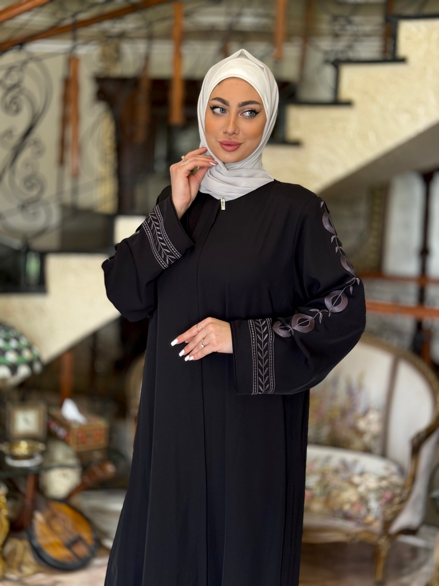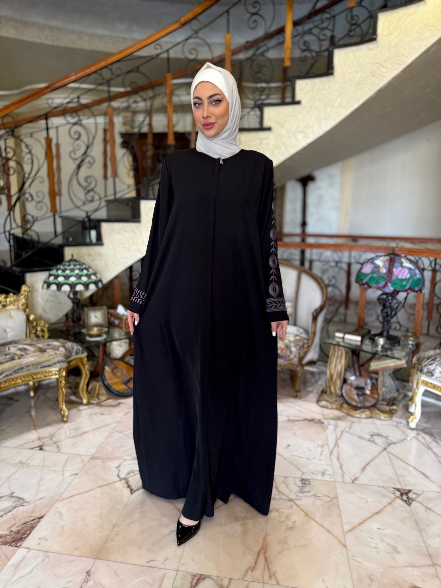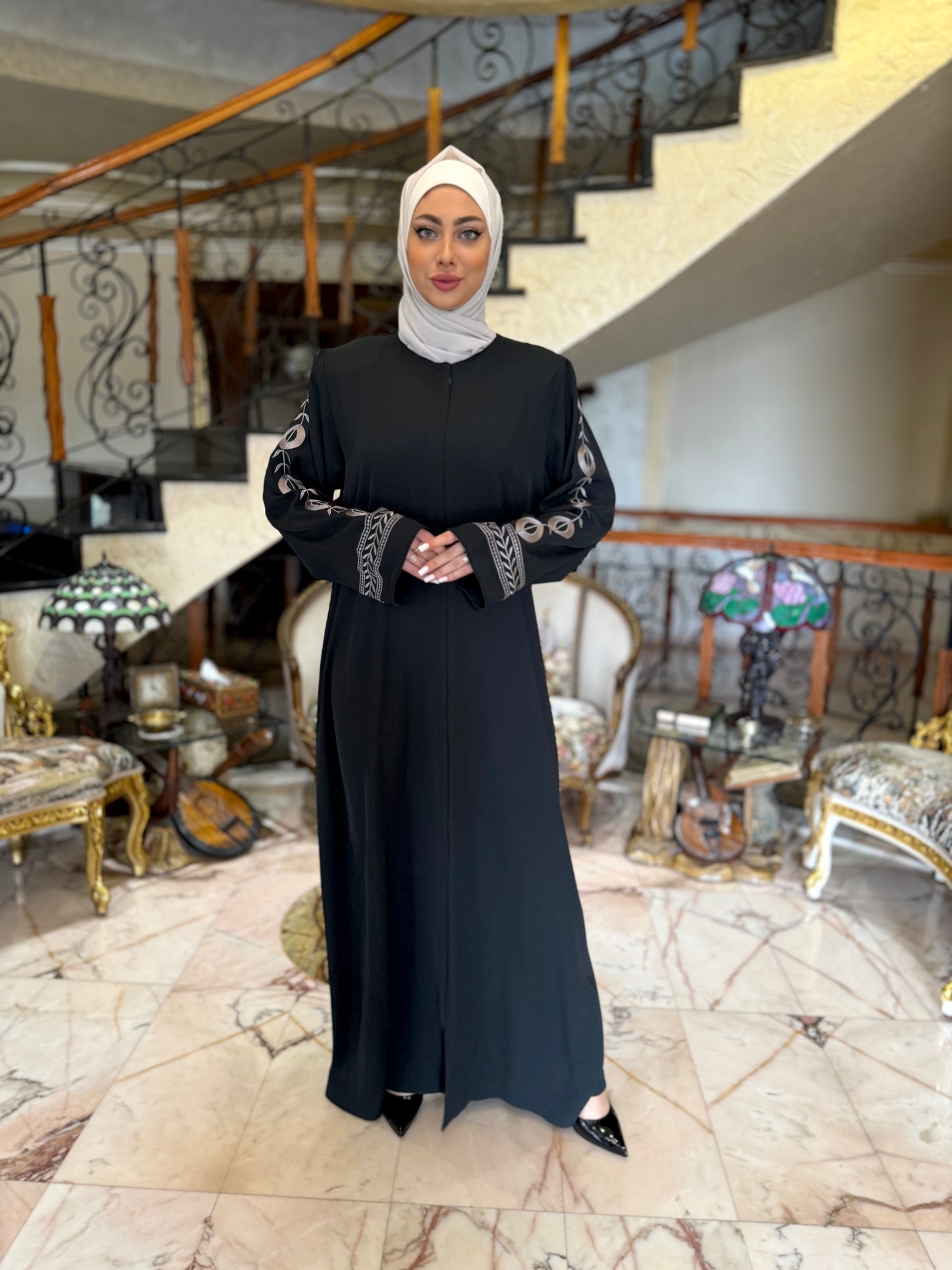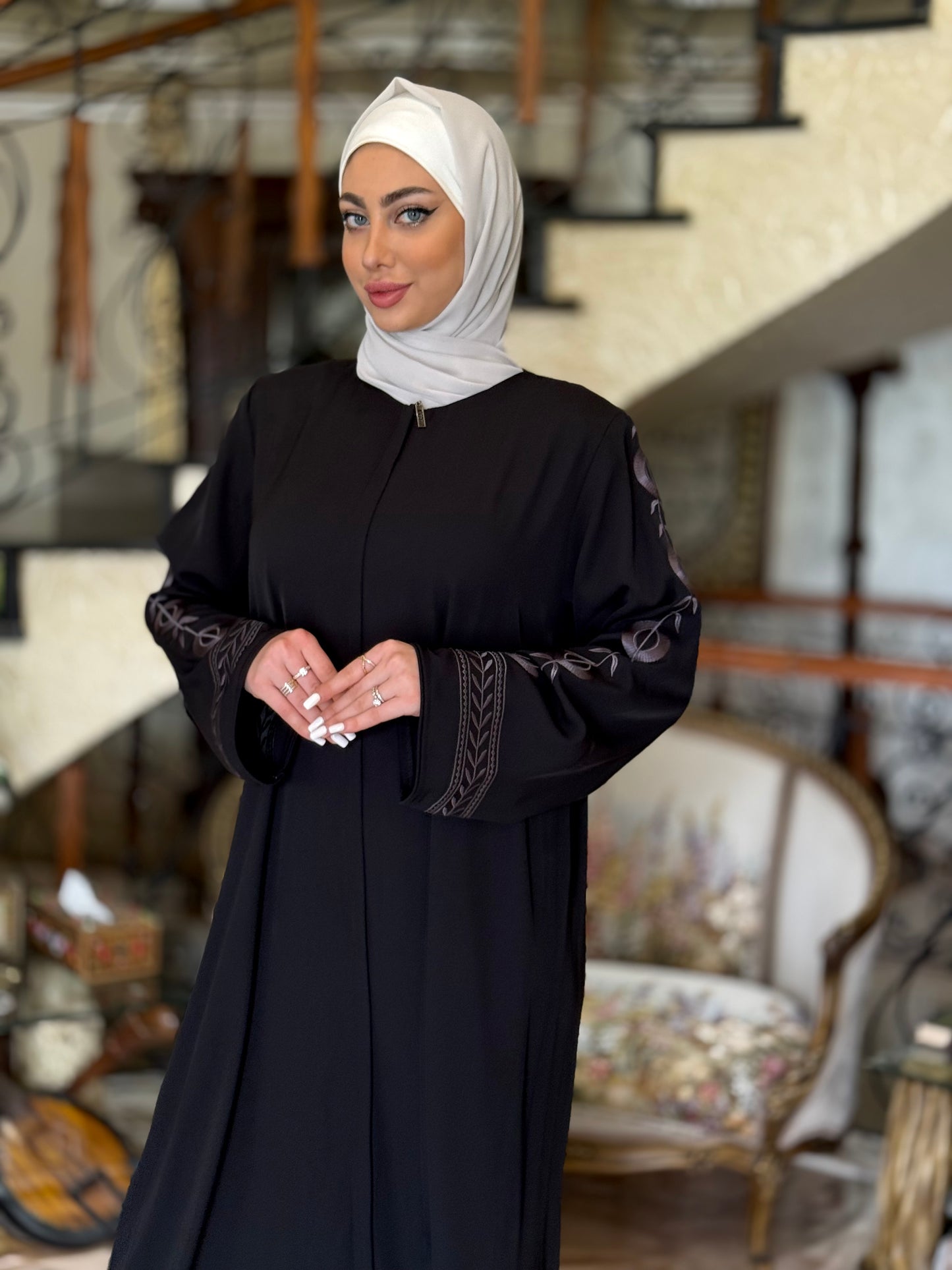 This practical front-closed abaya features a convenient zipper for easy wear and is beautifully adorned with hand embroidery on the sleeves .