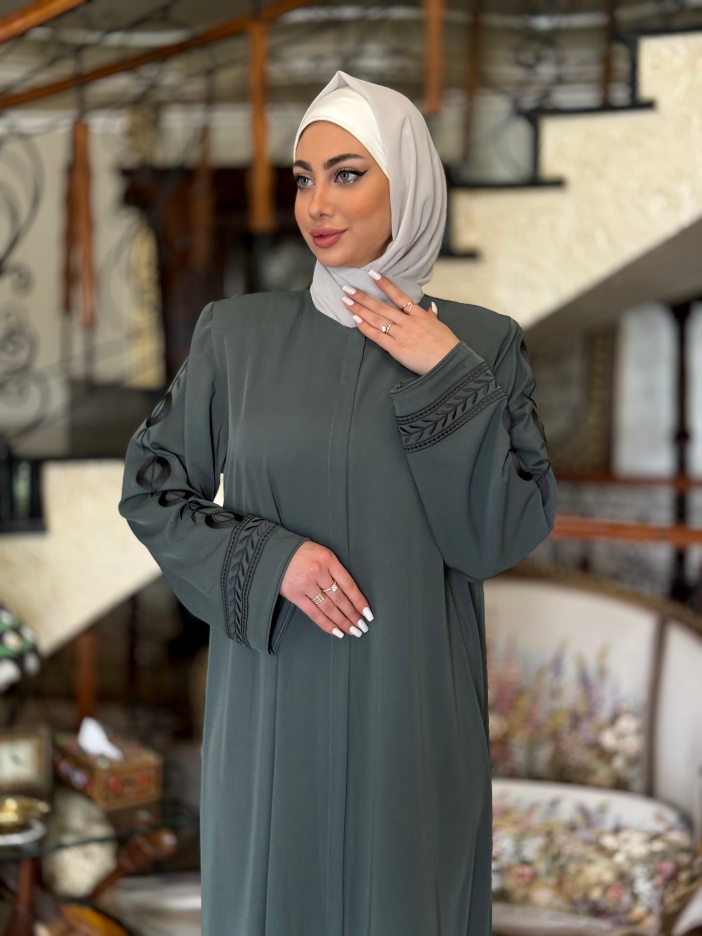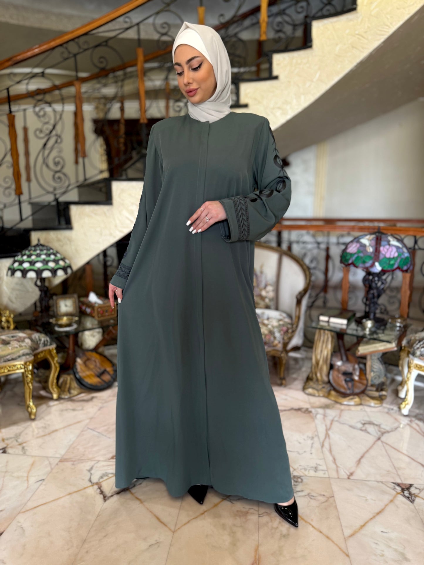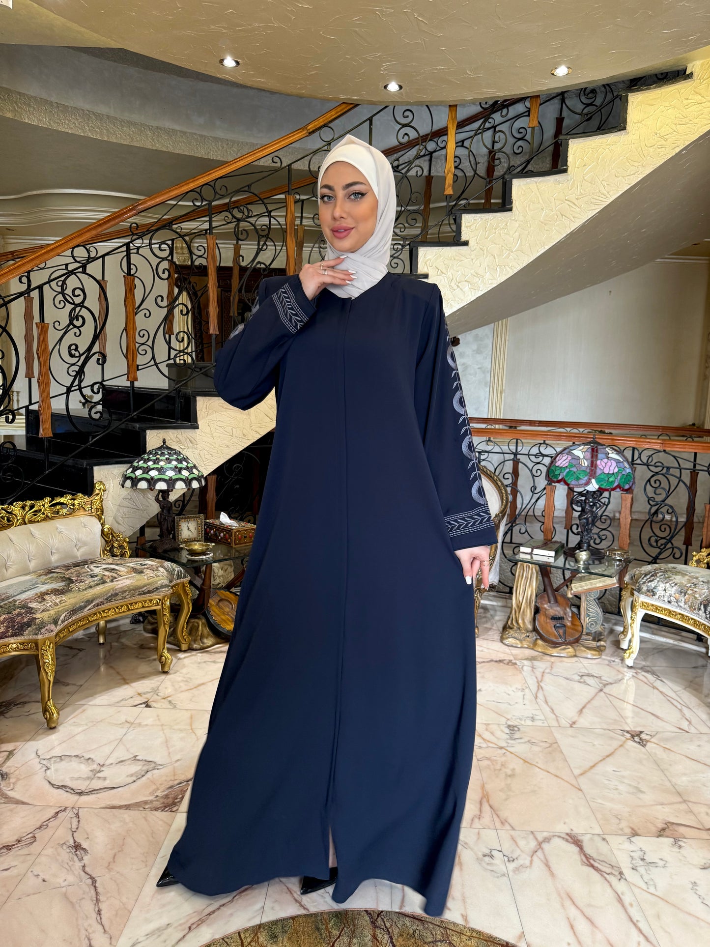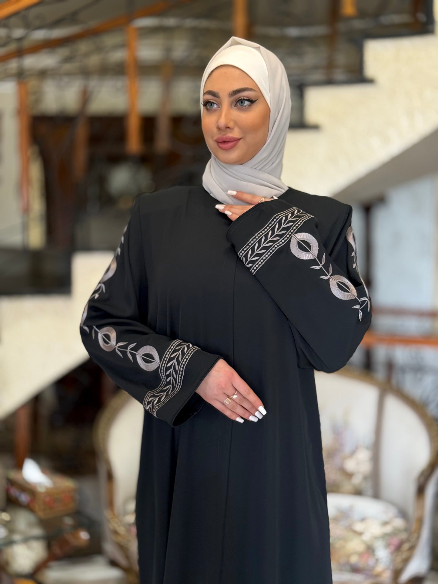 This practical front-closed abaya features a convenient zipper for easy wear and is beautifully adorned with hand embroidery on the sleeves .