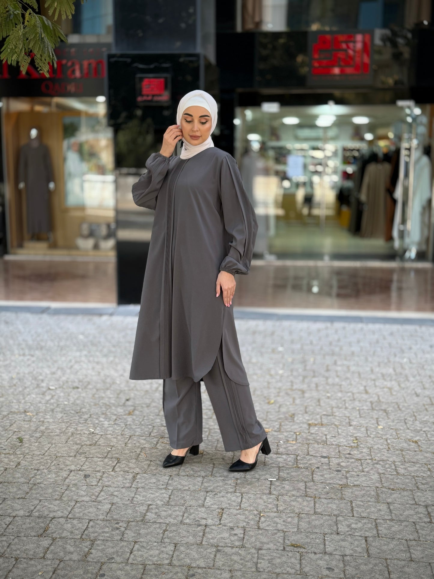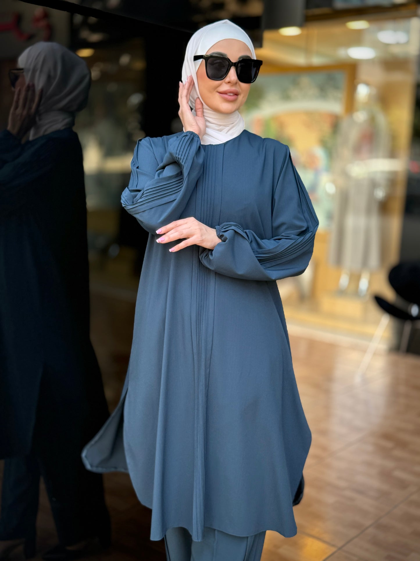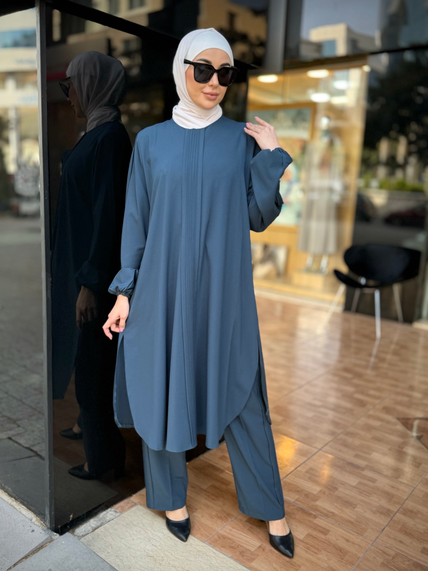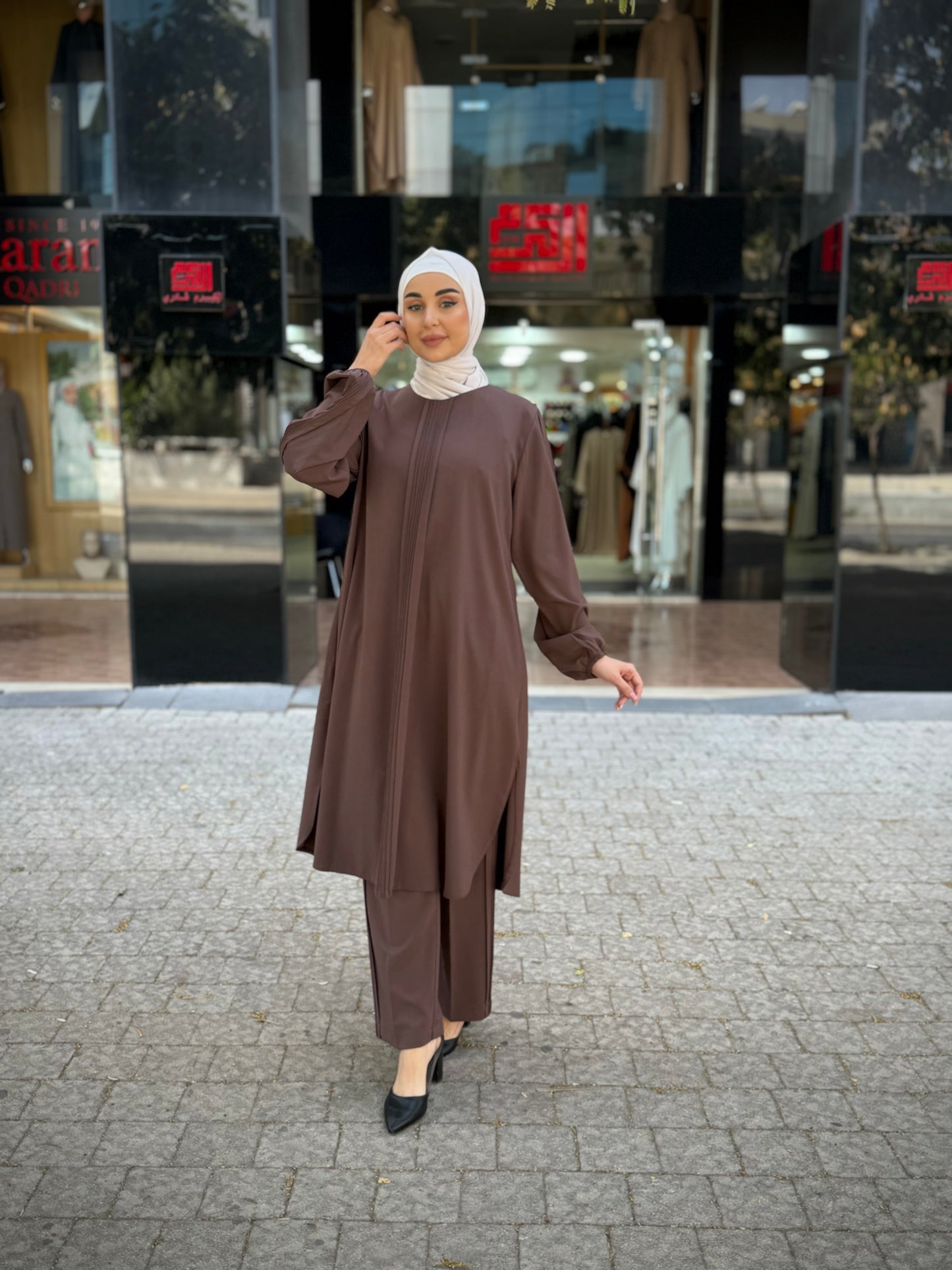 Elevate your style with this chic and practical outfit from the modern collection by Qadri . Featuring a front-closed shirt with a hidden zipper at the back and a length of 120 cm , paired with 105 cm pants that include a flexible waistband .