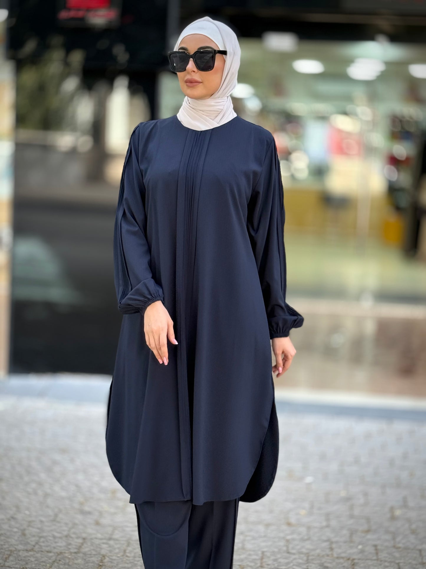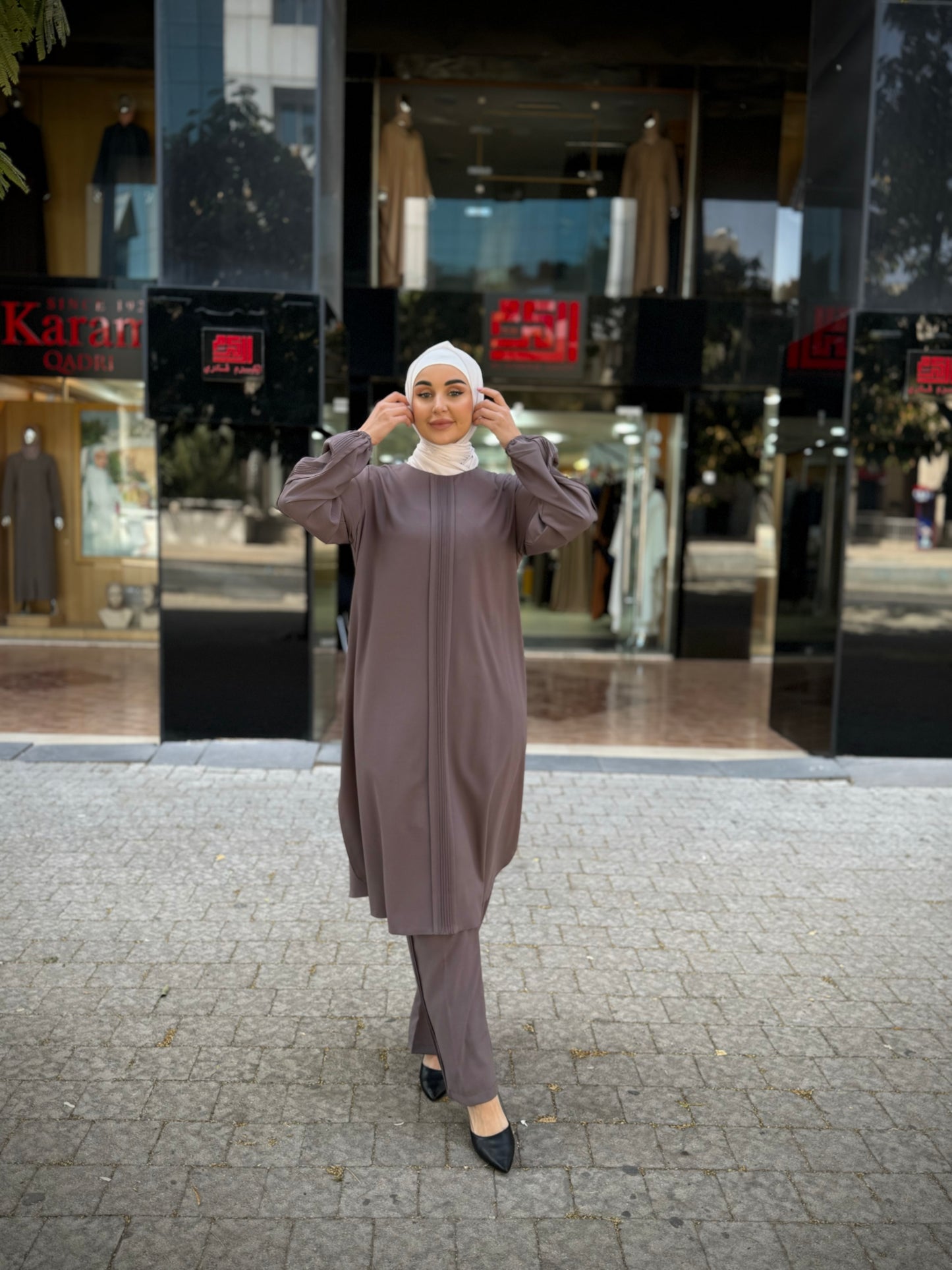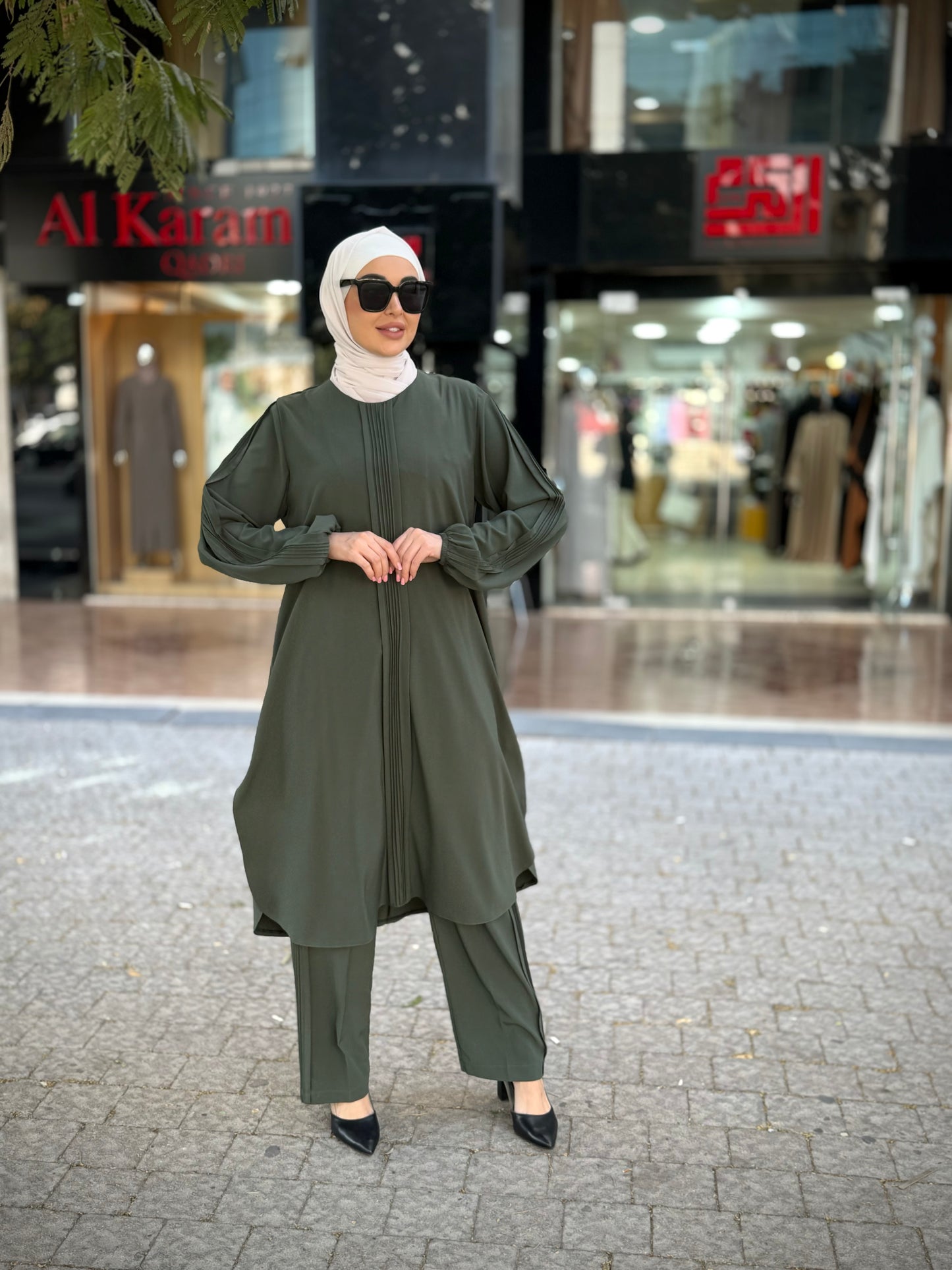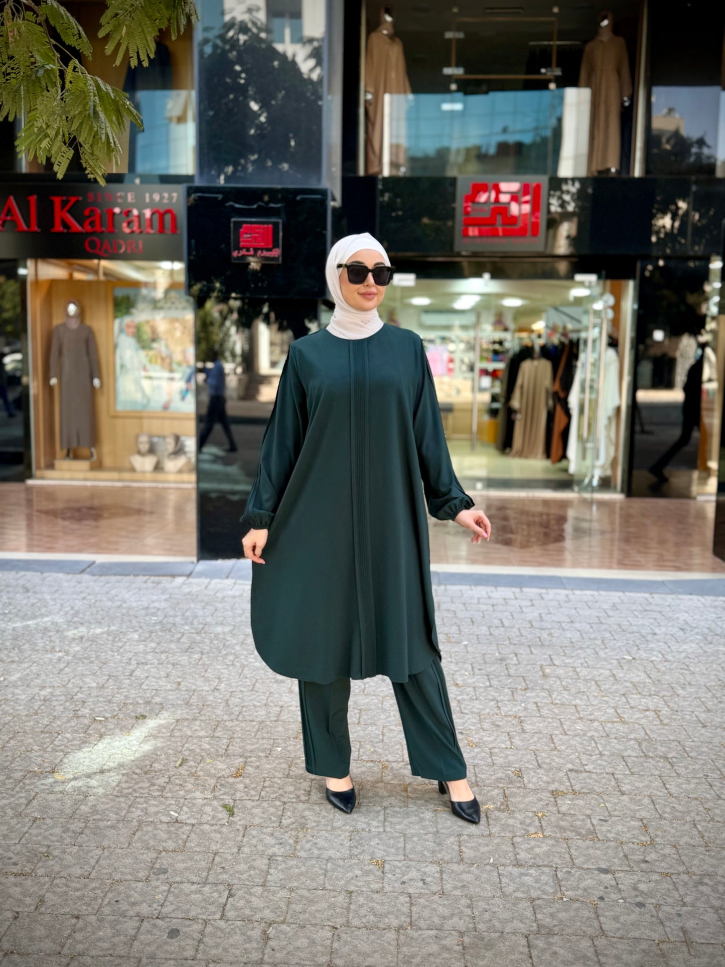 Elevate your style with this chic and practical outfit from the modern collection by Qadri . Featuring a front-closed shirt with a hidden zipper at the back and a length of 120 cm , paired with 105 cm pants that include a flexible waistband .