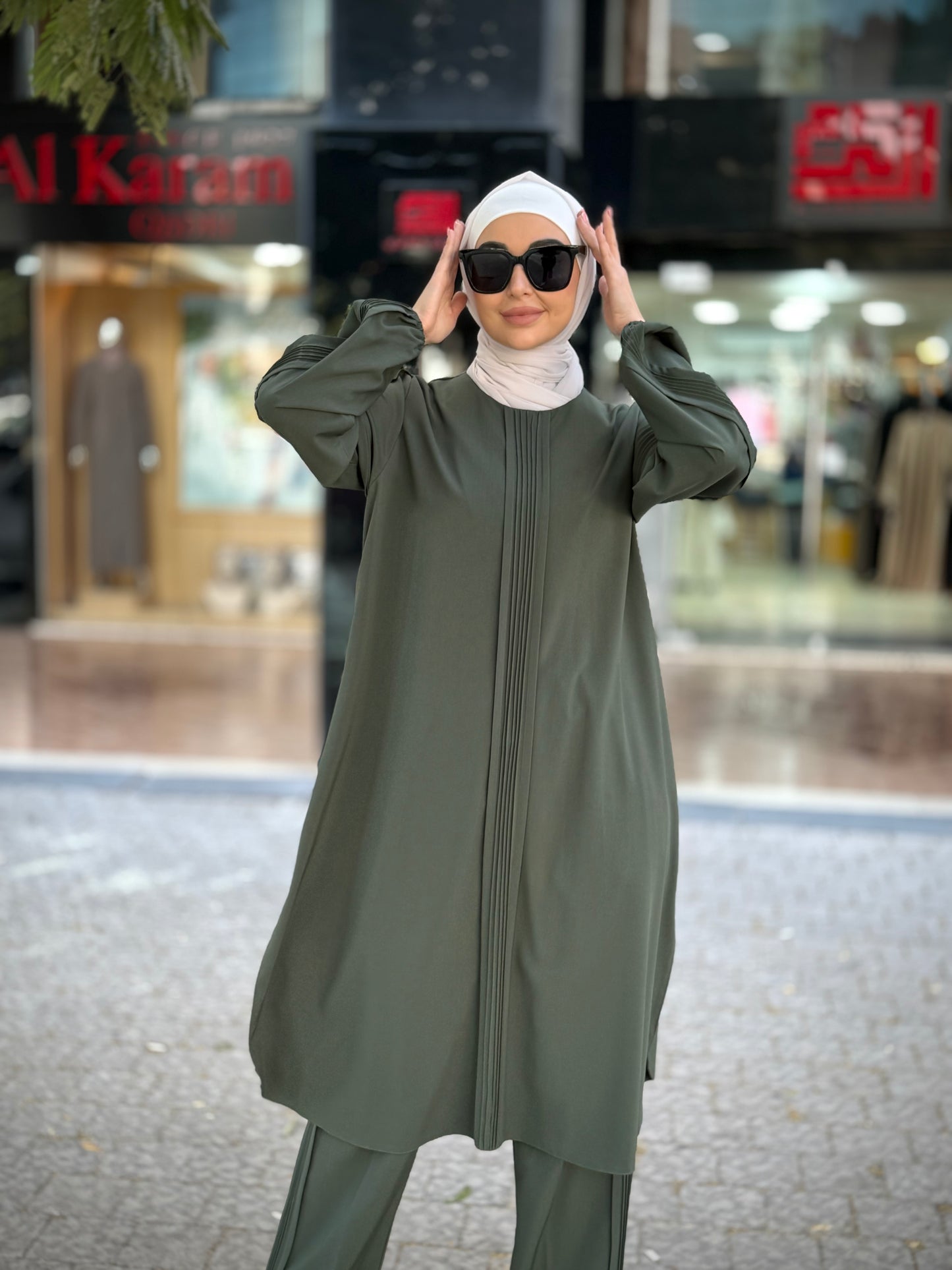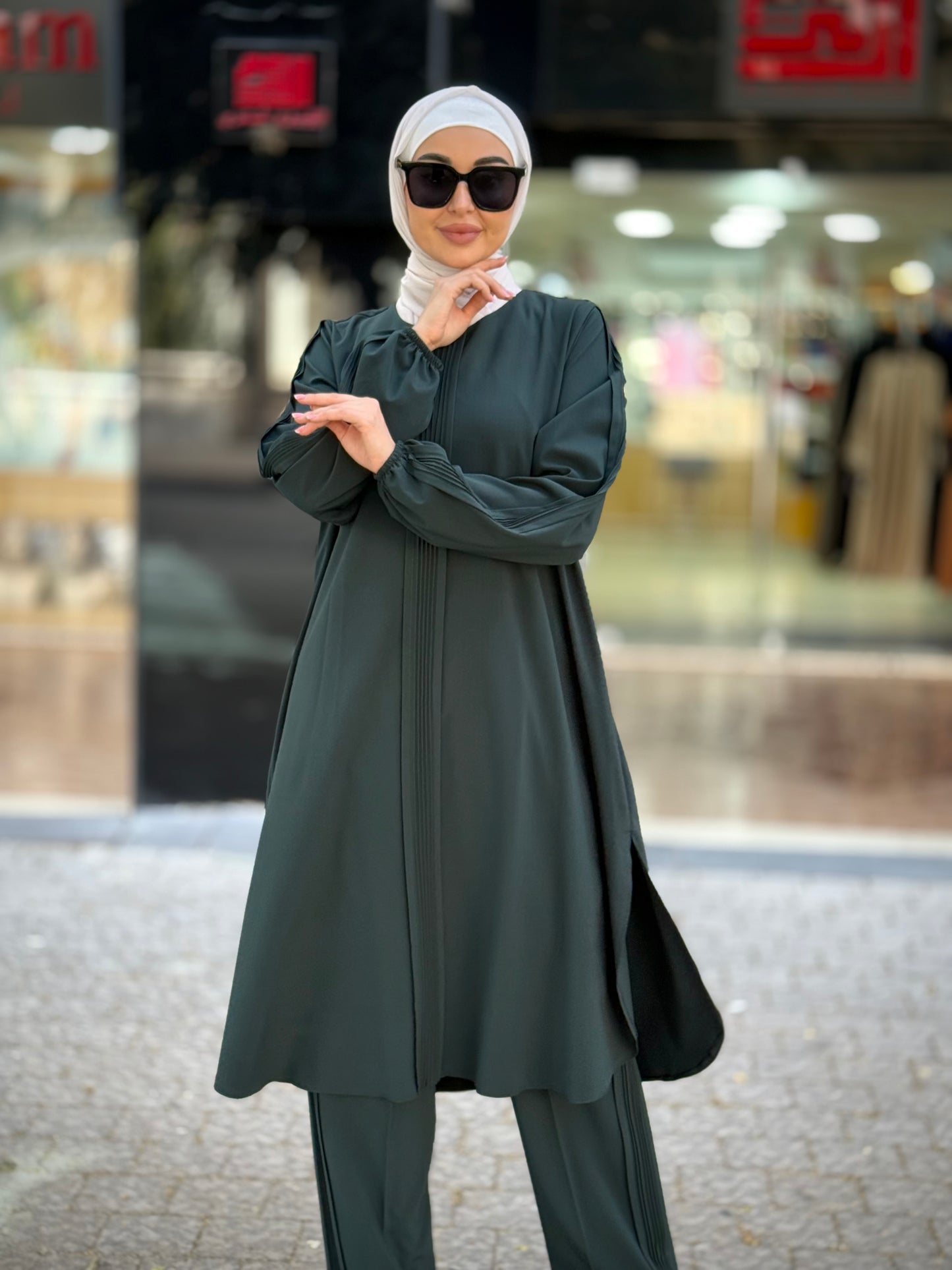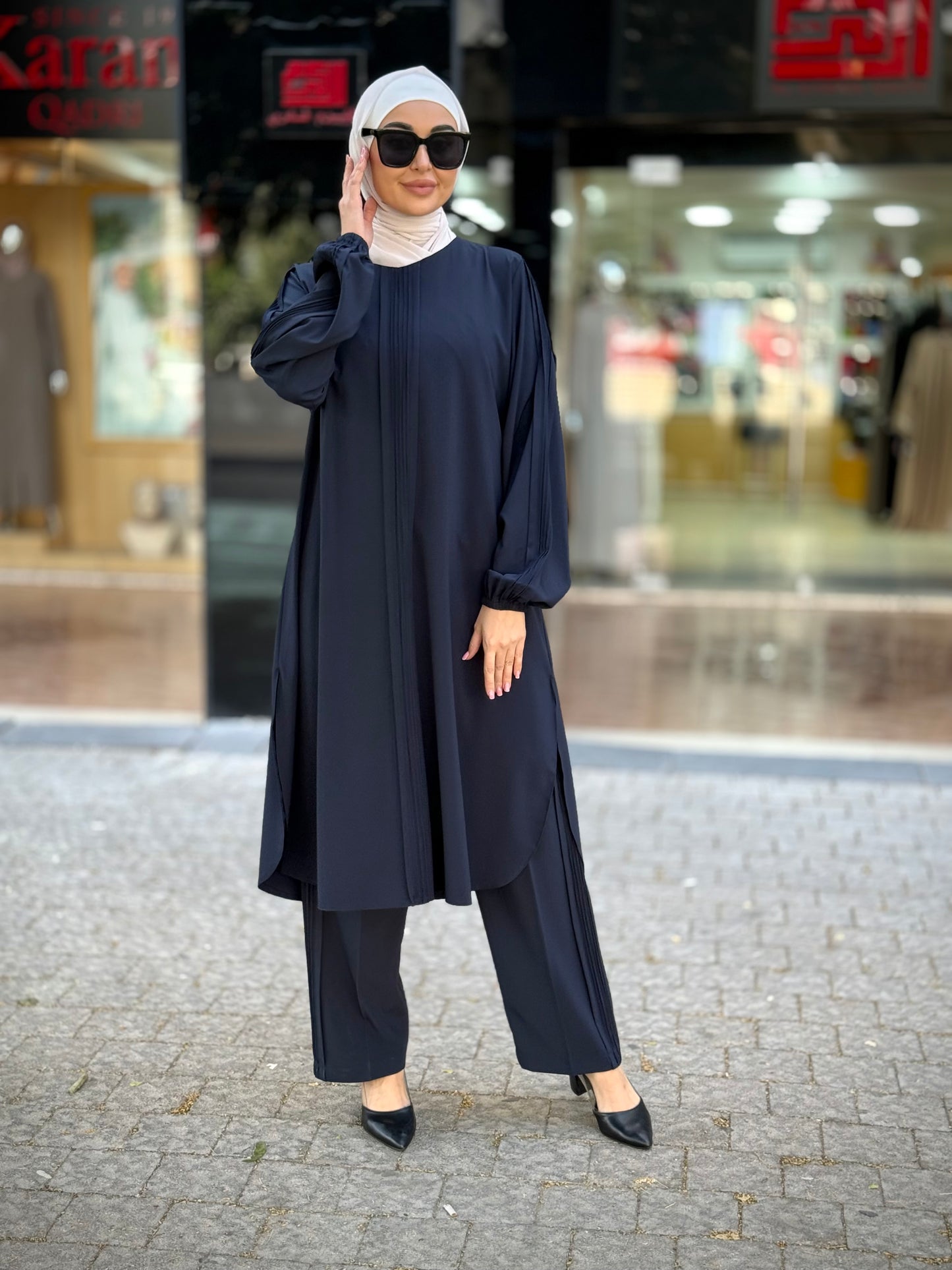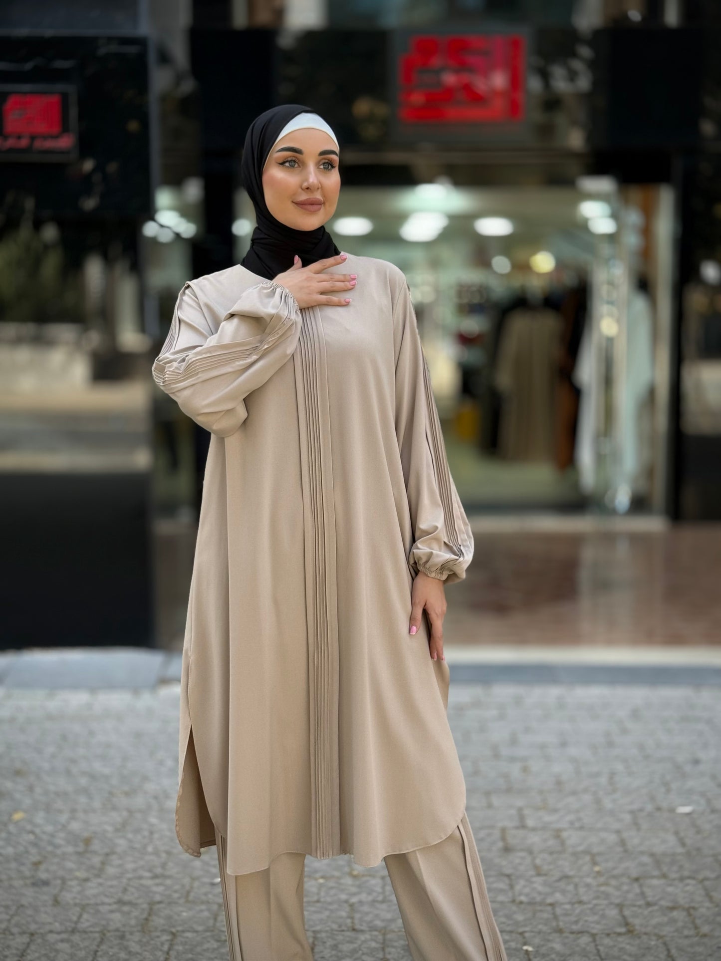 Elevate your style with this chic and practical outfit from the modern collection by Qadri . Featuring a front-closed shirt with a hidden zipper at the back and a length of 120 cm , paired with 105 cm pants that include a flexible waistband .