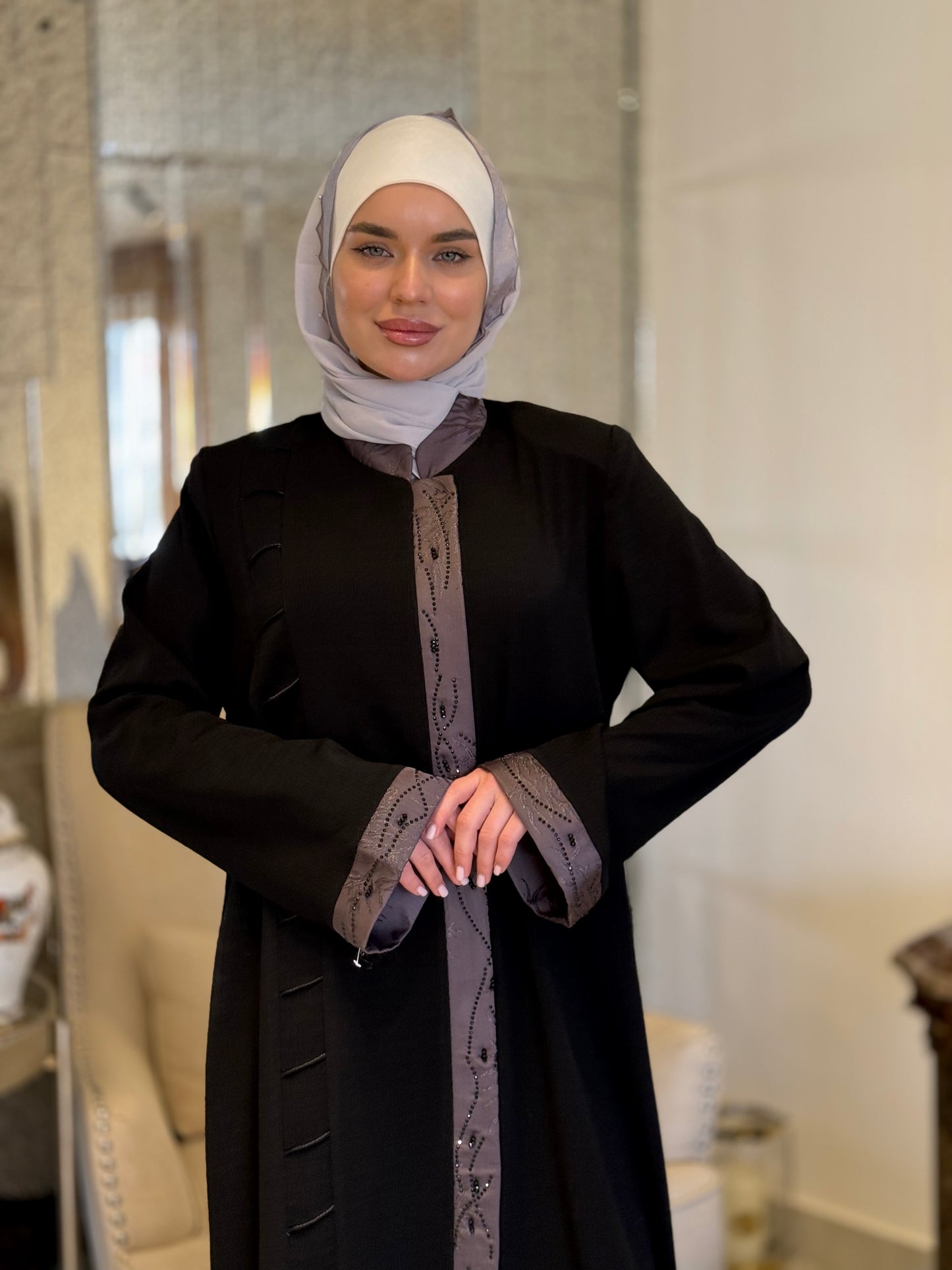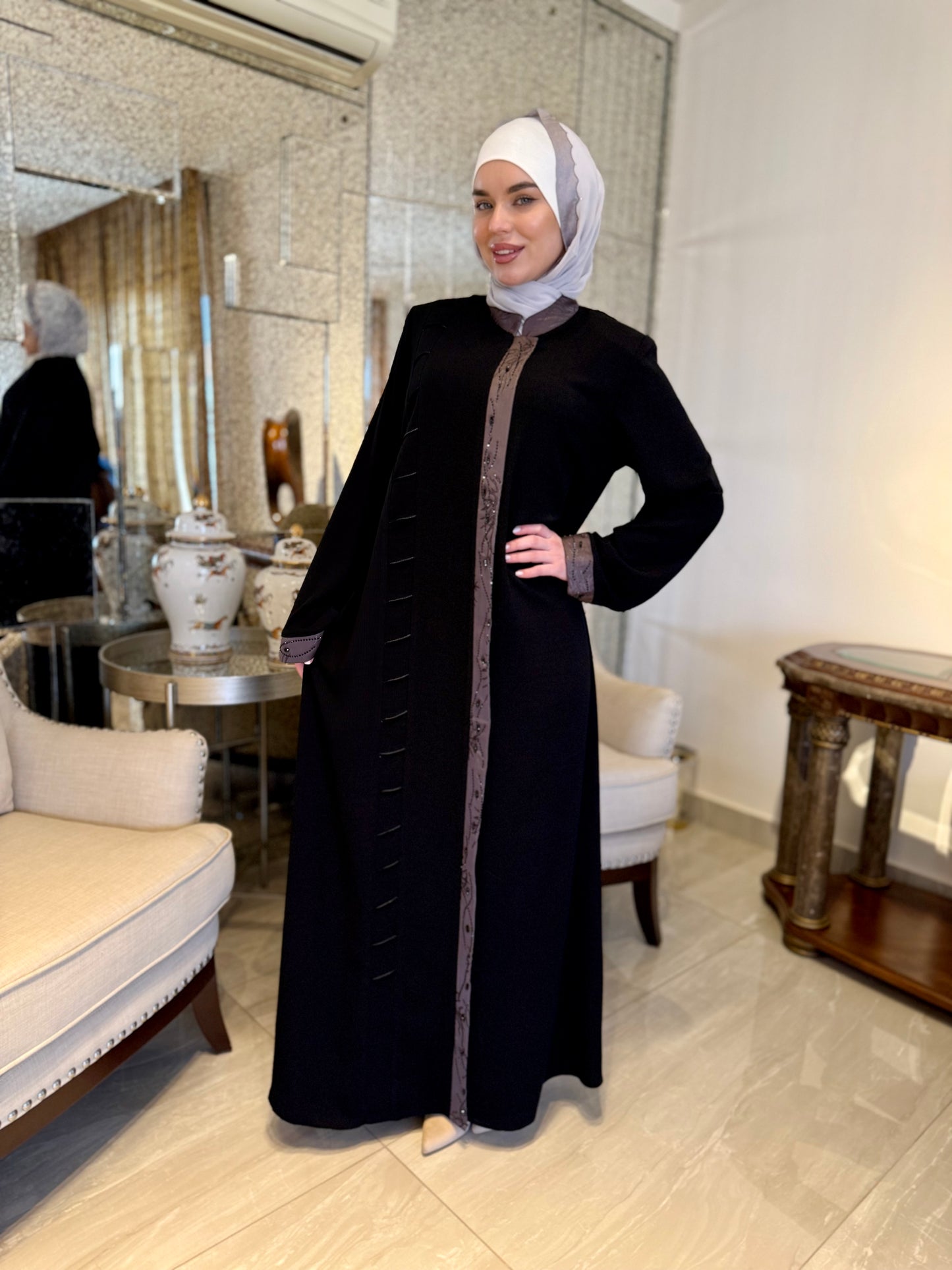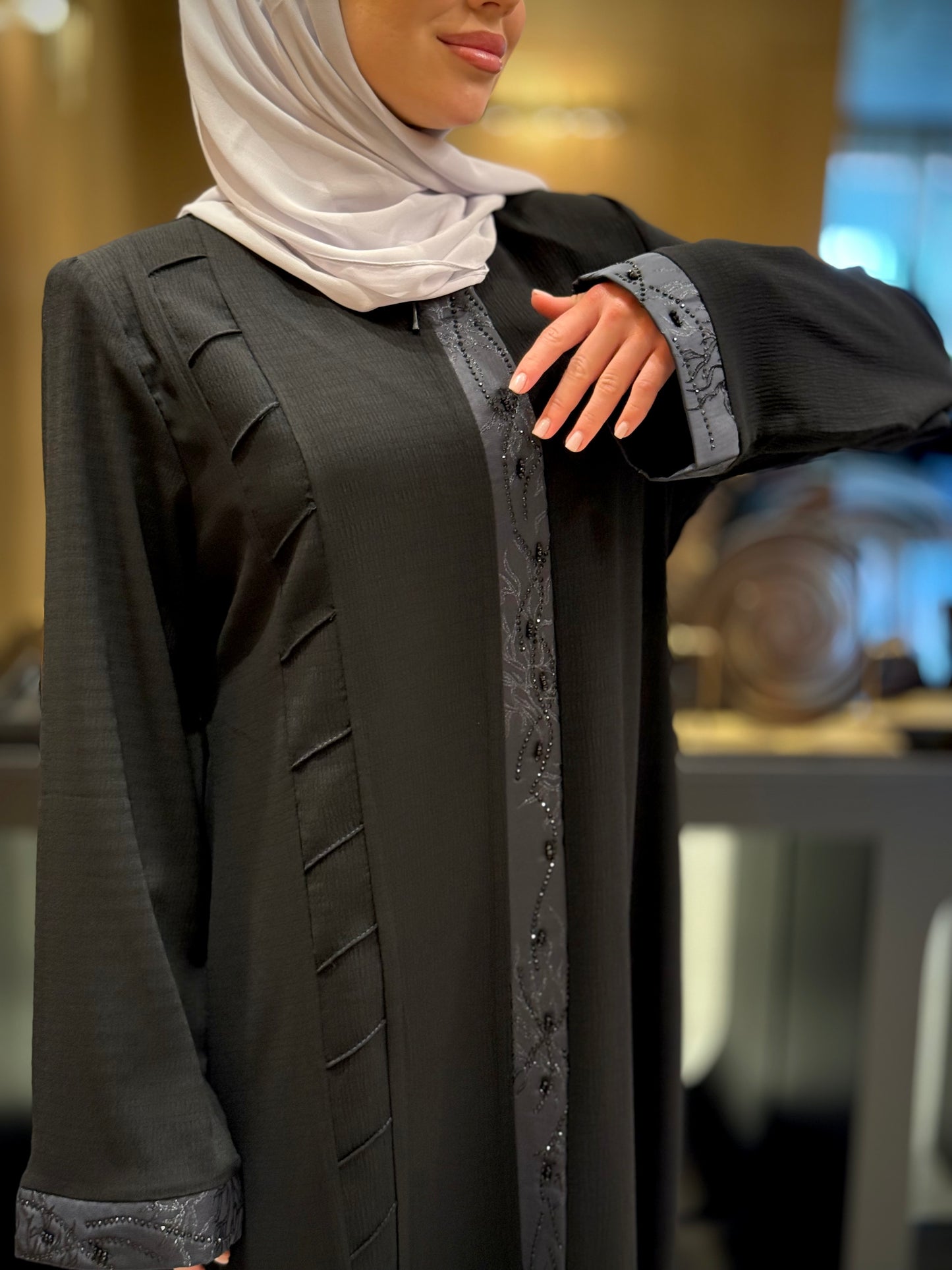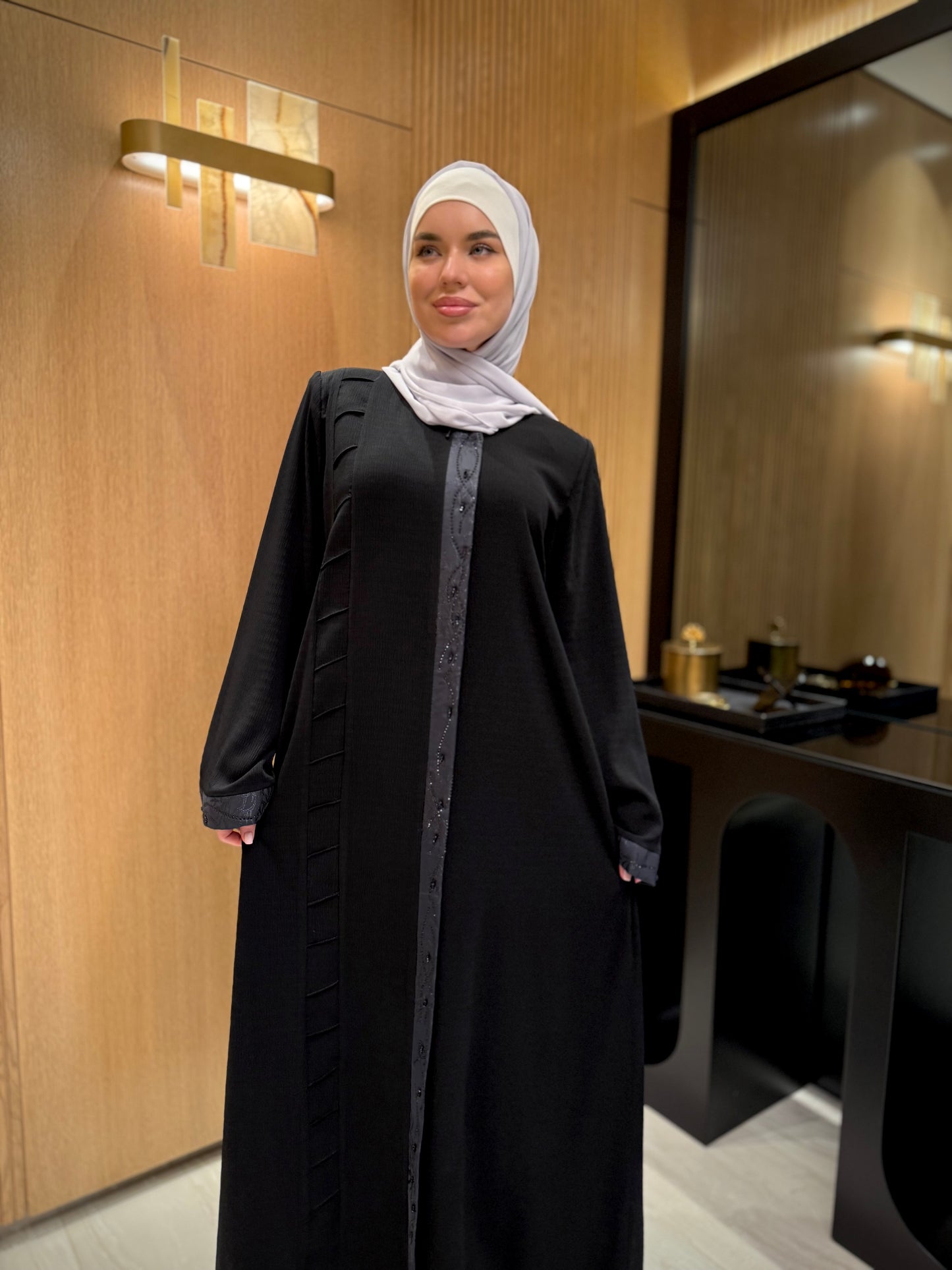 This elegant abaya, crafted from Fursan fabric, is embellished with rhinestones and unique hand-beaded details.