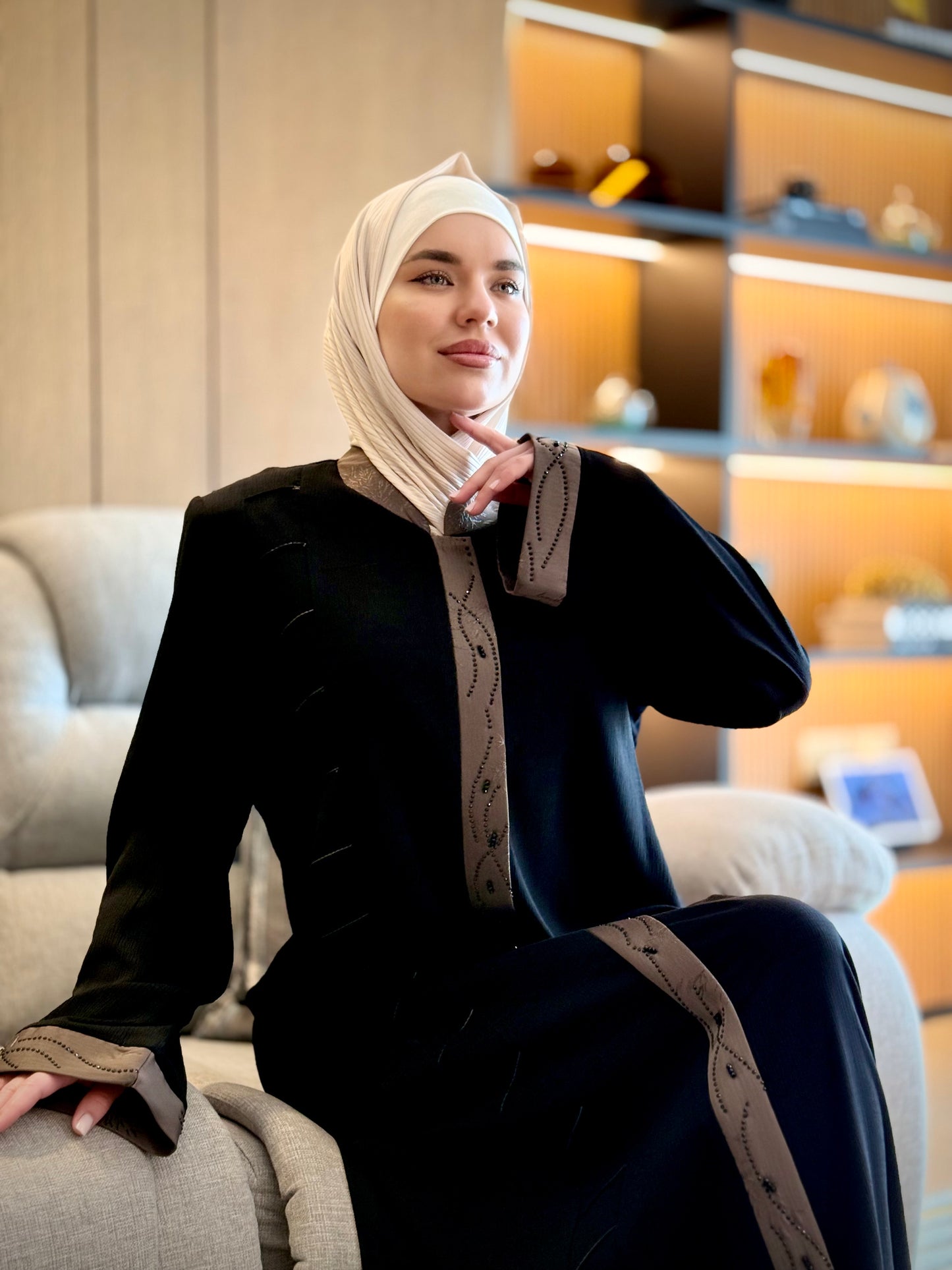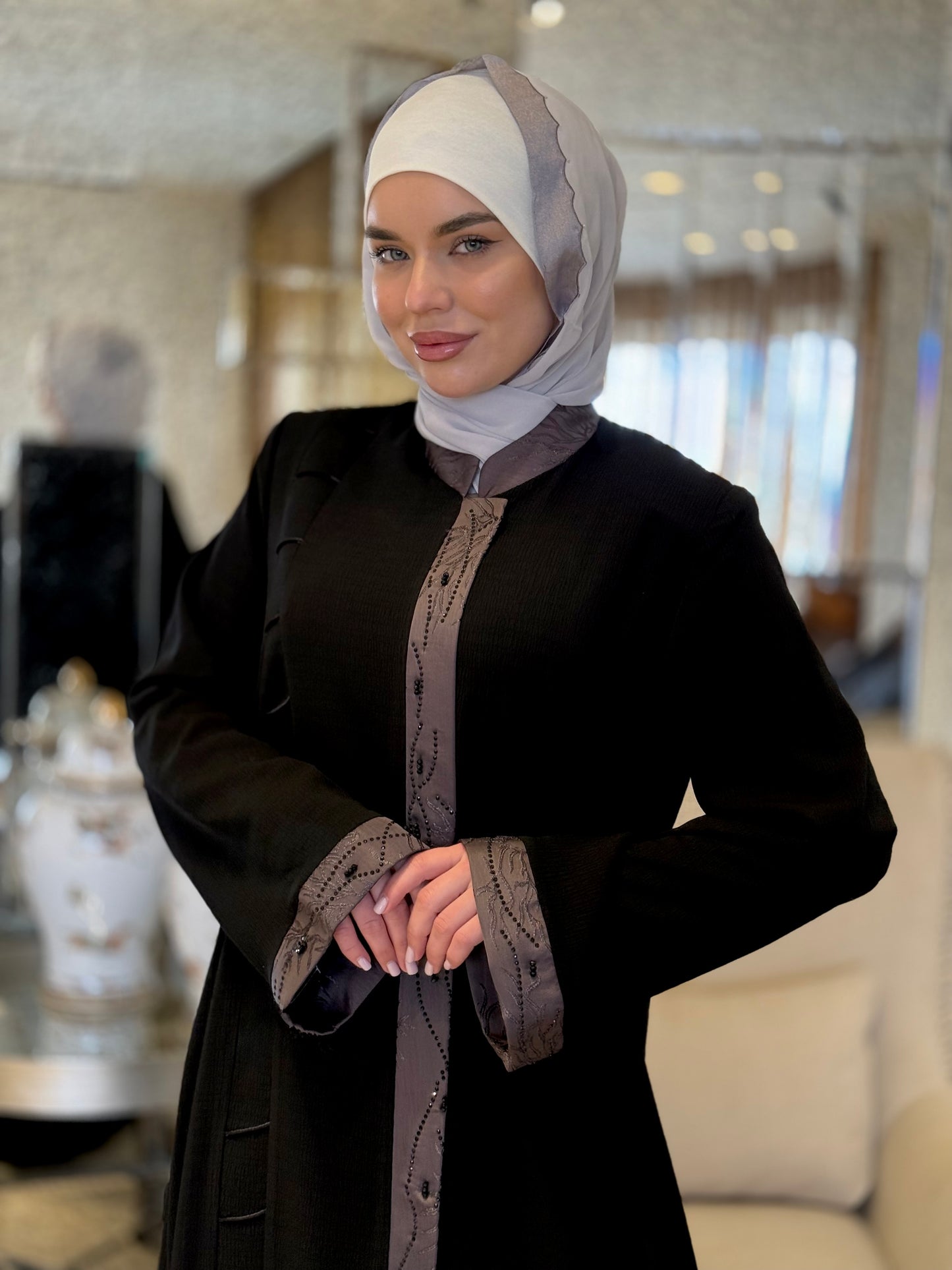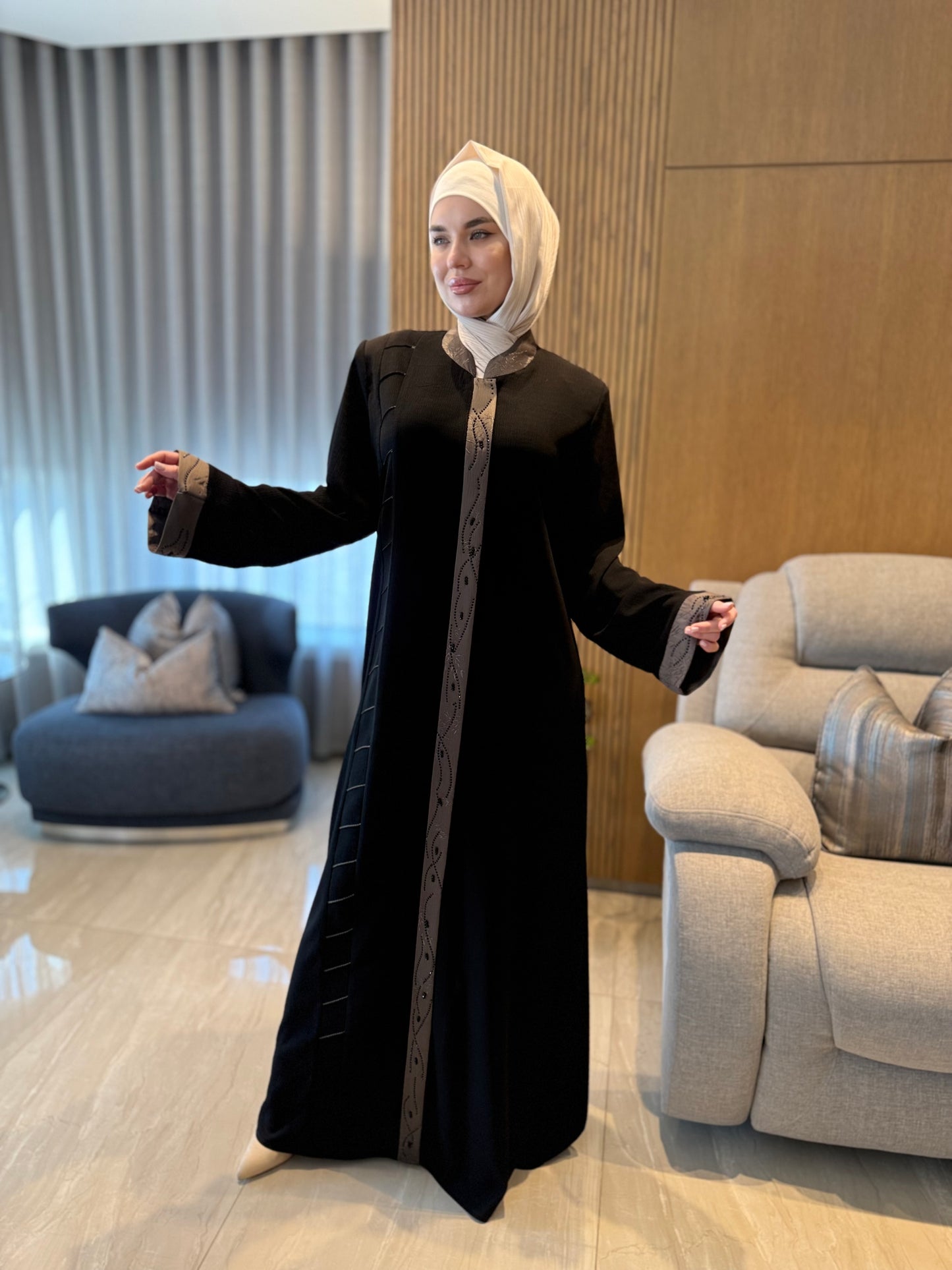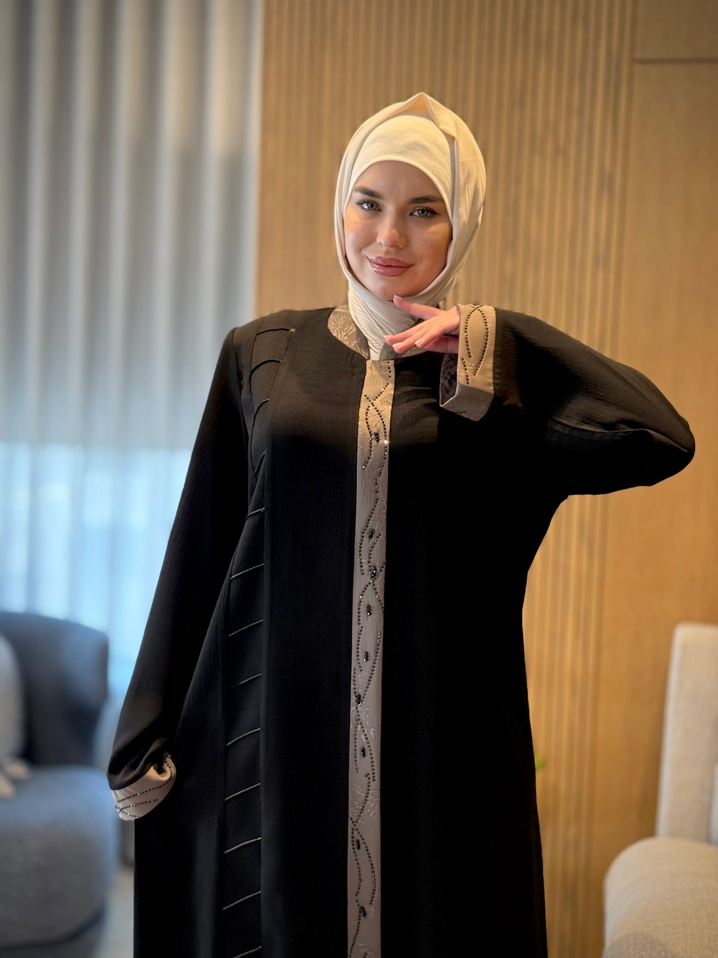 This elegant abaya, crafted from Fursan fabric, is embellished with rhinestones and unique hand-beaded details.