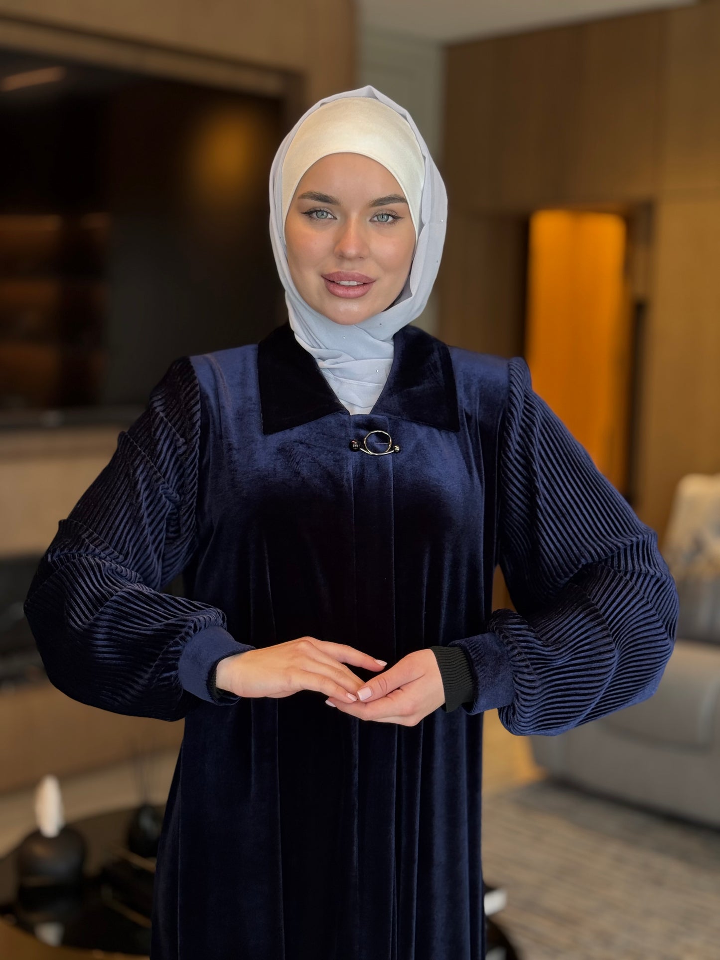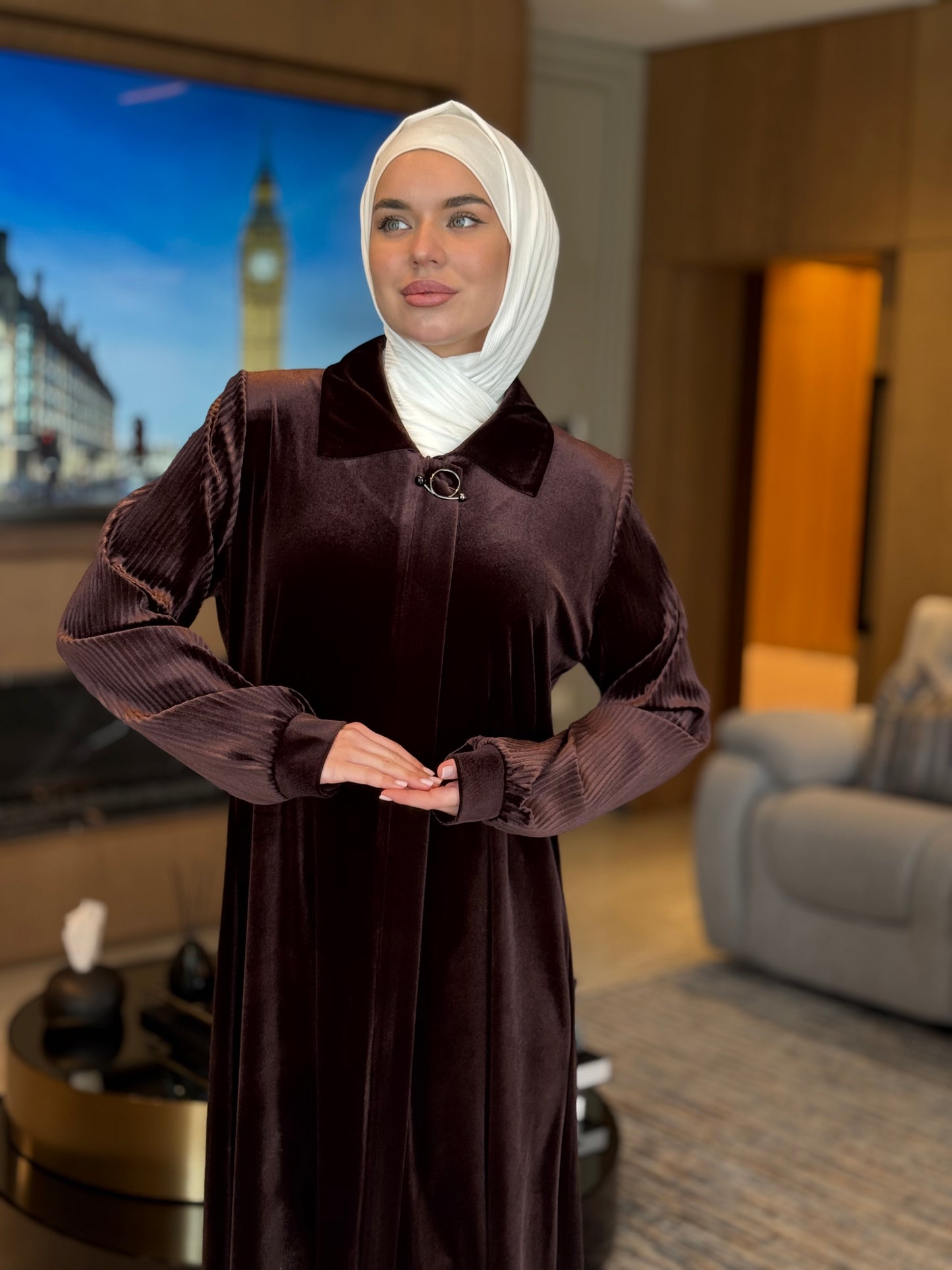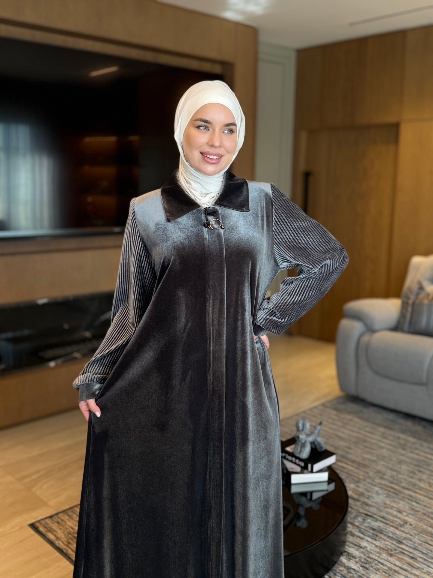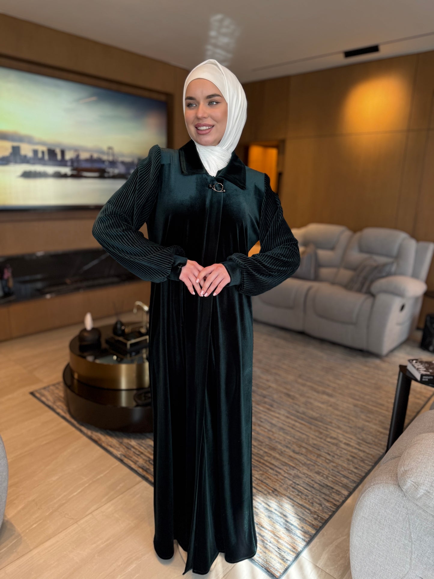 Stand out in this practical and luxurious velvet abaya, open at the front with a zipper closure for easy wear.