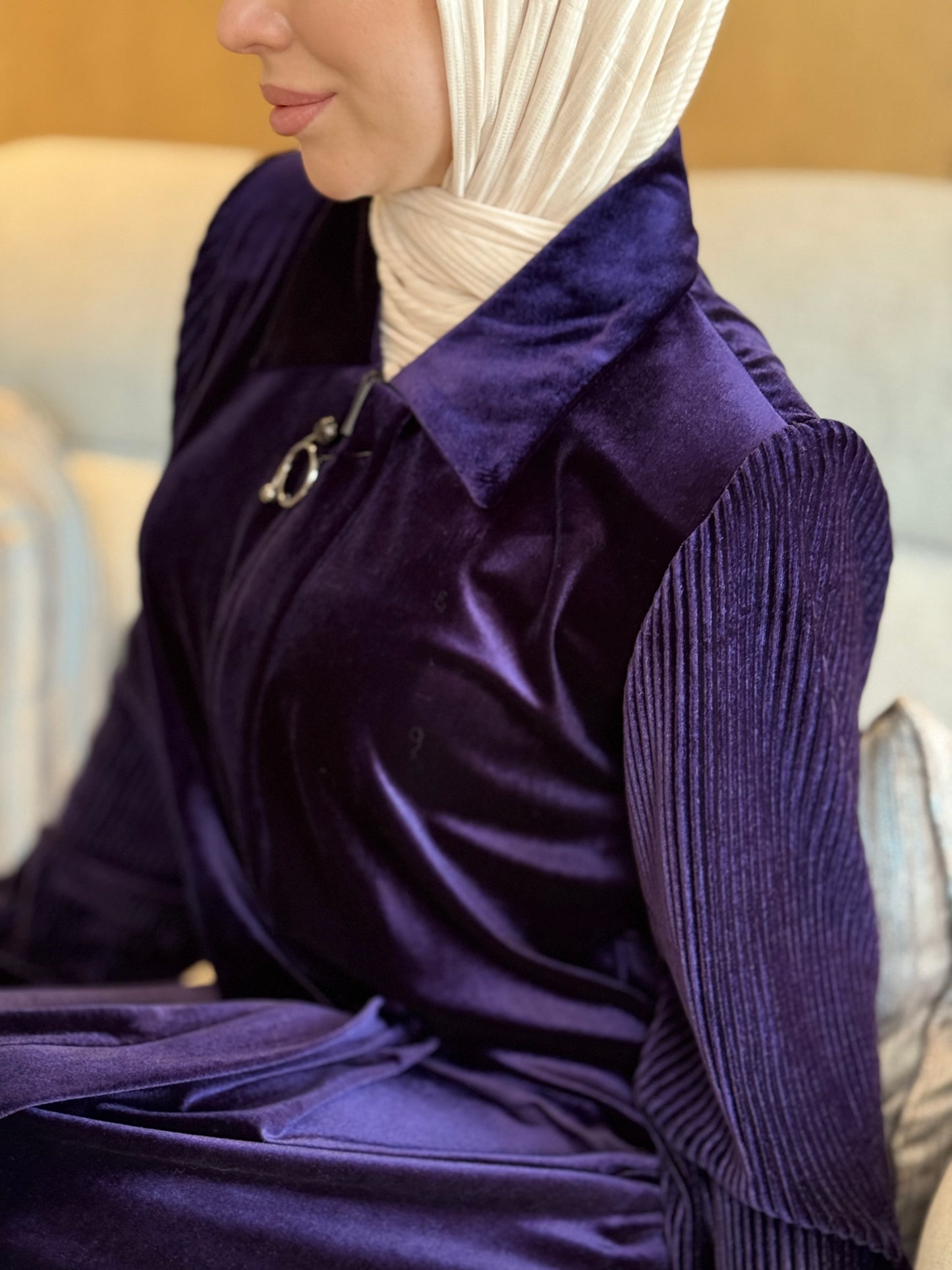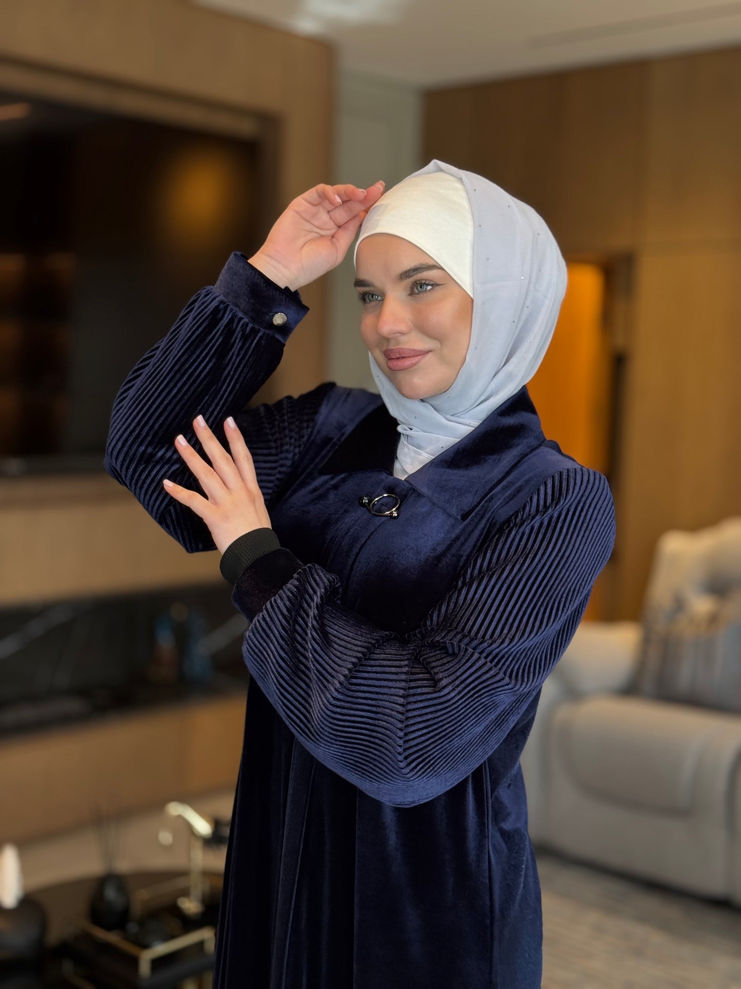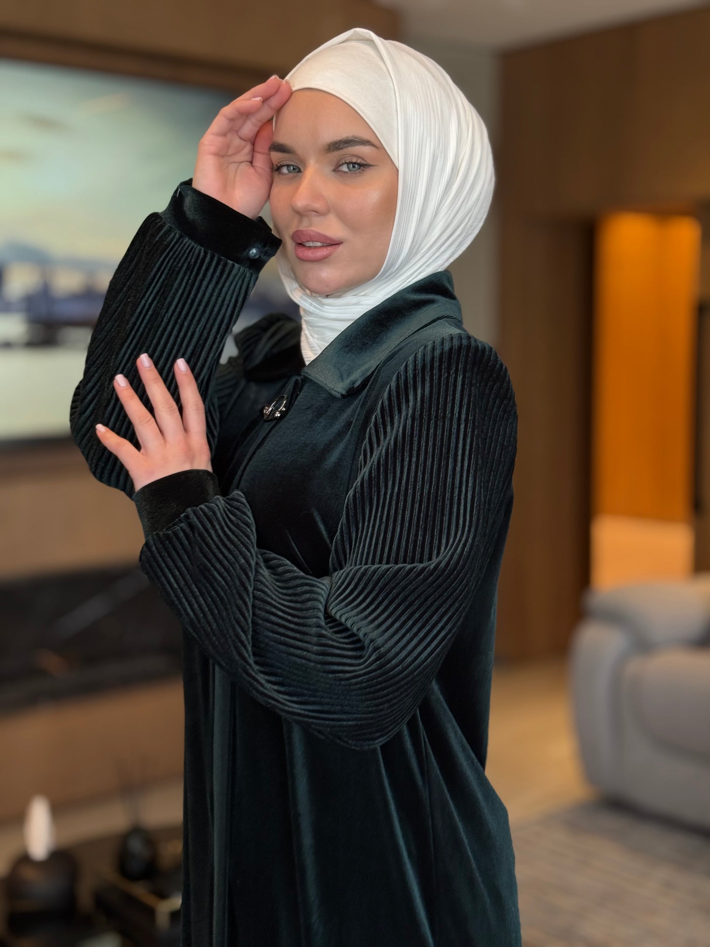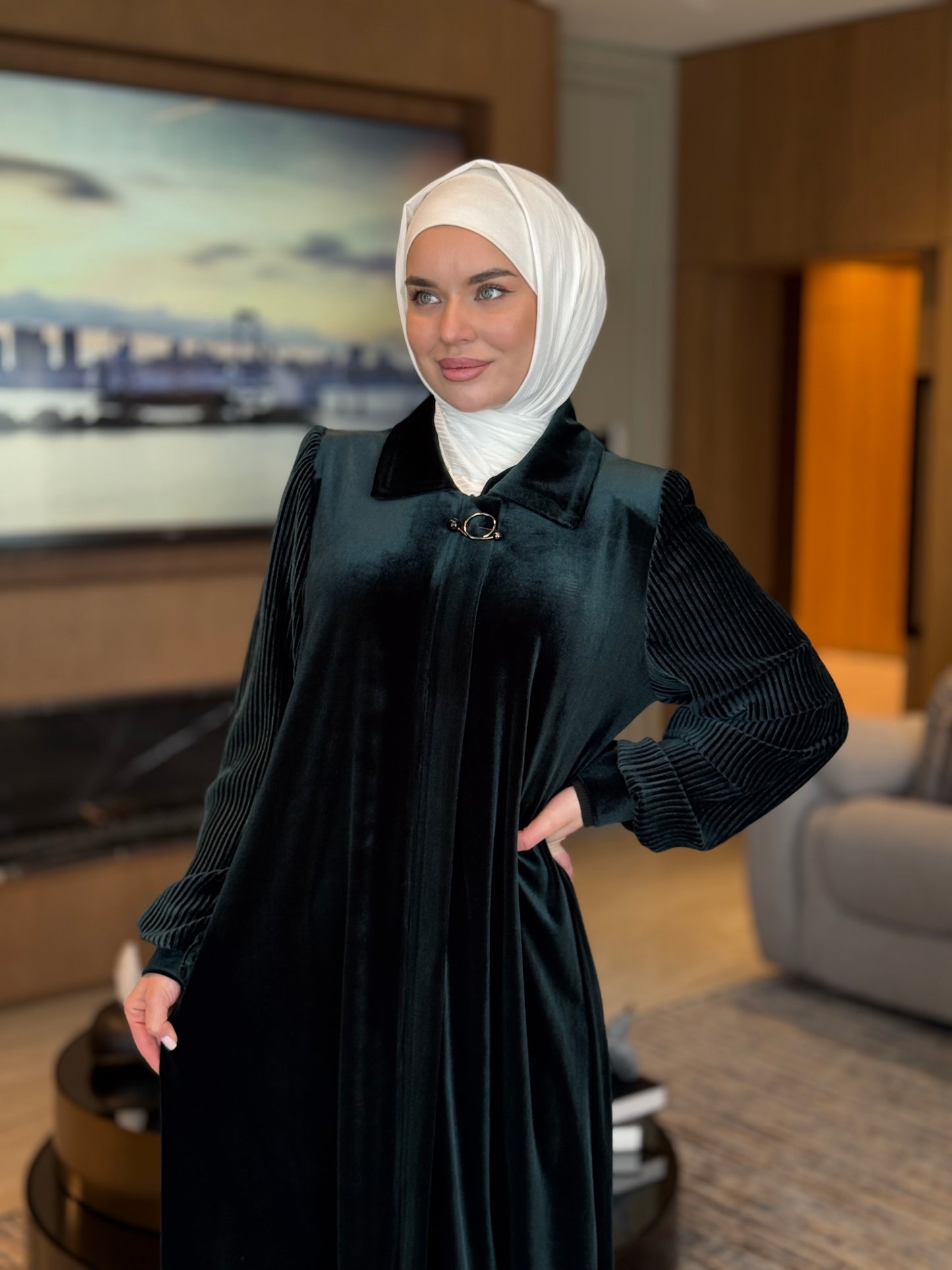 Stand out in this practical and luxurious velvet abaya, open at the front with a zipper closure for easy wear.