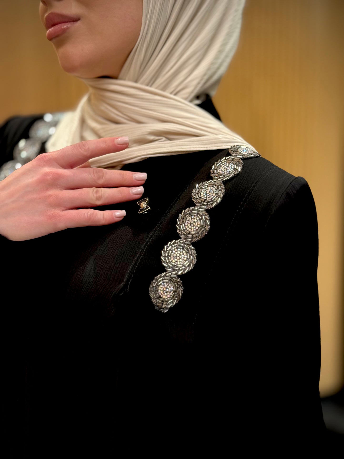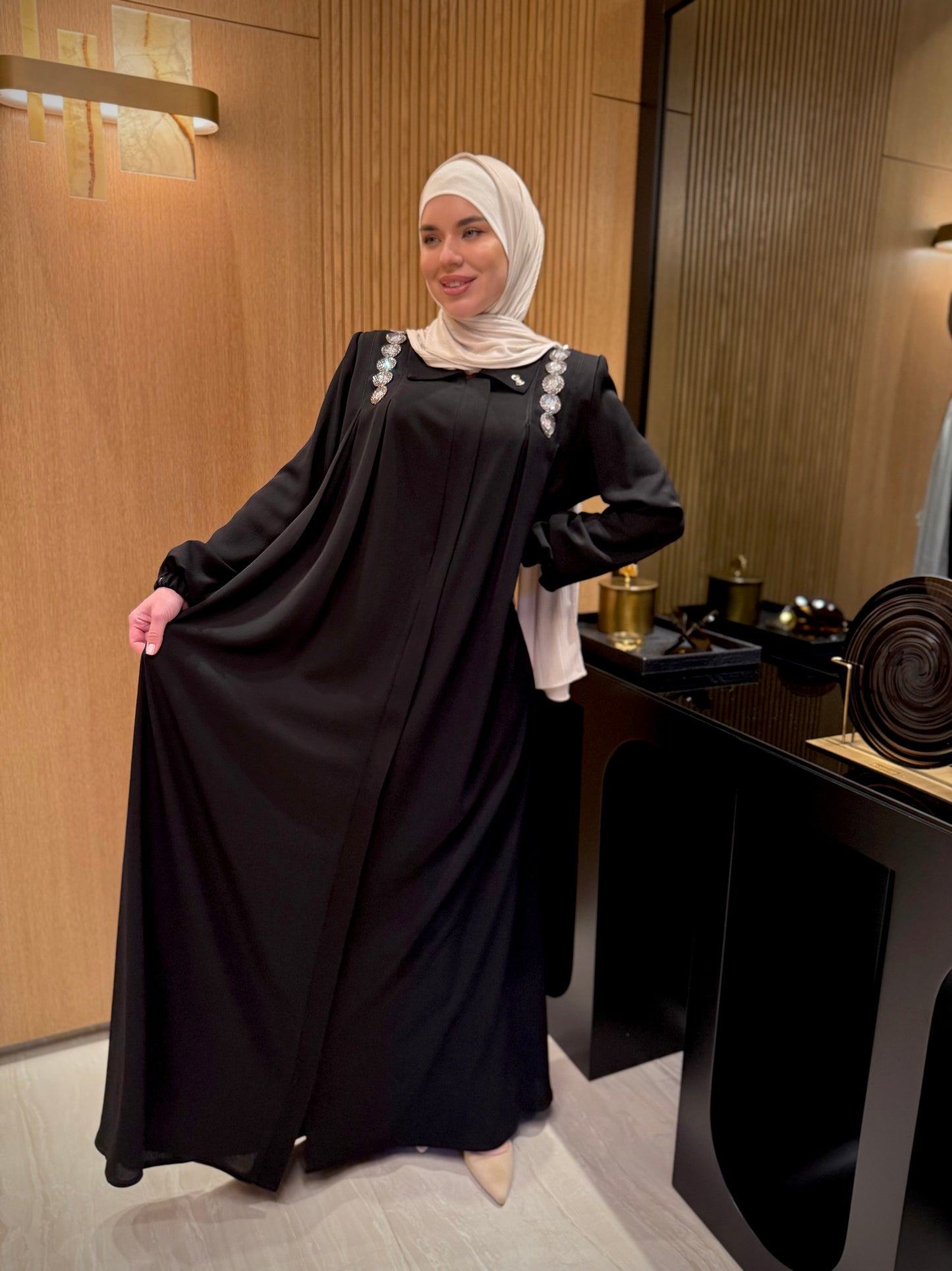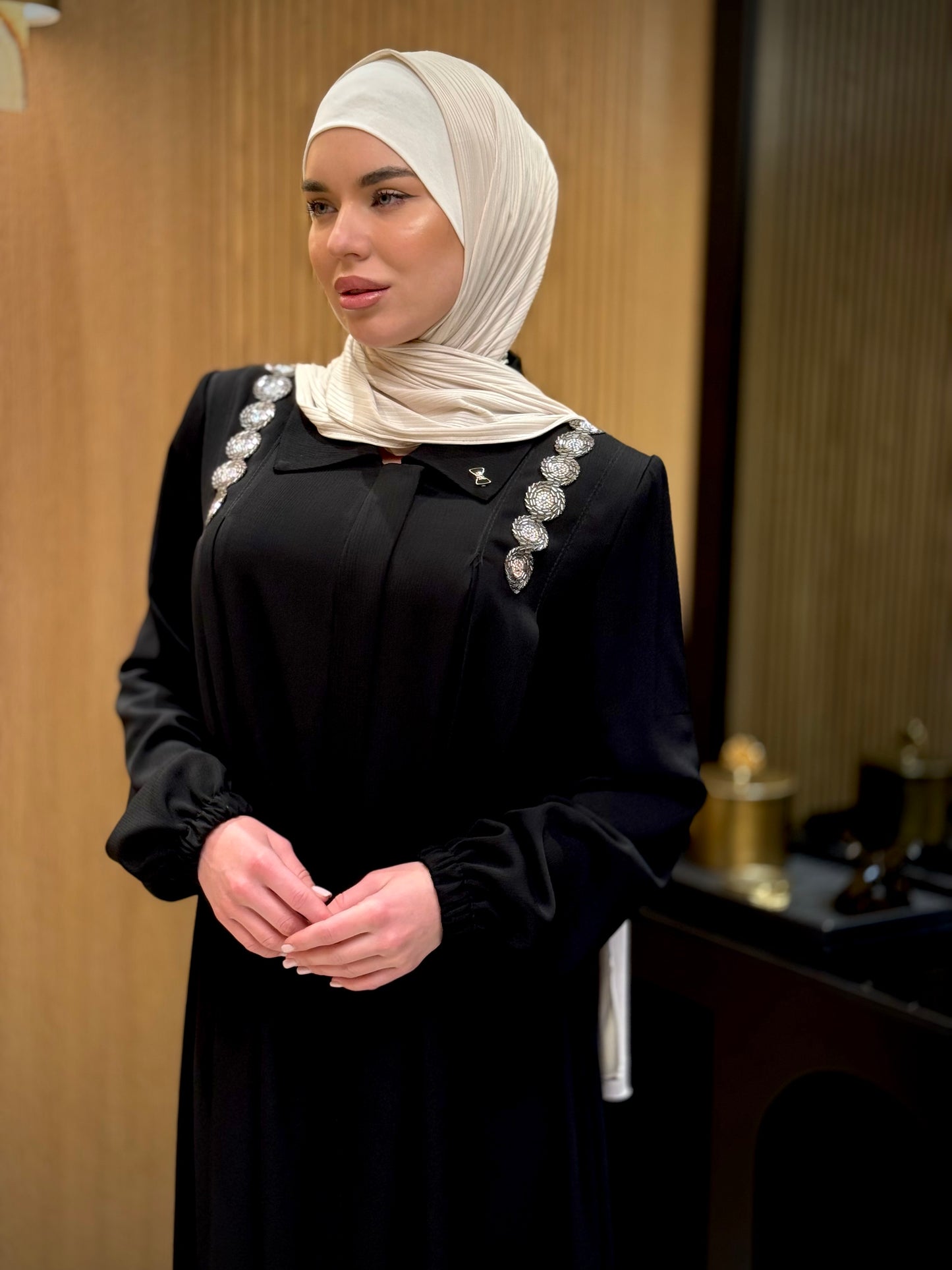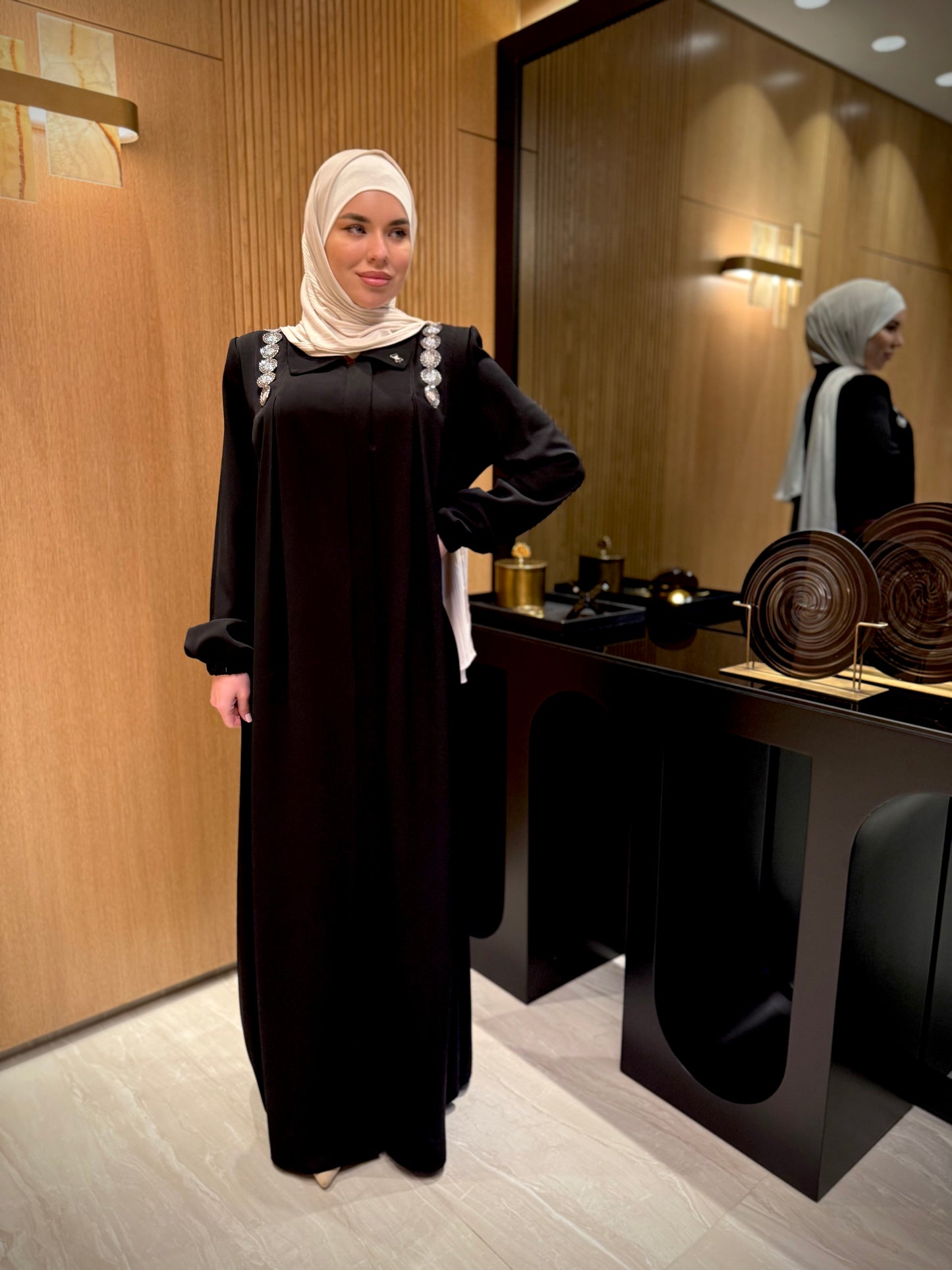 This practical abaya is beautifully adorned with simple, fringed shoulder details.